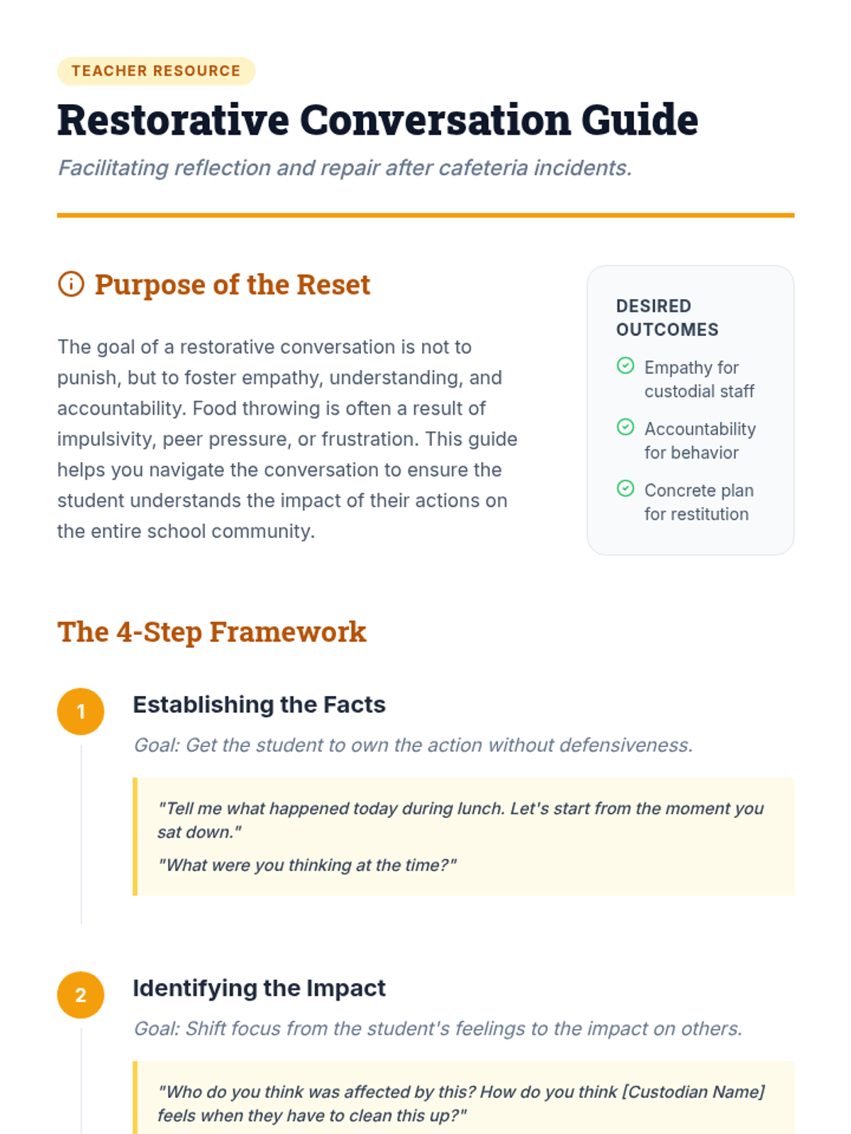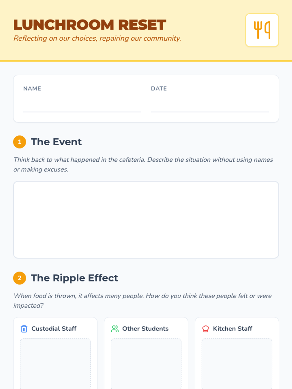 A restorative lesson designed to help students reflect on their behavior in the cafeteria, specifically focusing on the consequences of throwing food and developing empathy for those who maintain the school environment.