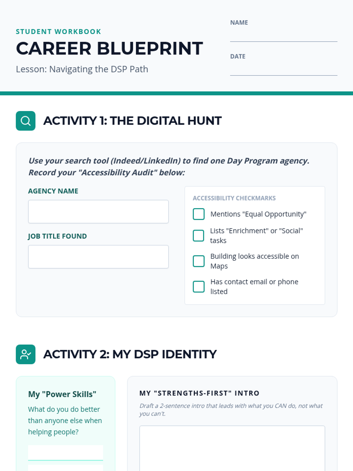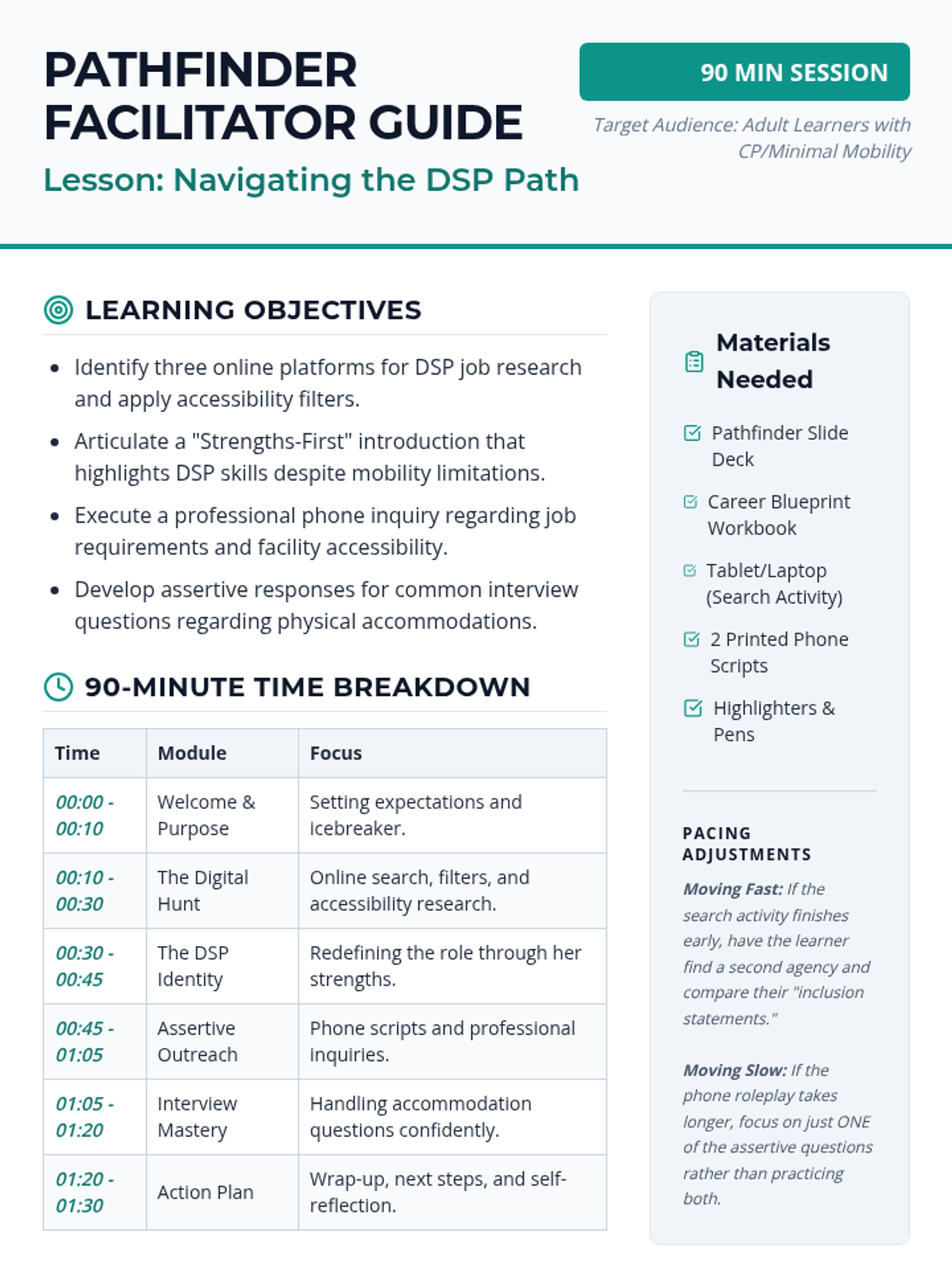 A 90-minute intensive training session focused on job research, professional communication, and self-advocacy specifically for individuals seeking Direct Support Professional (DSP) roles in day program settings.