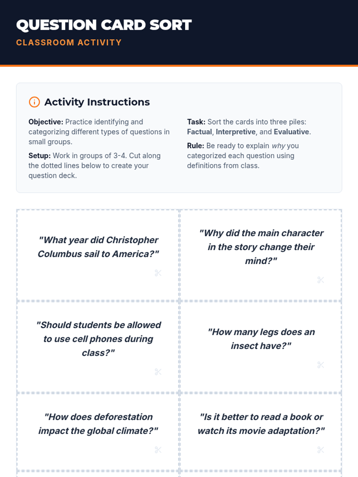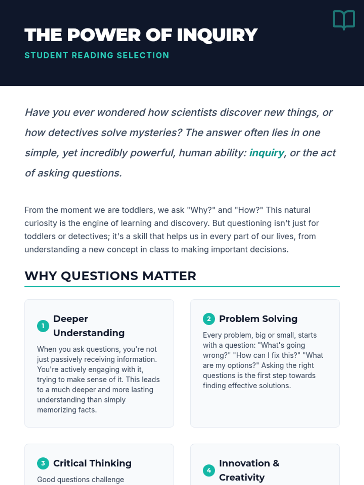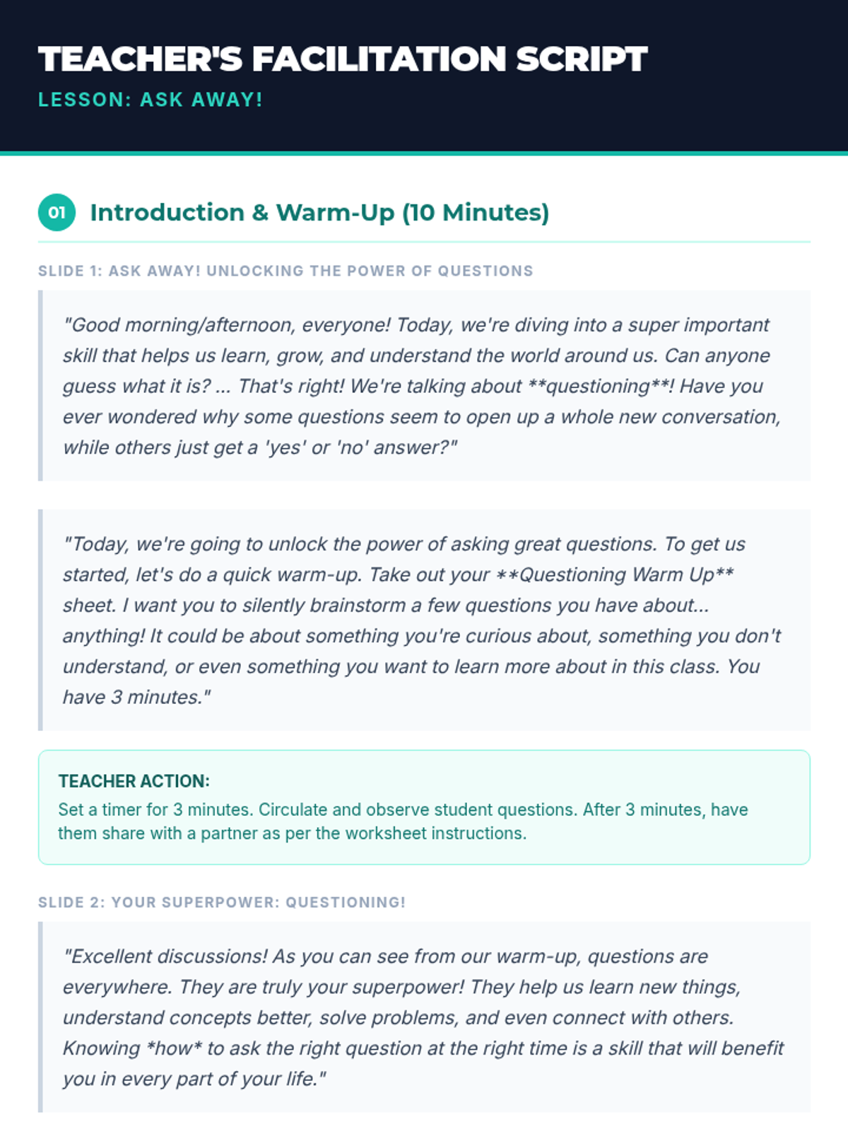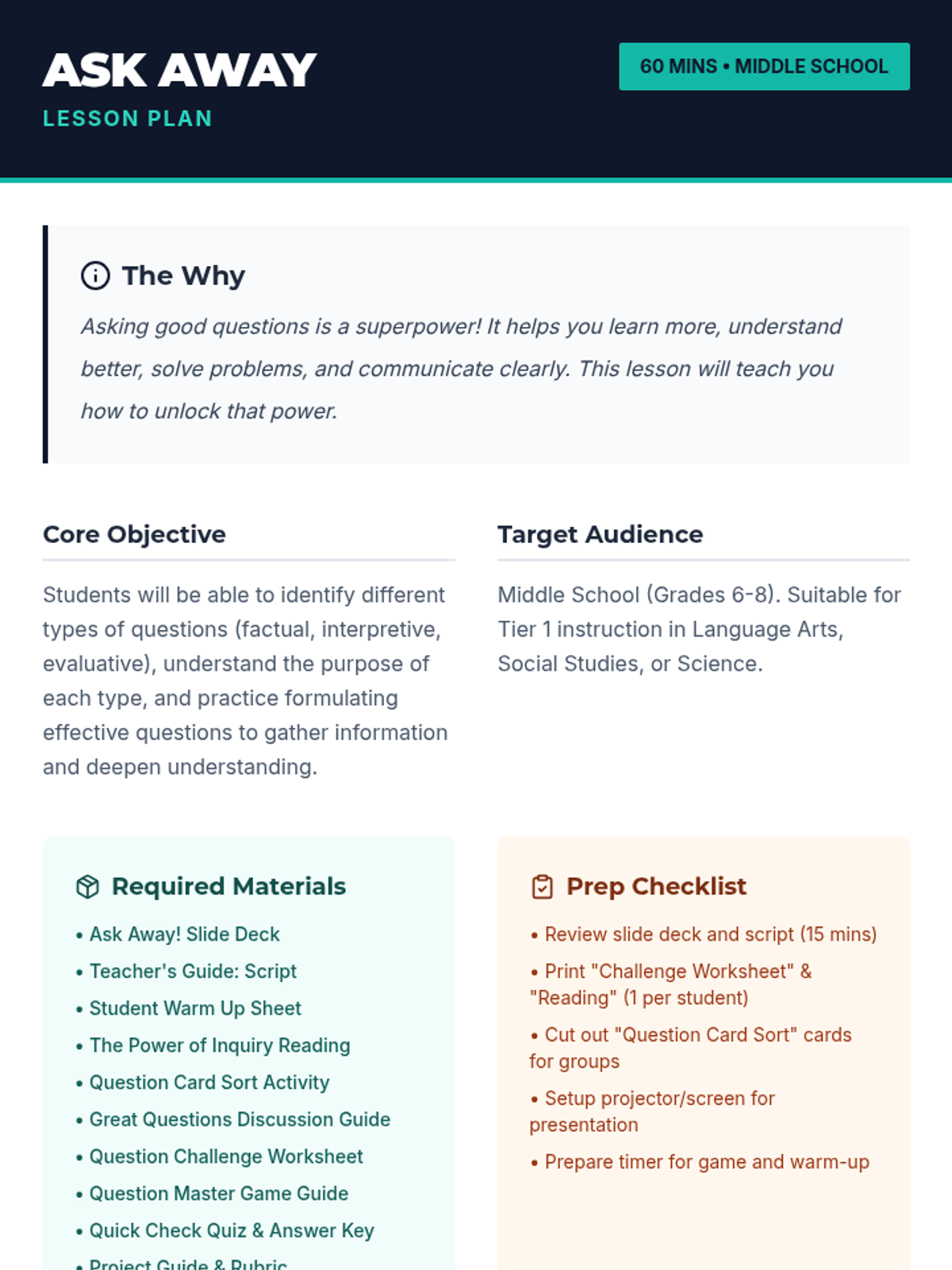 A 60-minute lesson for middle school students designed to teach the power of effective questioning. Students learn to identify and create factual, interpretive, and evaluative questions through interactive activities and guided practice.
