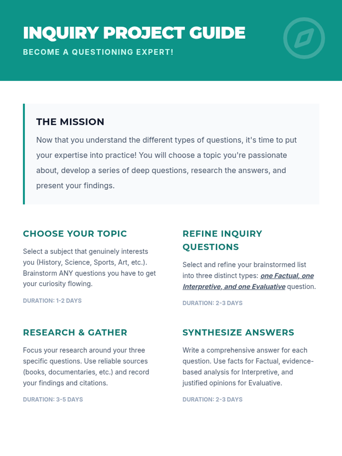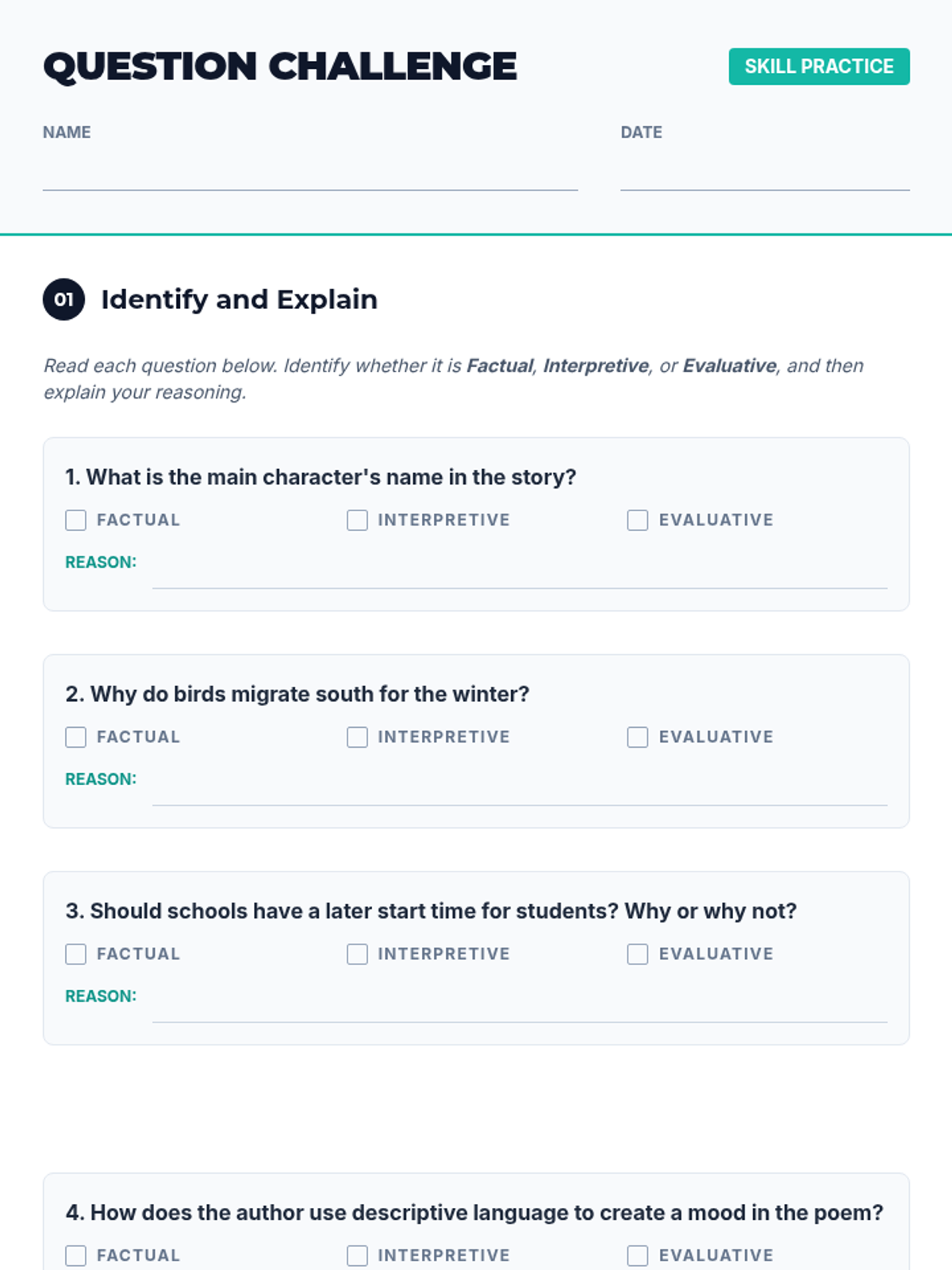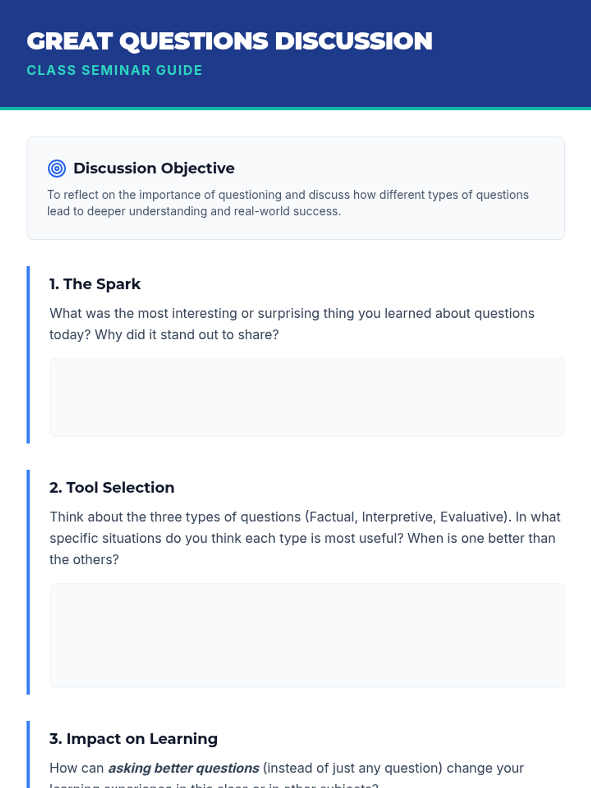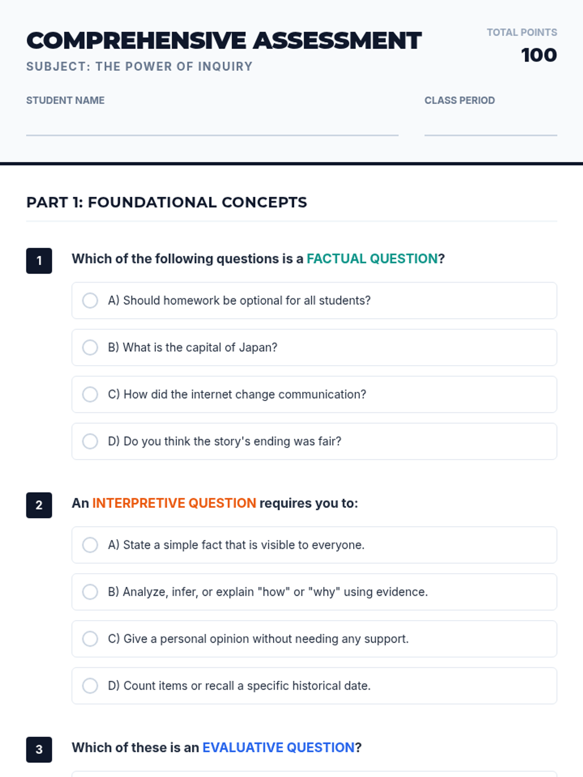 A 60-minute lesson for middle school students designed to teach the power of effective questioning. Students learn to identify and create factual, interpretive, and evaluative questions through interactive activities and guided practice.