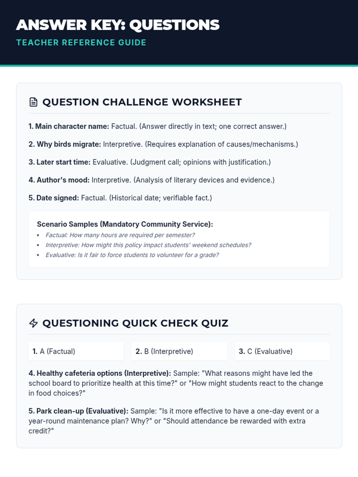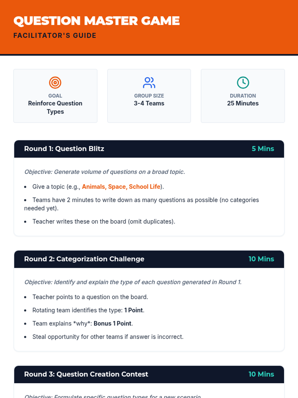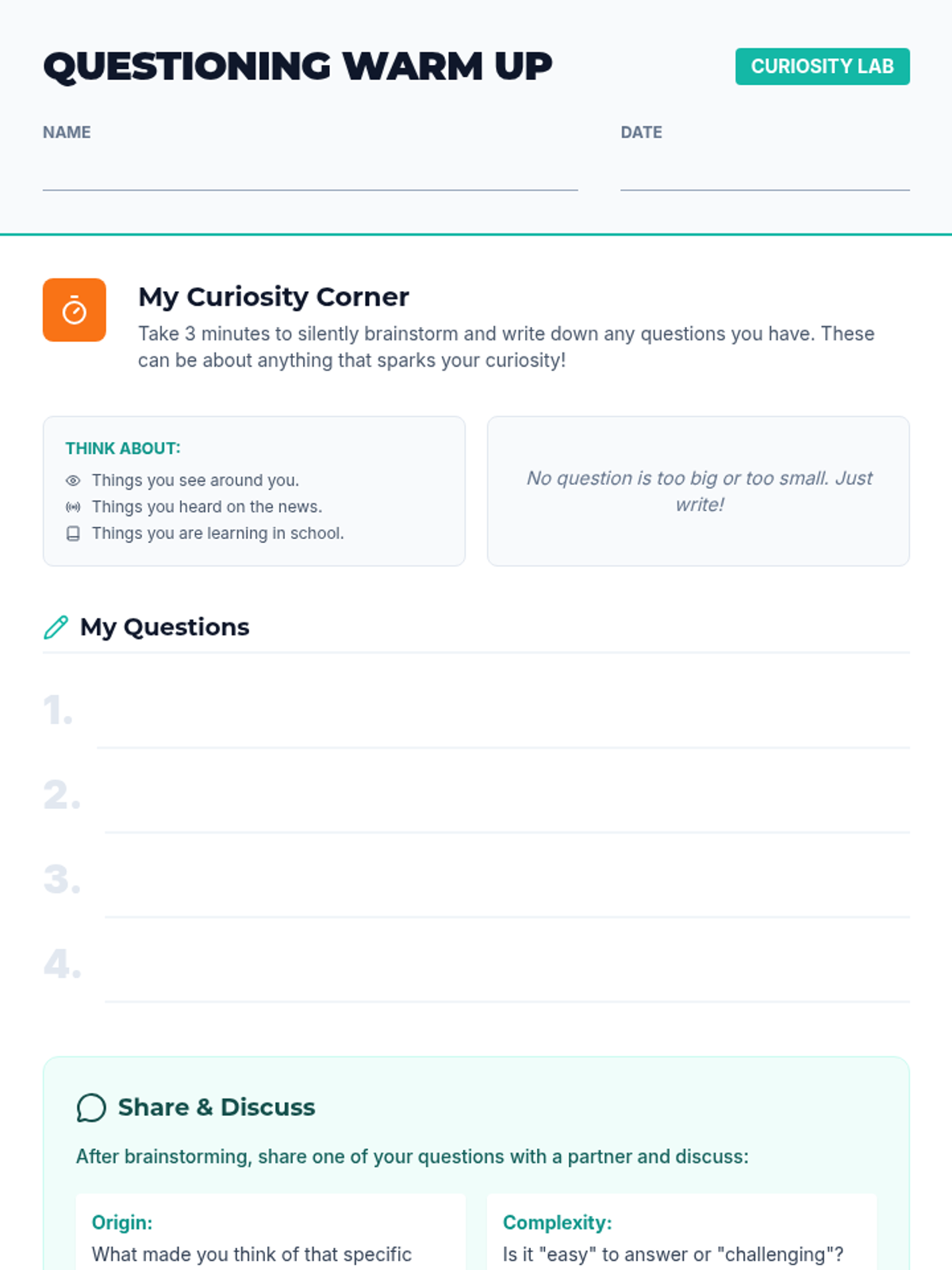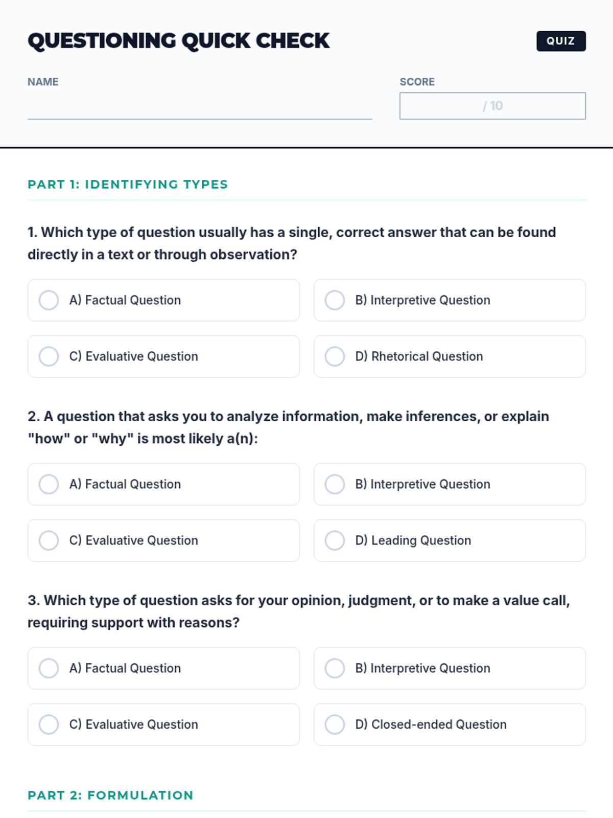 A 60-minute lesson for middle school students designed to teach the power of effective questioning. Students learn to identify and create factual, interpretive, and evaluative questions through interactive activities and guided practice.