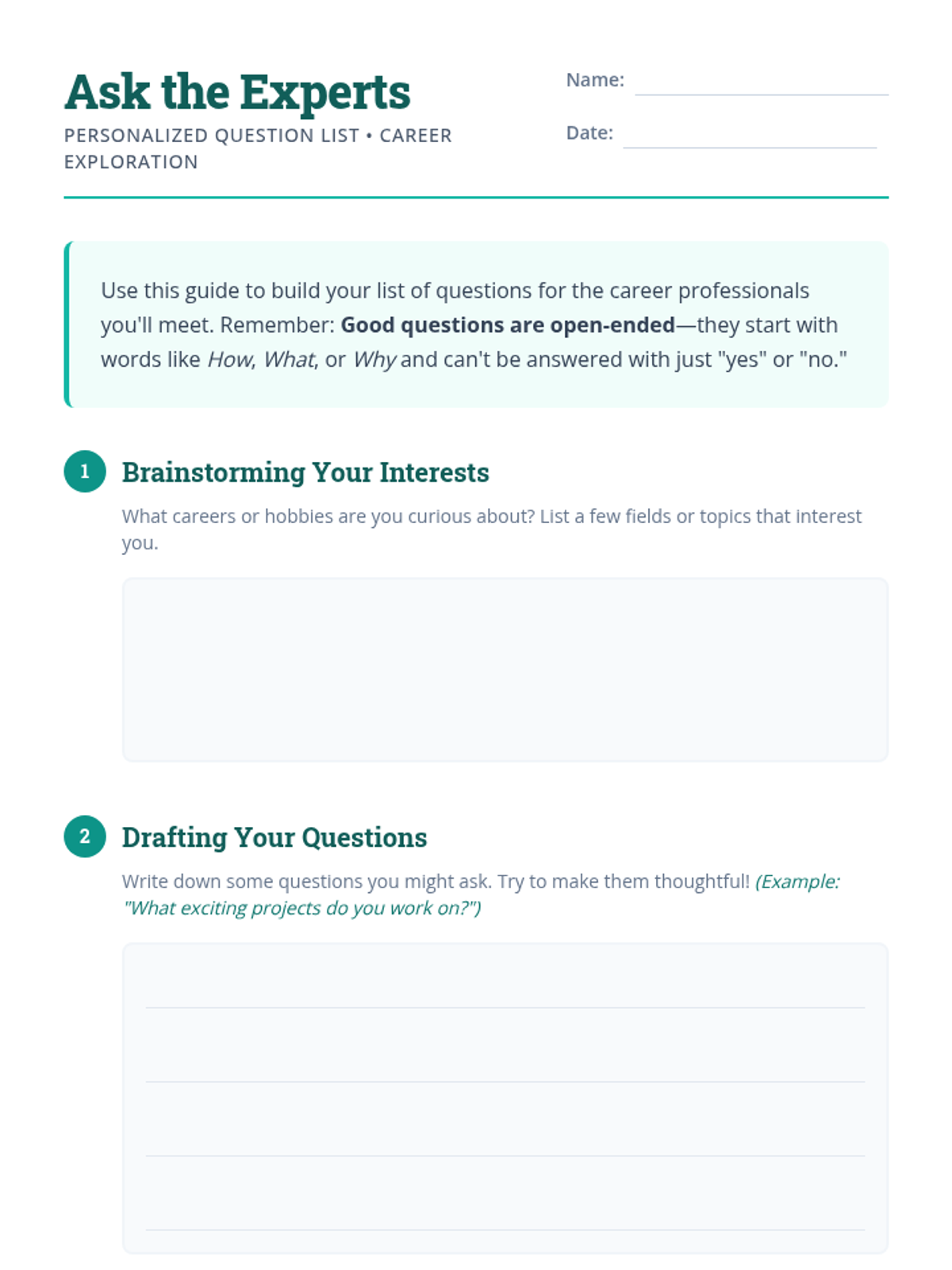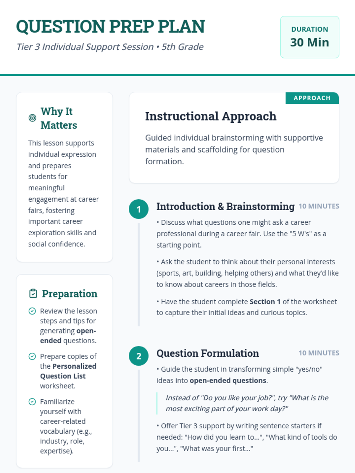 A 30-minute Tier 3 individual session designed to help 5th-grade students develop personalized, open-ended questions for career professionals. This lesson focuses on boosting communication confidence and tailoring exploration to individual student interests before a career fair.