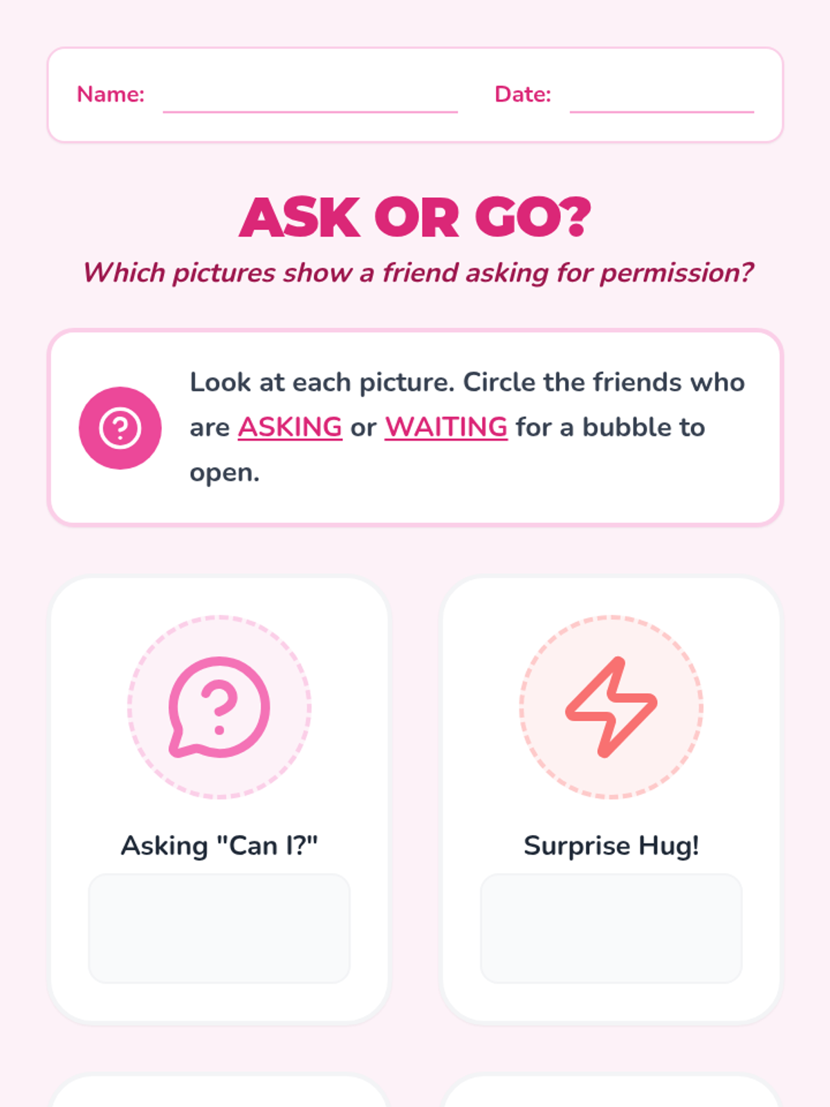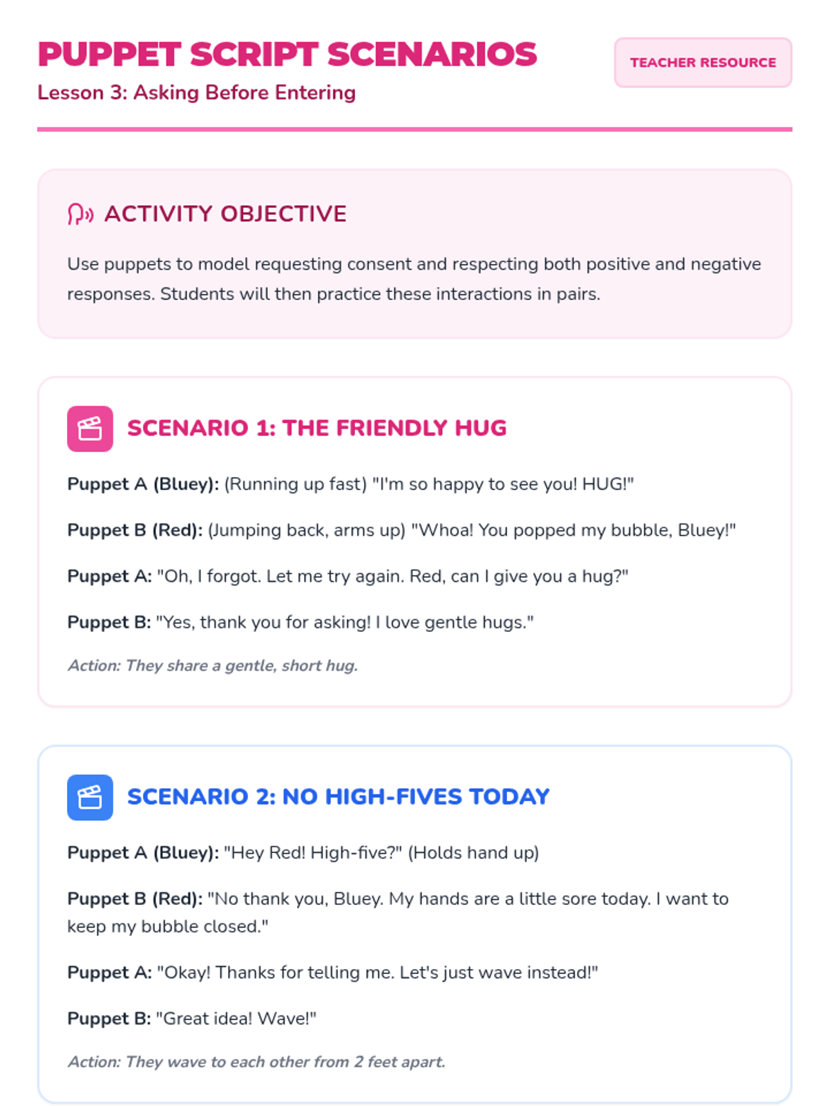 Students use puppets and role-play to practice asking for permission before entering someone else's space for a high-five or hug. The lesson distinguishes between welcome touch and unwanted touch by focusing on the power of asking 'Can I...?'