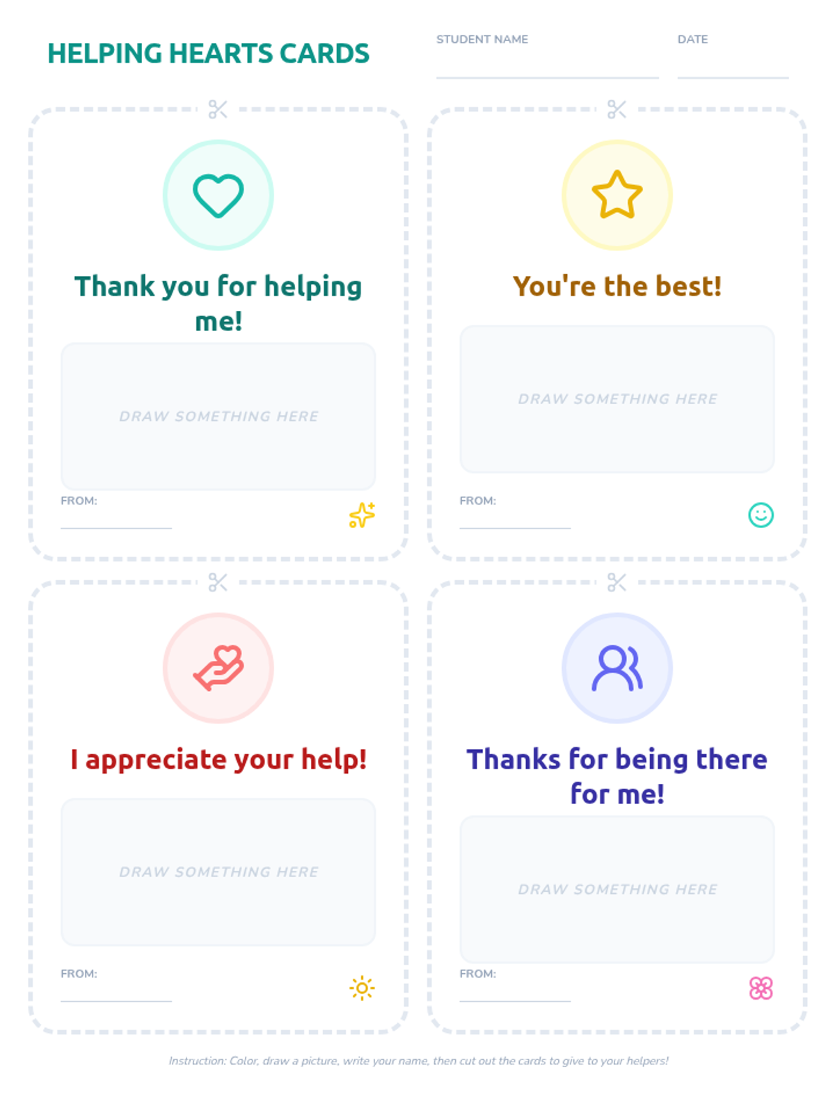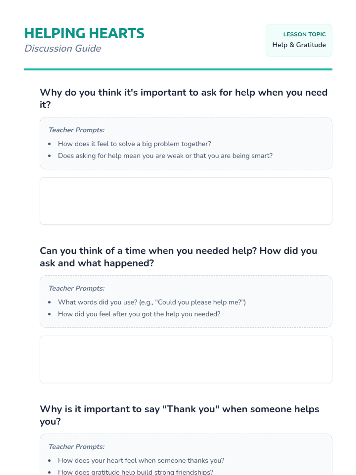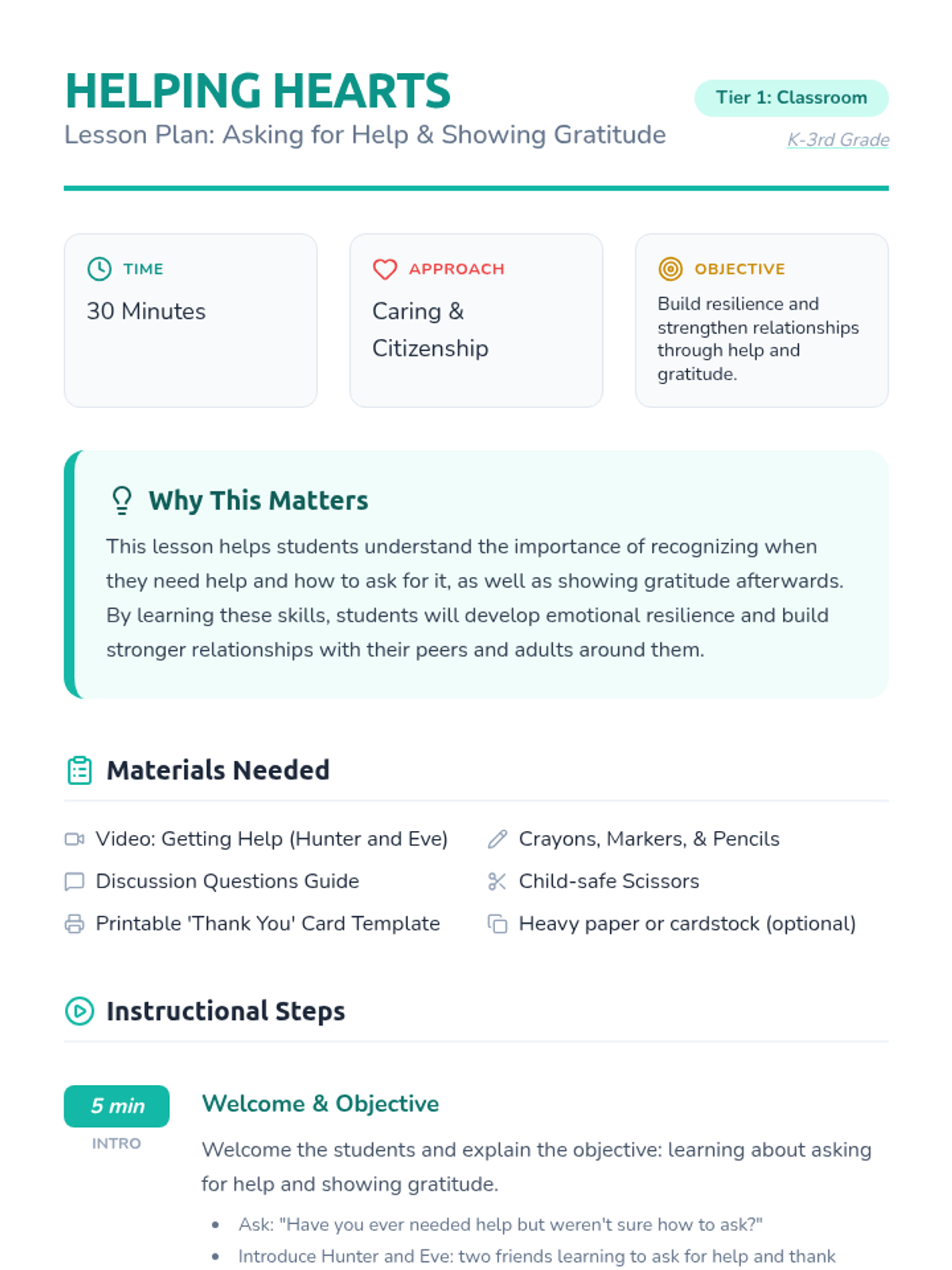 A lesson for K-3 students focused on identifying when help is needed, how to ask for it politely, and the importance of expressing gratitude to those who assist us.