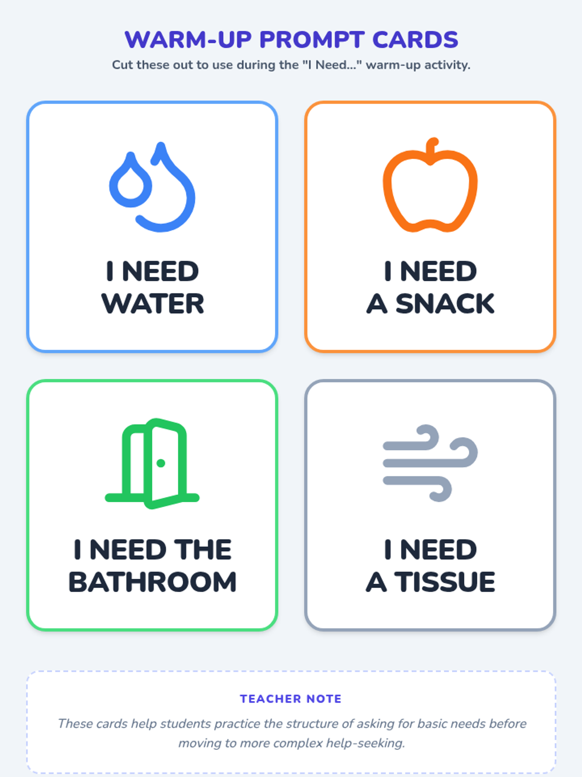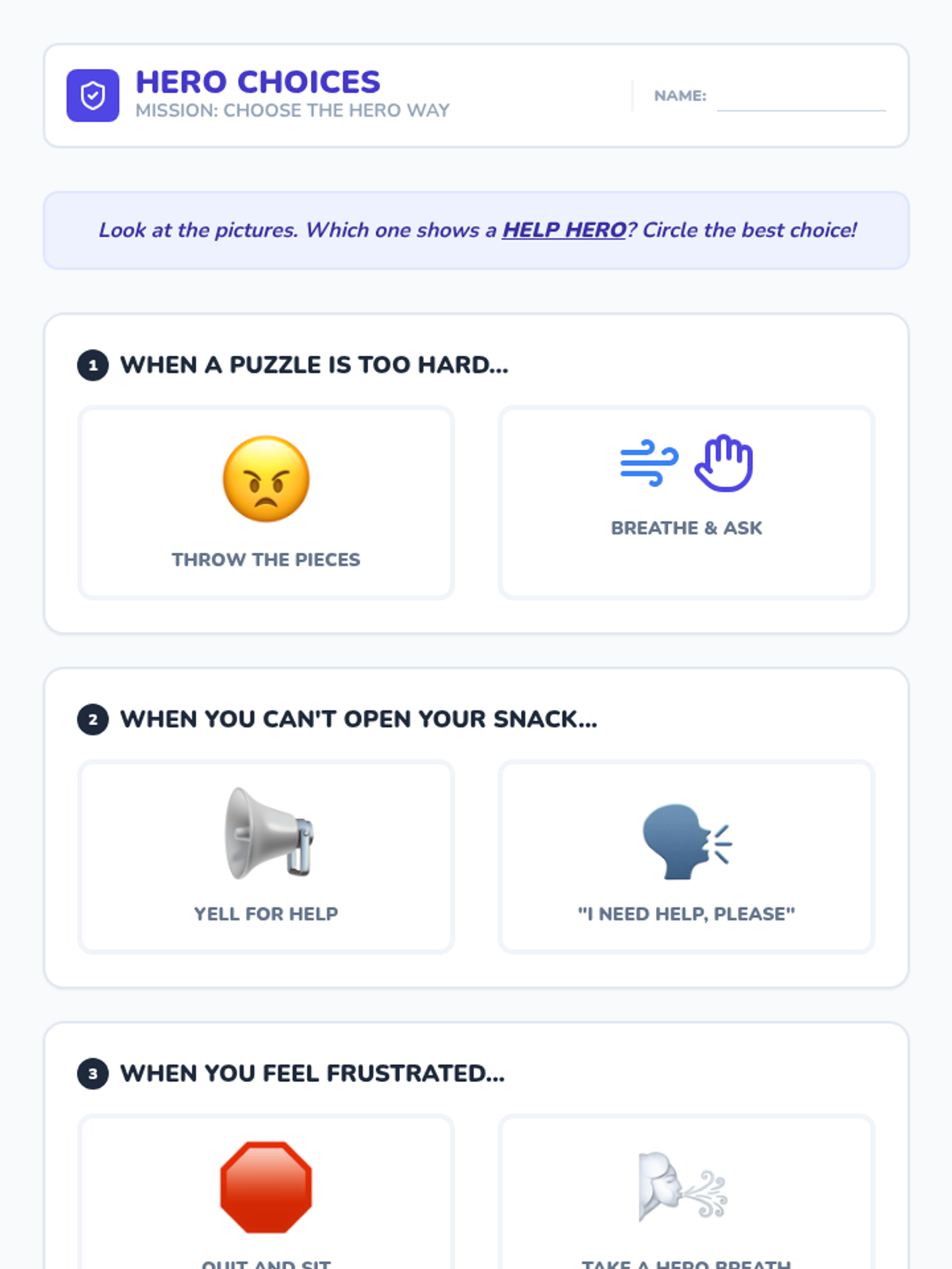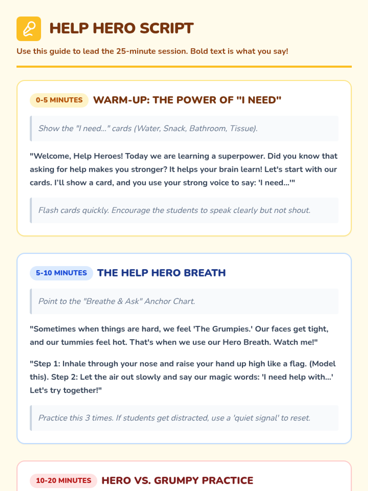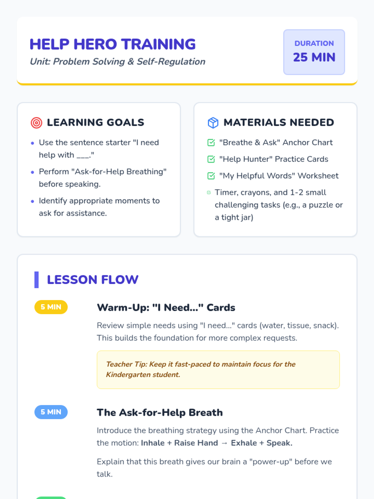 A social-emotional learning lesson designed for K-1 students to teach effective communication when facing challenges. It introduces the 'Ask-for-Help Breathing' strategy and uses role-play and sentence starters to build confidence and reduce frustration.