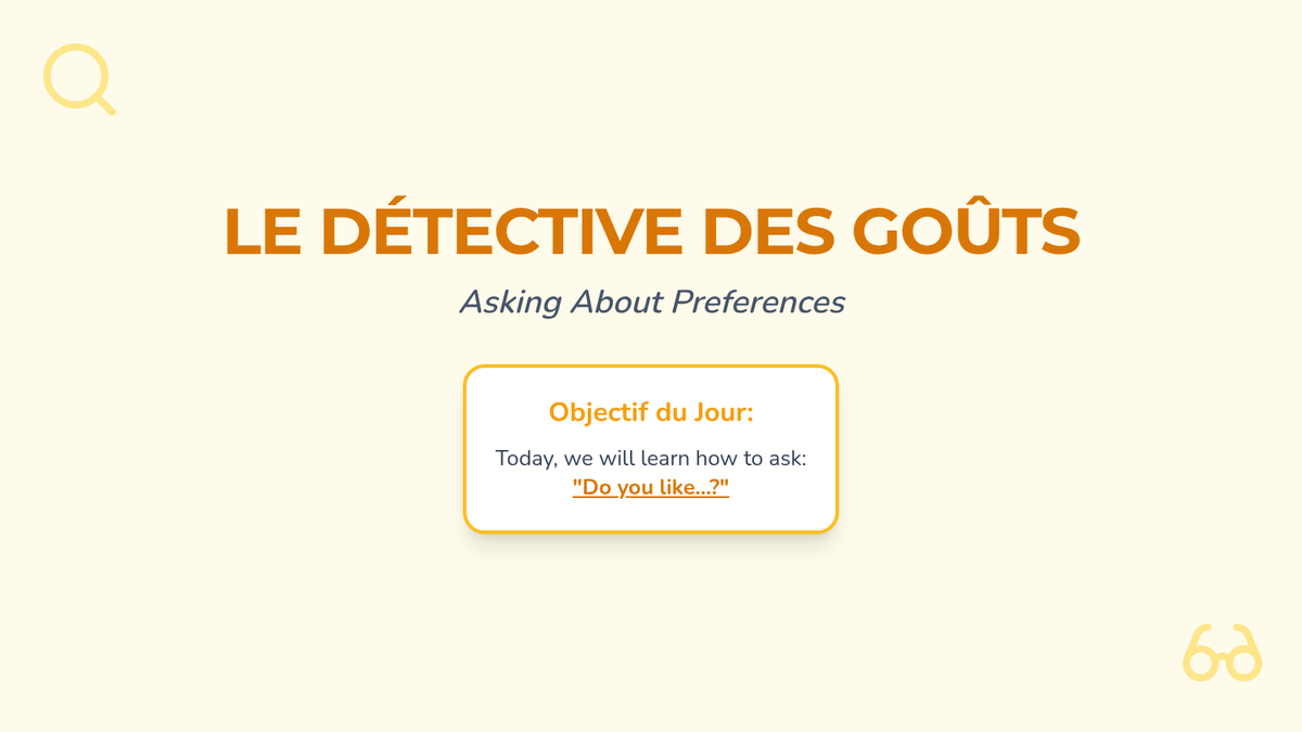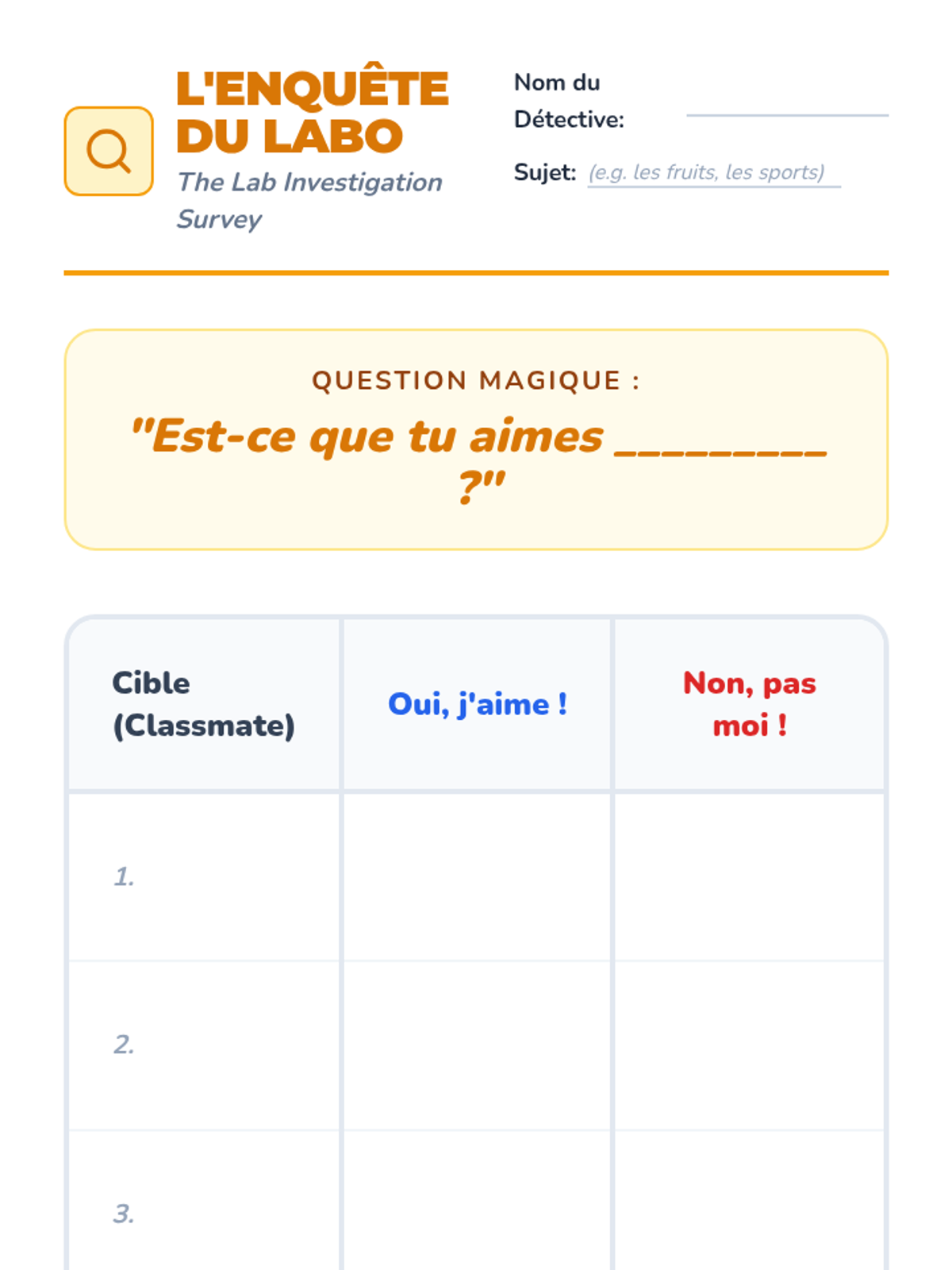 Students learn to ask 'Est-ce que tu aimes...?' and conduct a classroom survey to investigate their classmates' favorite things.