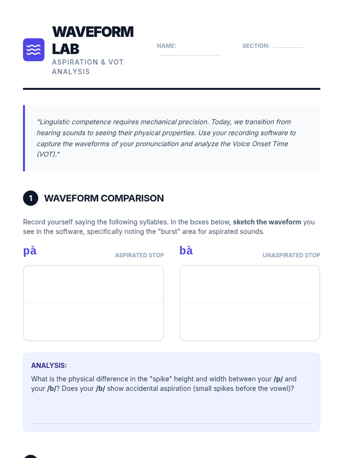 Students analyze Voice Onset Time (VOT) and aspiration, comparing Mandarin initials to English counterparts using waveform visualization.
