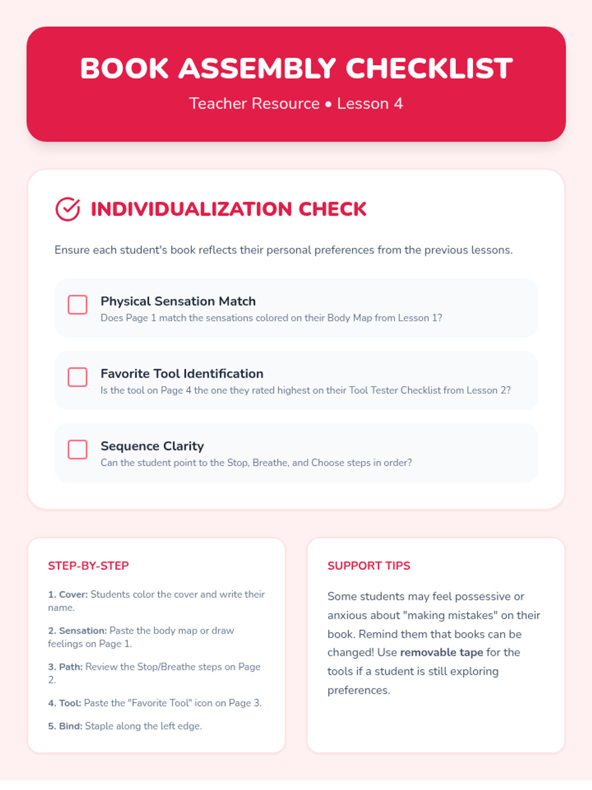 Students assemble their personalized booklets by selecting their specific triggers and preferred calming strategies. This creates a tangible tool tailored to their individual needs.