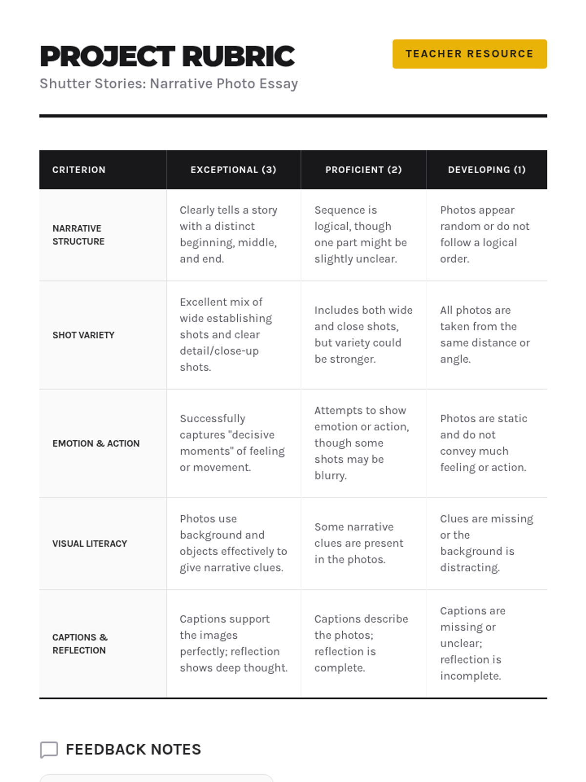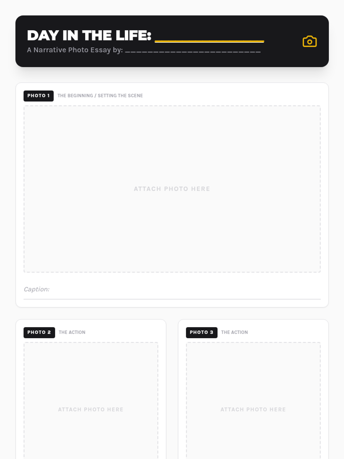 Students select, arrange, and caption their final five photos to present a coherent 'Day in the Life' essay.