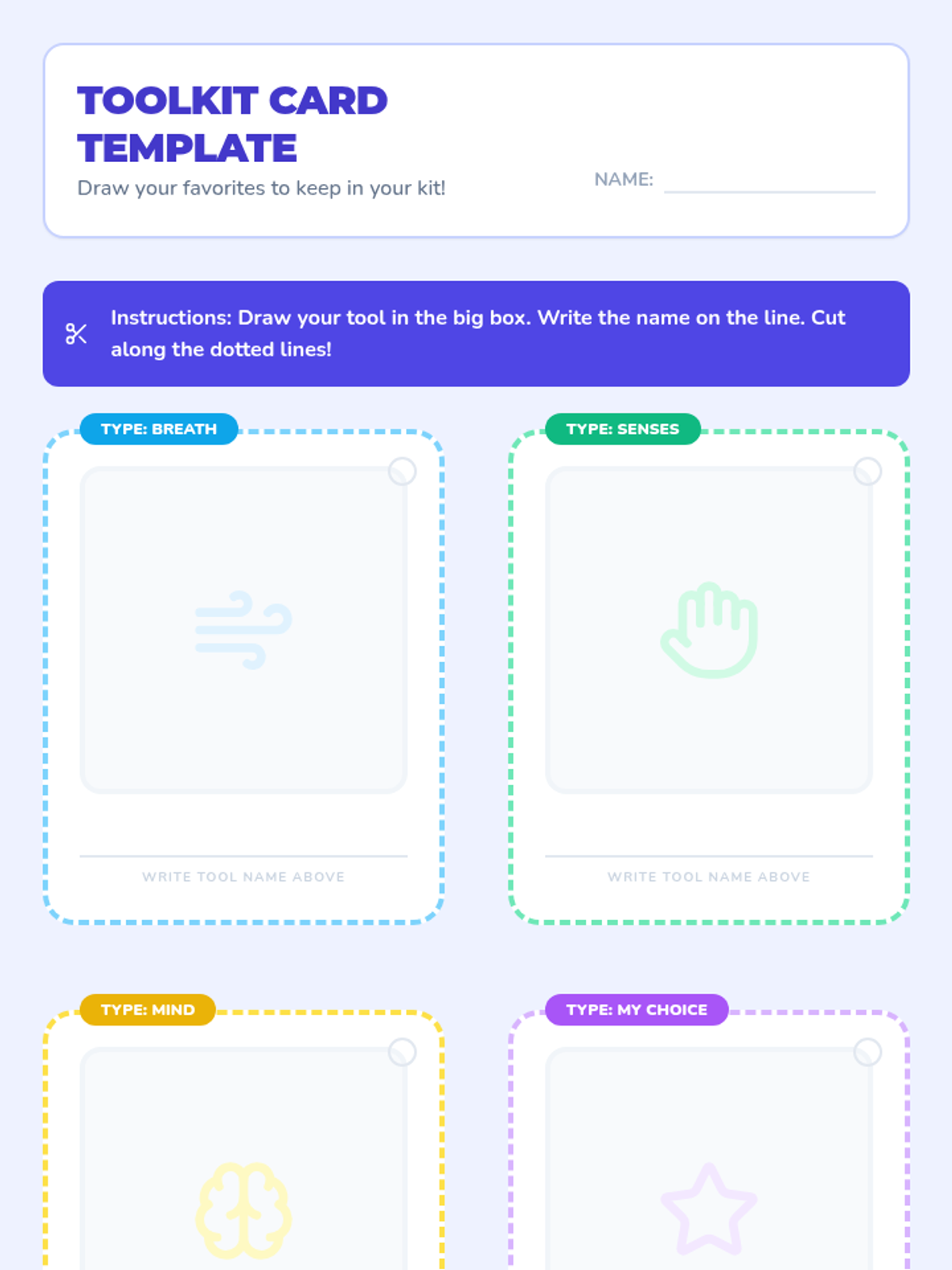 Students compile their favorite strategies into a small flip-book or card ring. They draw icons representing 'Breath,' 'Senses,' and 'Mind Games' so they can easily remember what to do.