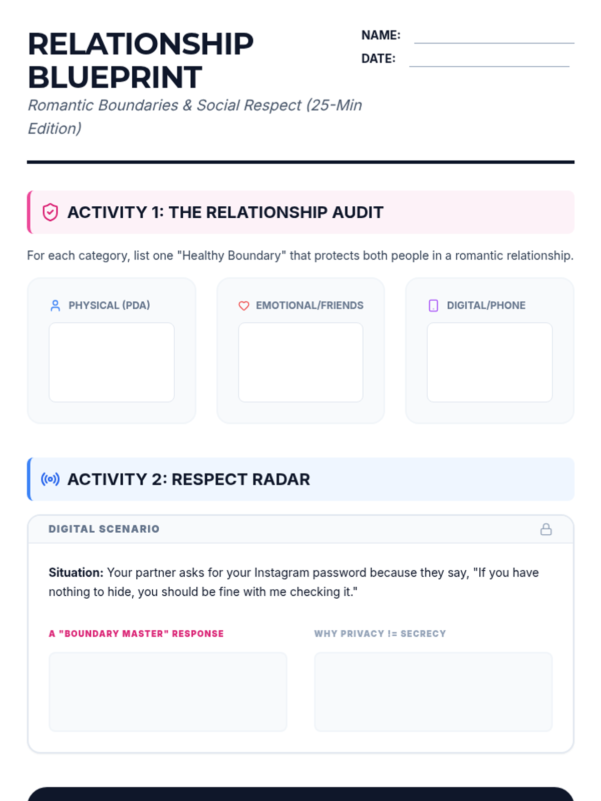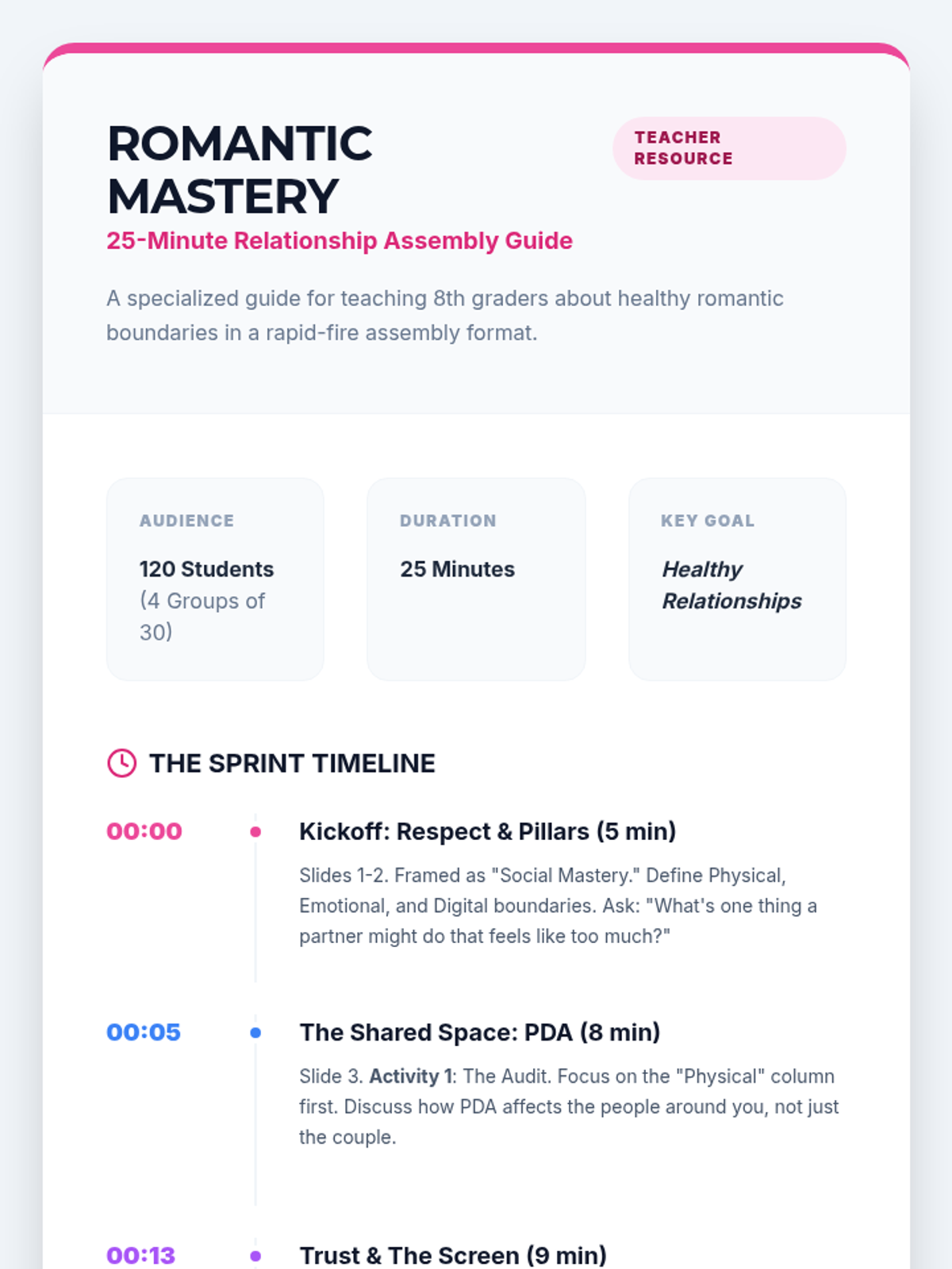 A lesson designed for 8th graders to understand and practice physical and emotional boundaries during large group gatherings like school assemblies. Includes activities for managing personal space and practicing respectful communication in a crowd.