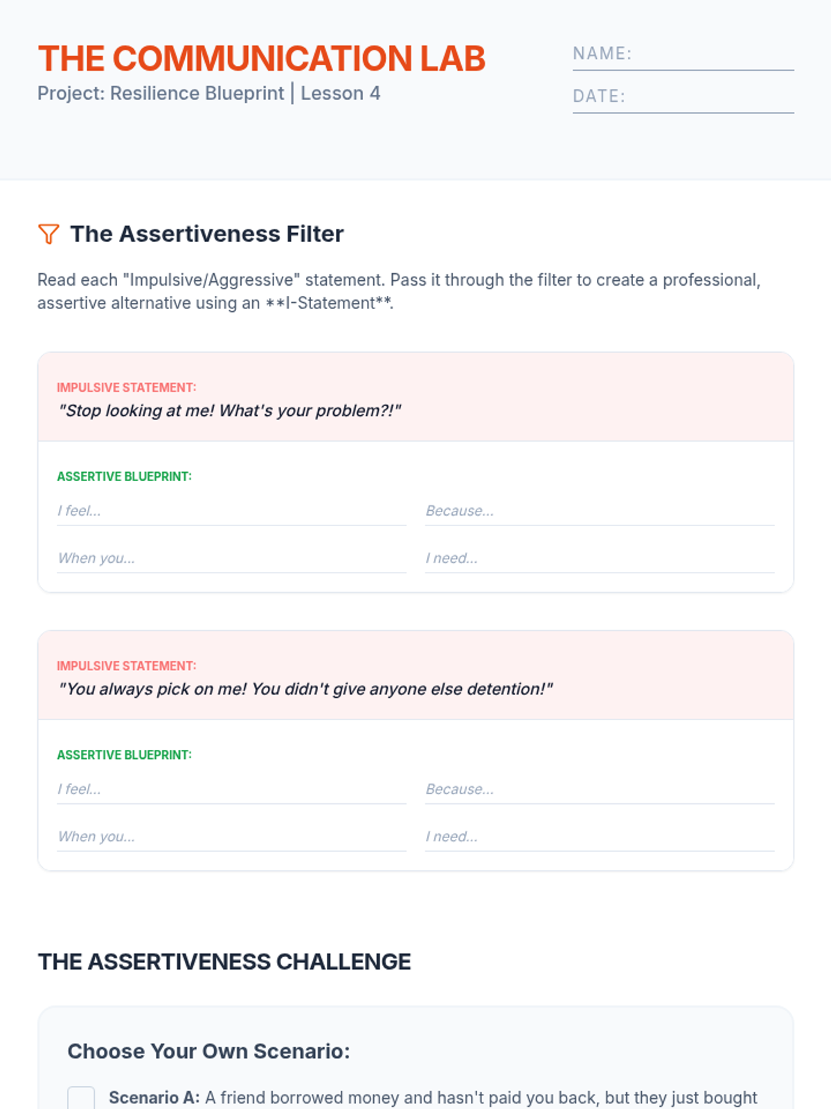 Students distinguish between passive, aggressive, and assertive communication. They practice using 'I statements' to express frustration without attacking others.