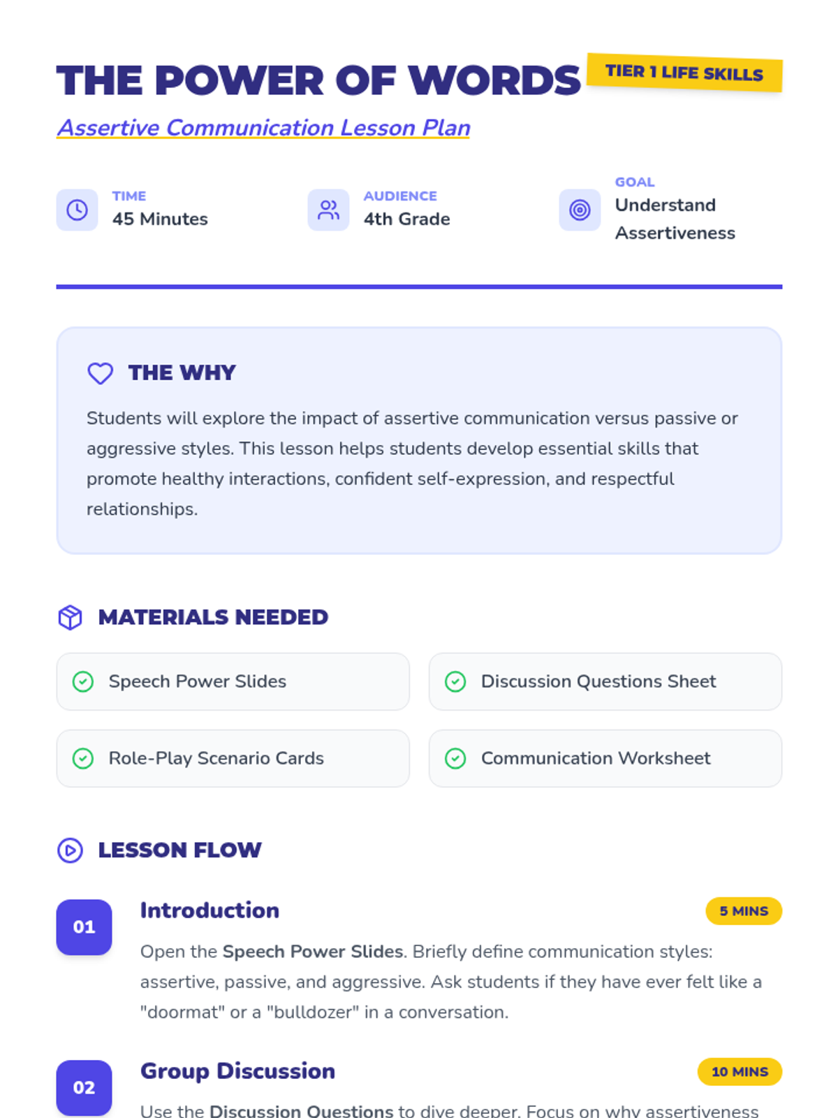 Teaches the practical skill of using "I-statements" to communicate feelings and needs effectively without blame.