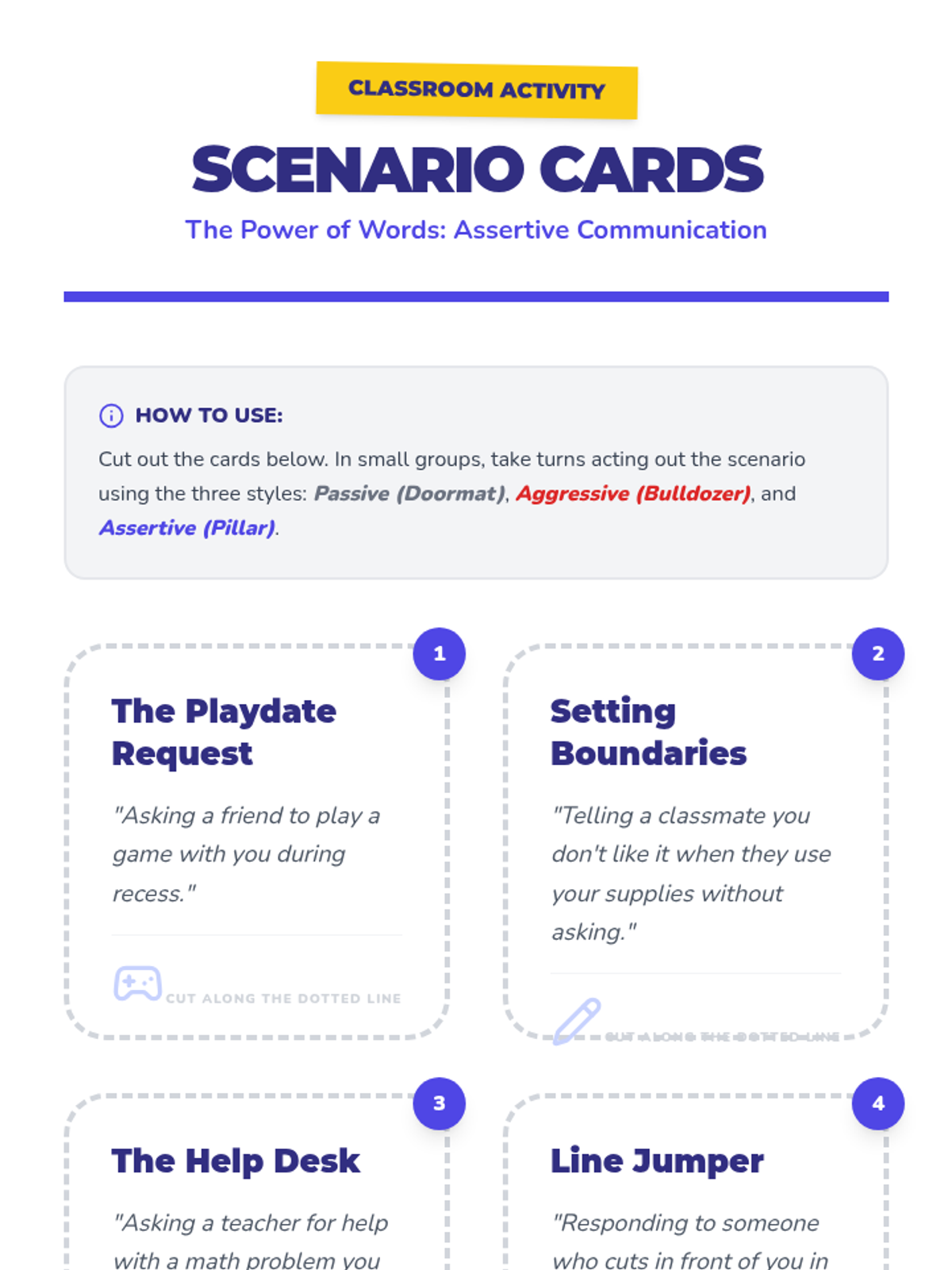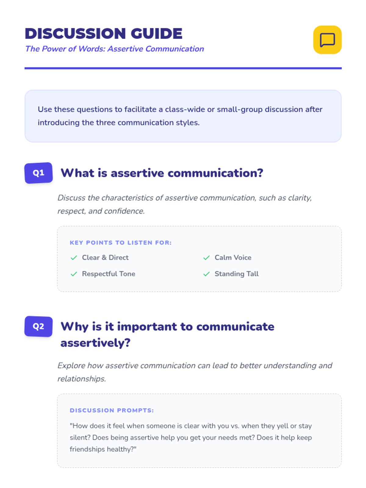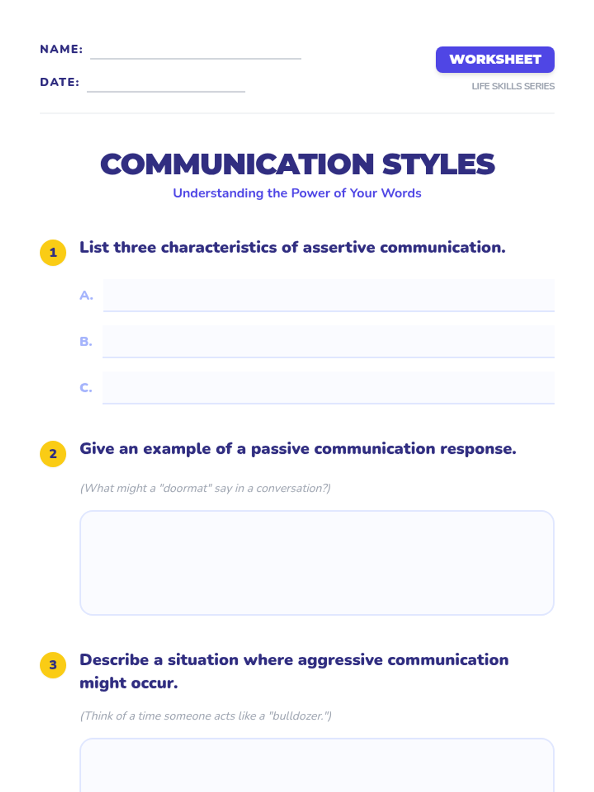 Students explore the impact of assertive, passive, and aggressive communication styles through role-play and discussion, learning techniques to express themselves confidently and respectfully.