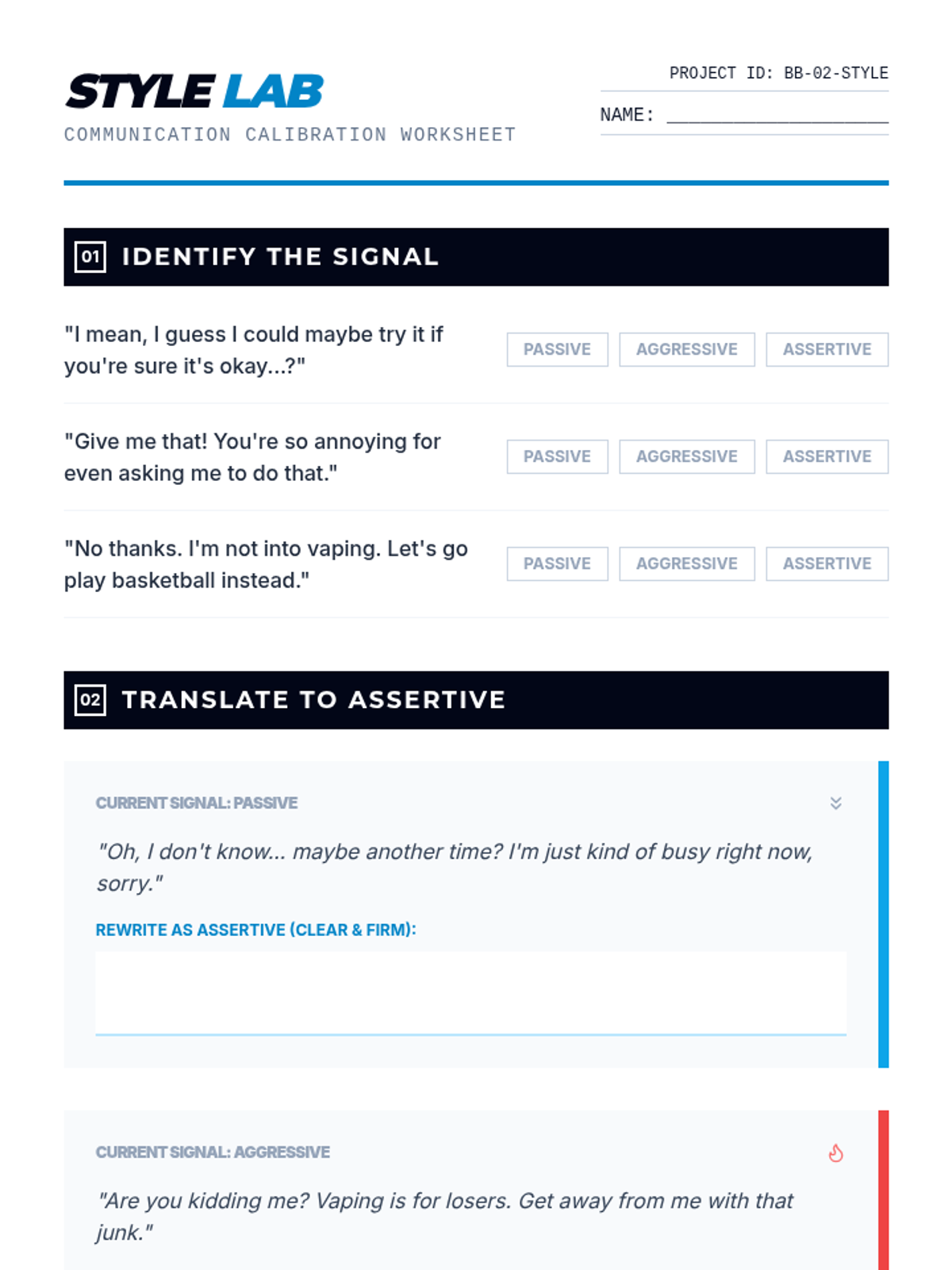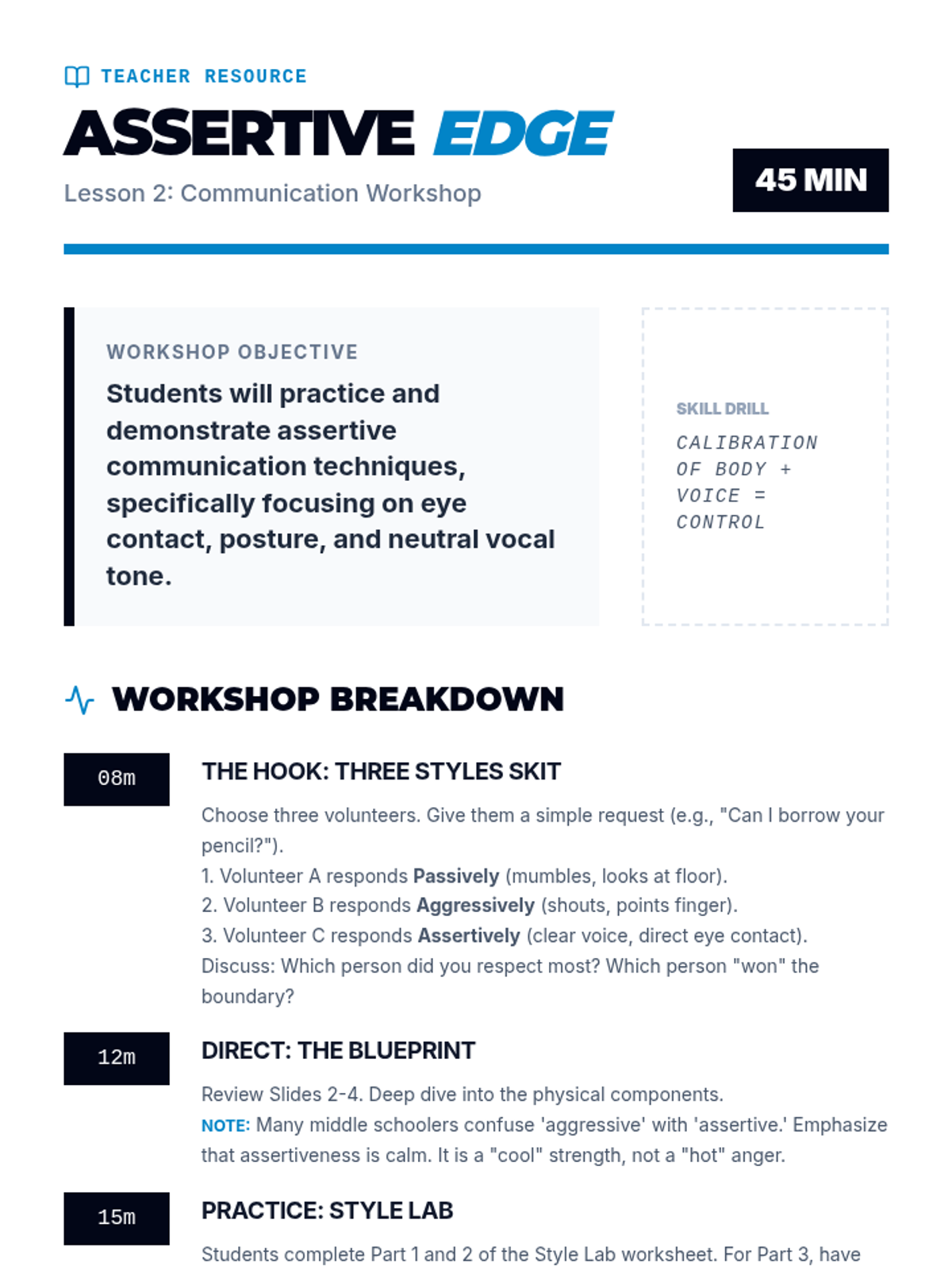 This workshop-style lesson focuses on the physical and vocal components of assertive communication, contrasting it with passive and aggressive styles.