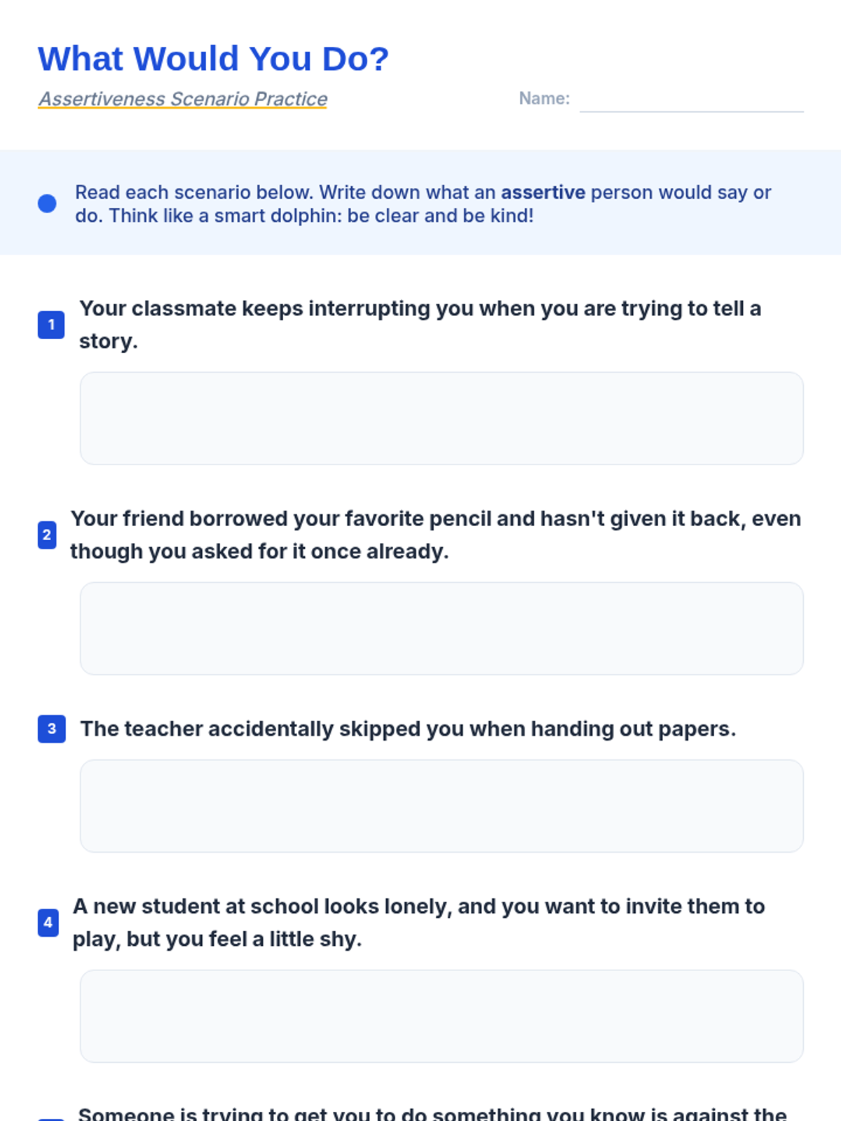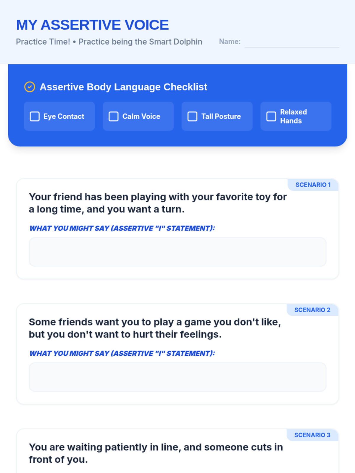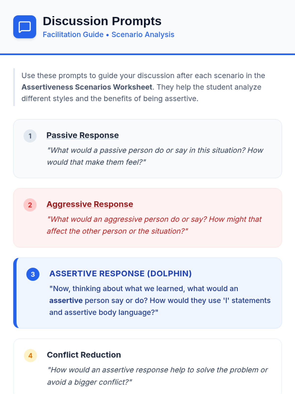 A 30-minute Tier 3 individual lesson for 4th graders to learn and practice assertive communication skills using the 'dolphin' approach to reduce conflict and build confidence.