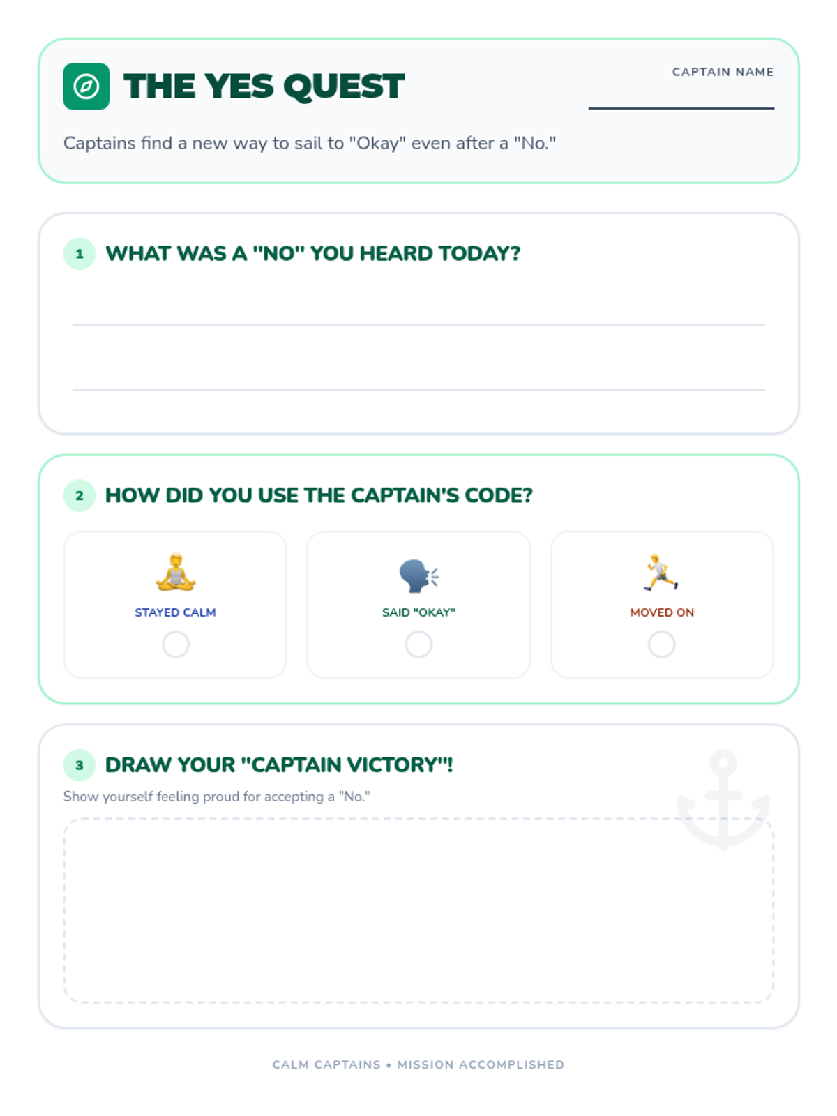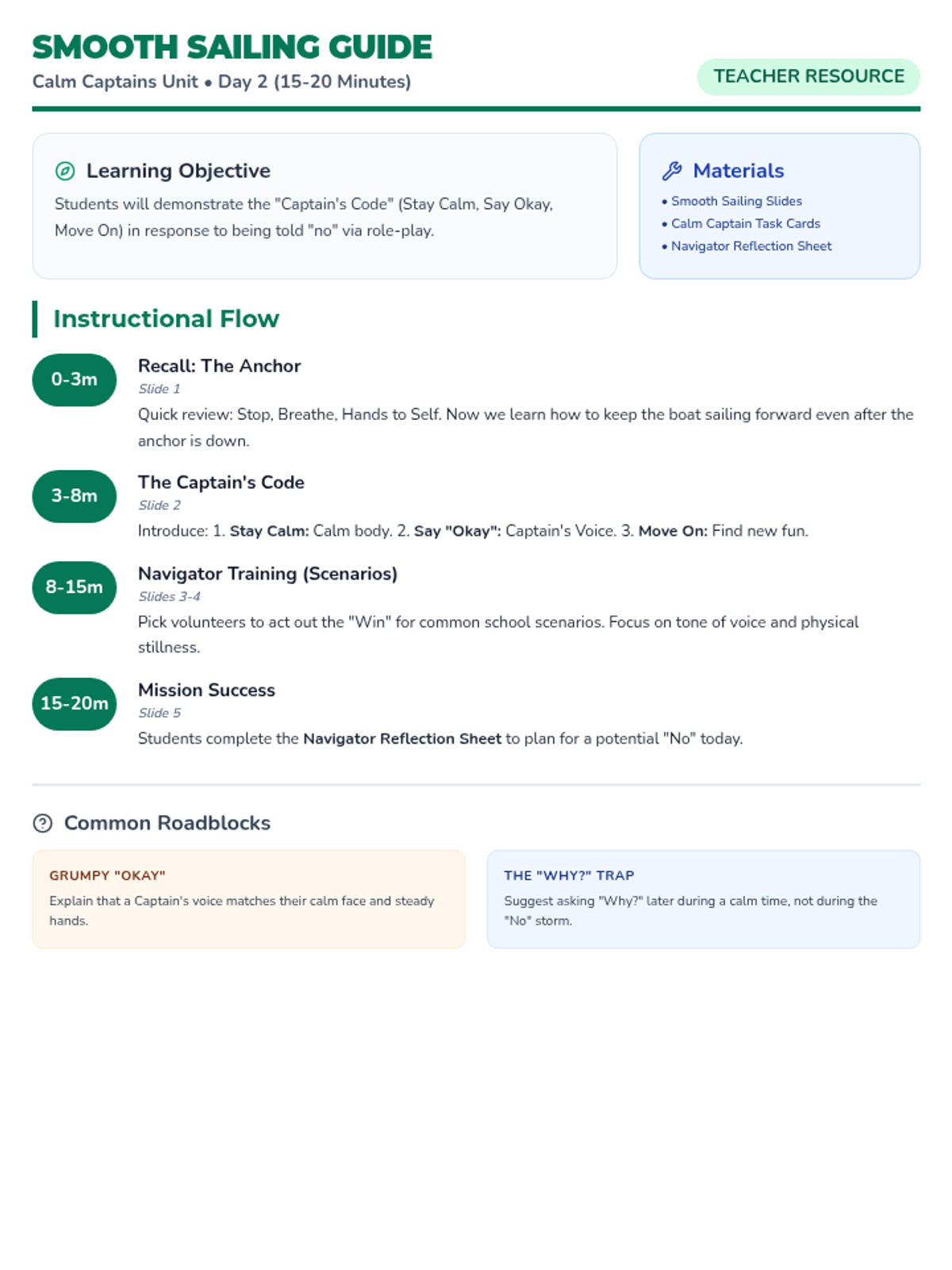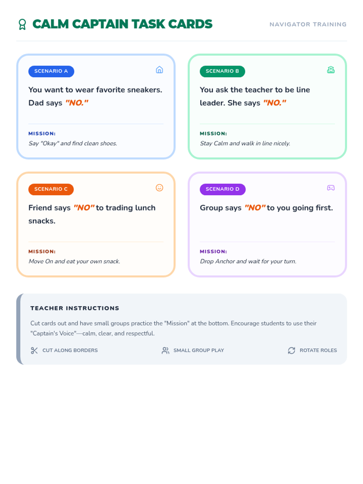 Students practice three specific strategies for accepting "no" (Stay Calm, Say Okay, Move On) through role-play and reflective activities.