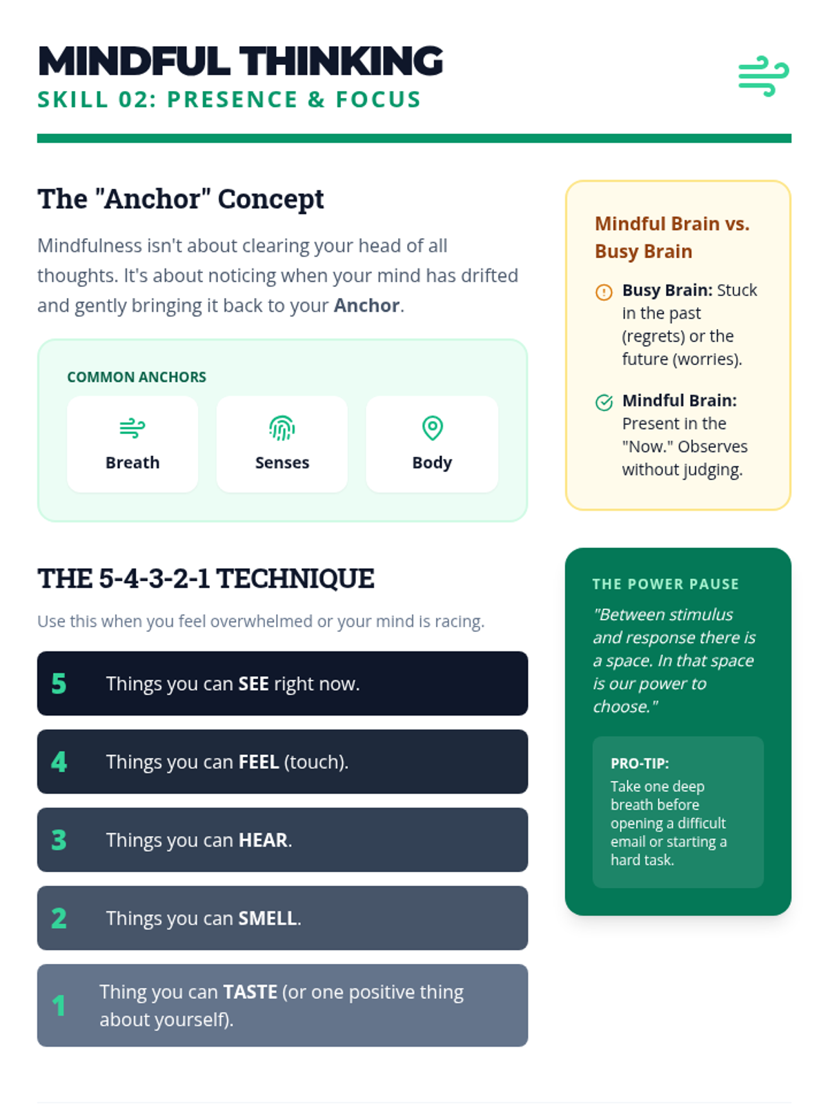 Introduces mindfulness techniques and intentional thinking to help students stay present and focused.