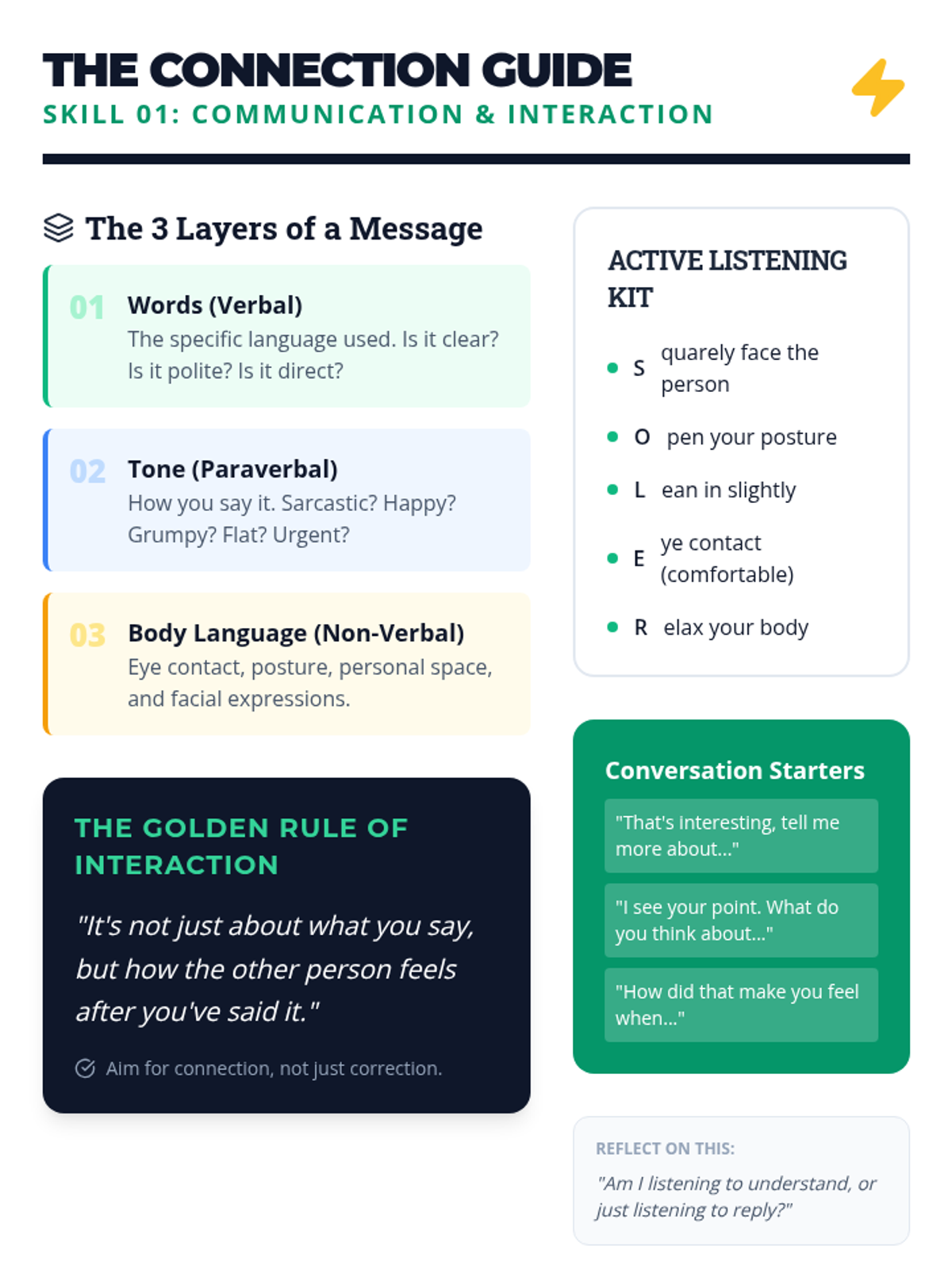 Focuses on verbal and non-verbal cues, active listening, and effective interaction strategies to build positive relationships.