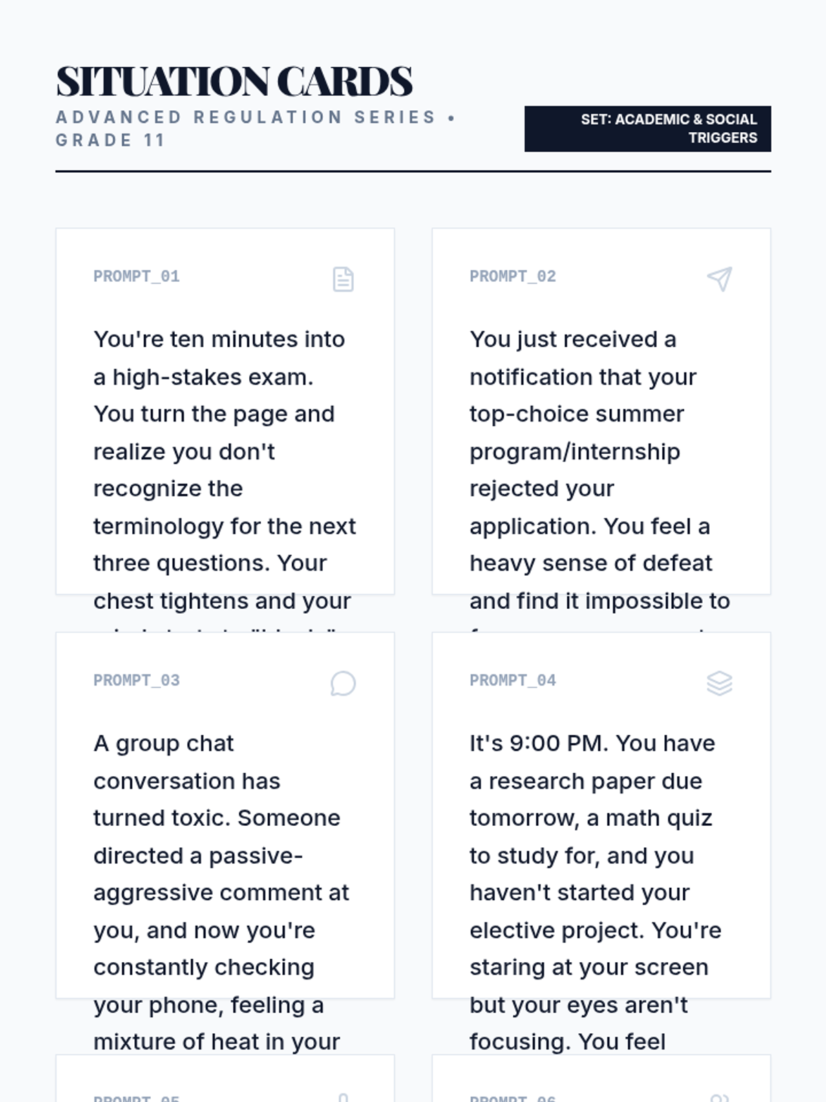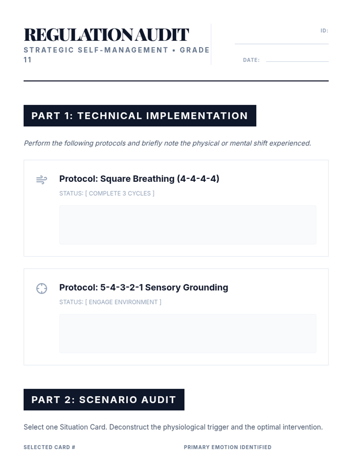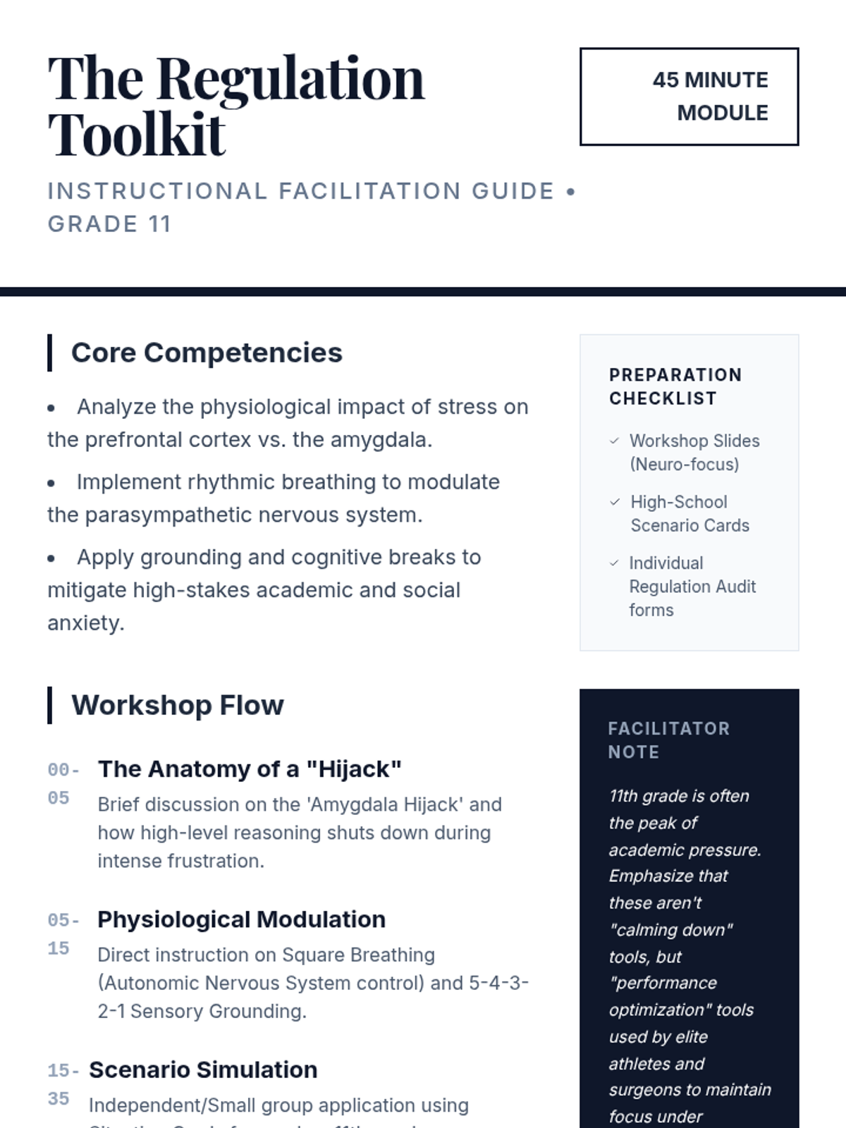 A 45-minute workshop designed for 11th-grade students to master advanced emotional regulation techniques, specifically physiological grounding, rhythmic breathing, and cognitive breaks for managing academic and social stressors.