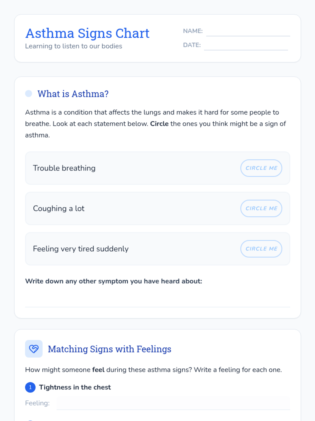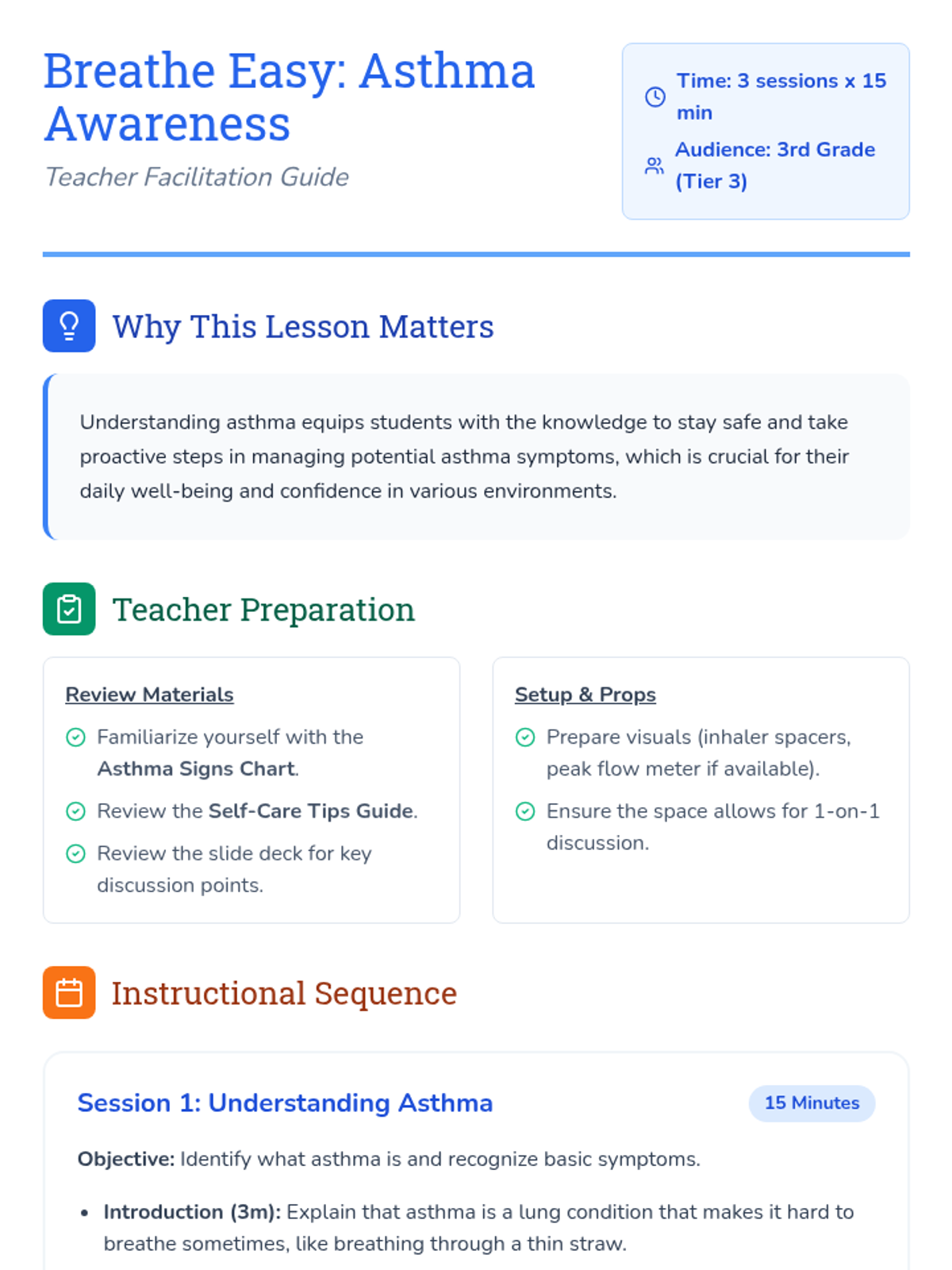 A 3-session individual support lesson for 3rd graders to understand asthma, recognize triggers, and learn self-care management strategies.