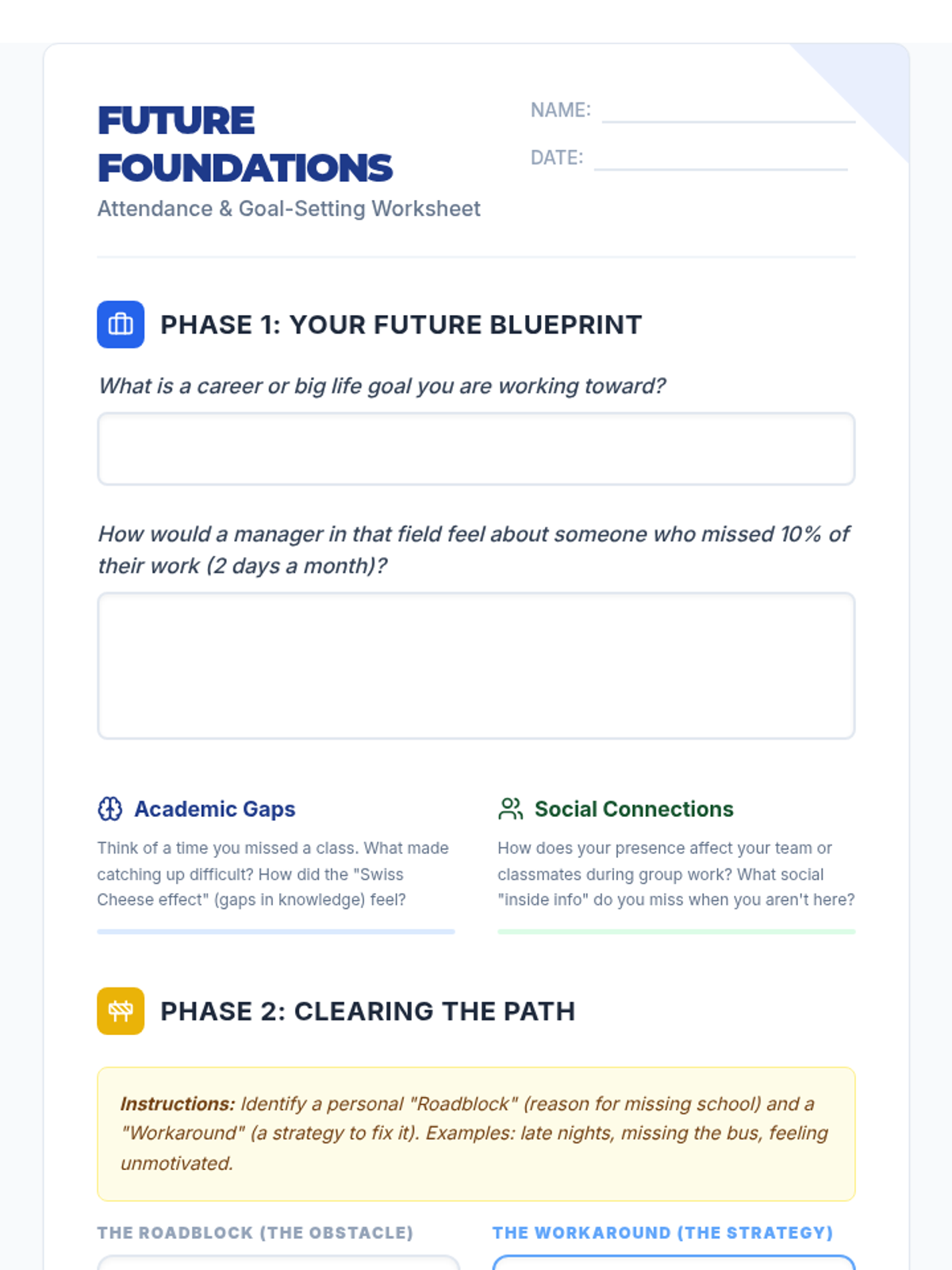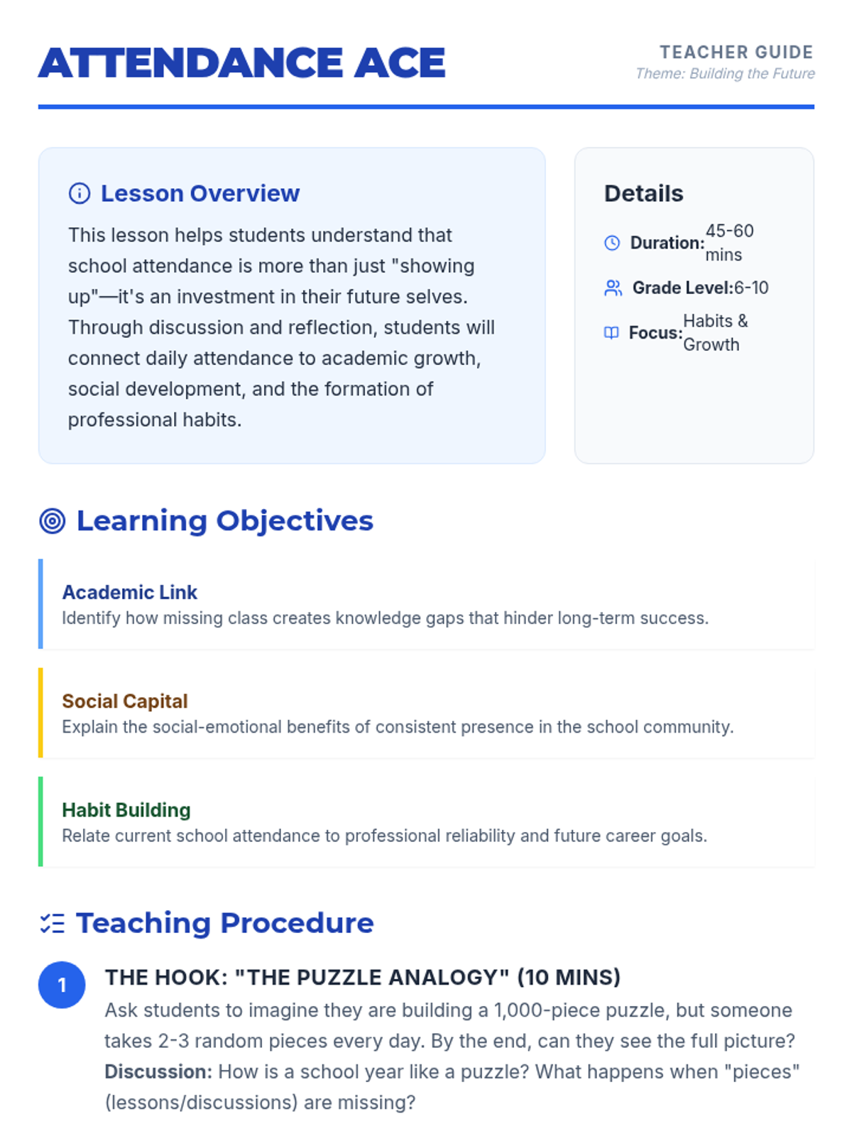 This lesson explores why showing up every day matters, focusing on the connection between attendance, academic success, social growth, and future habits. Students will analyze how consistent attendance builds a foundation for their future goals.