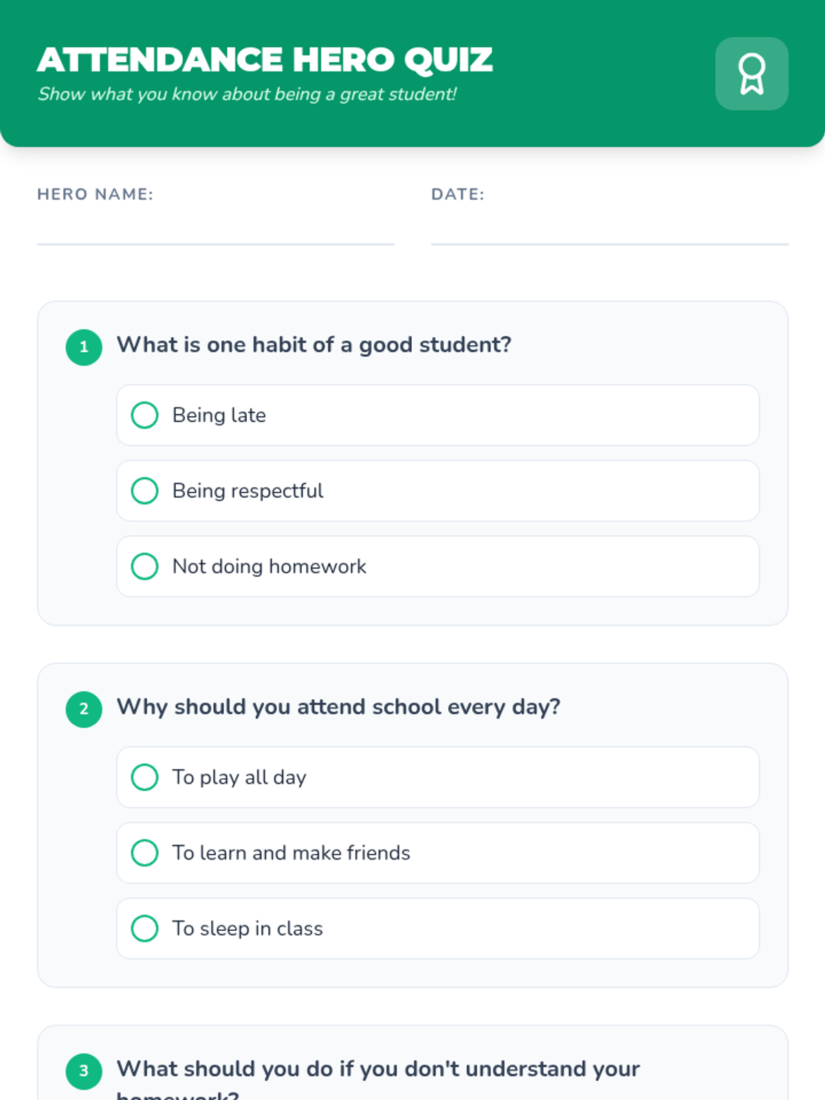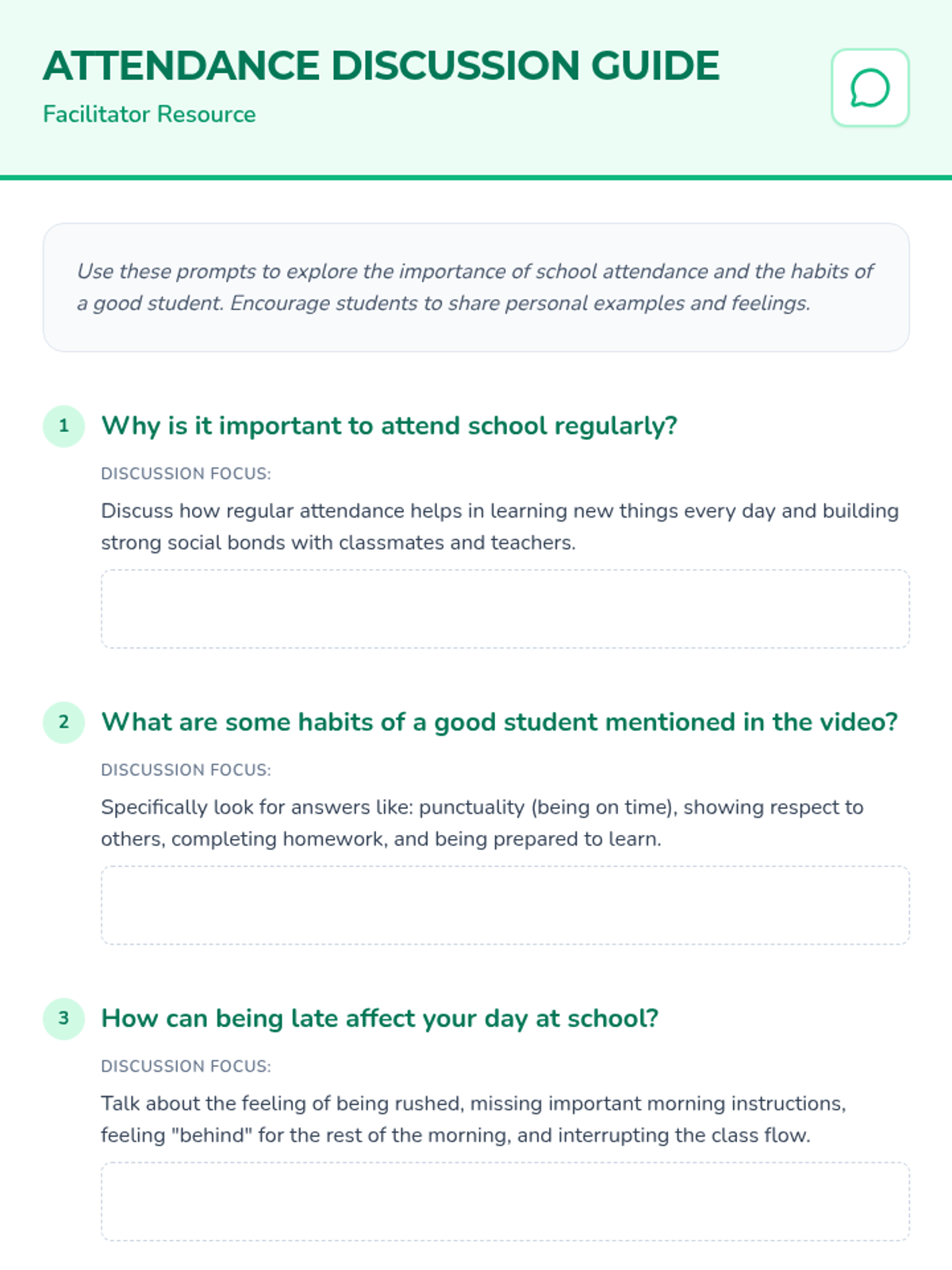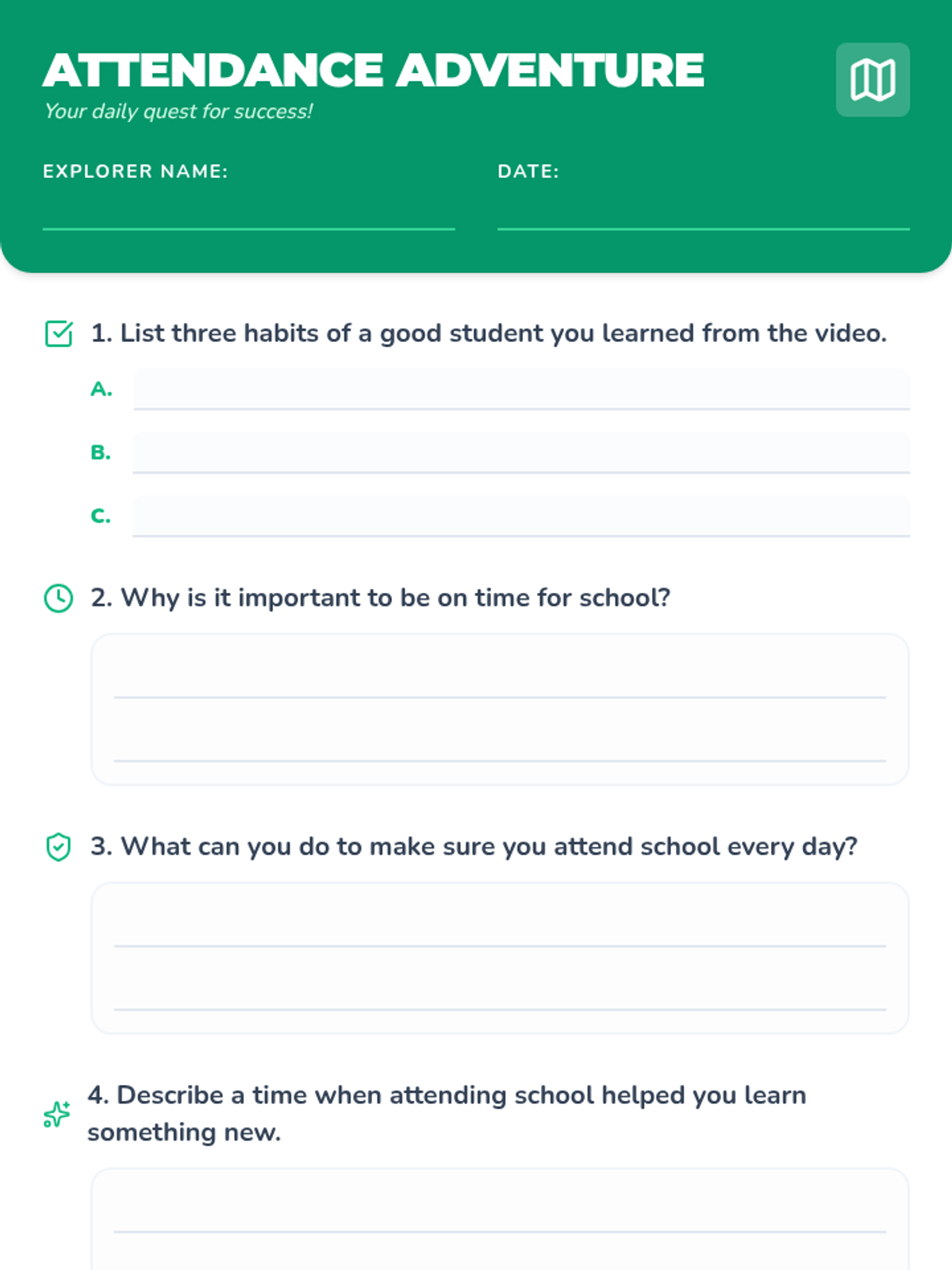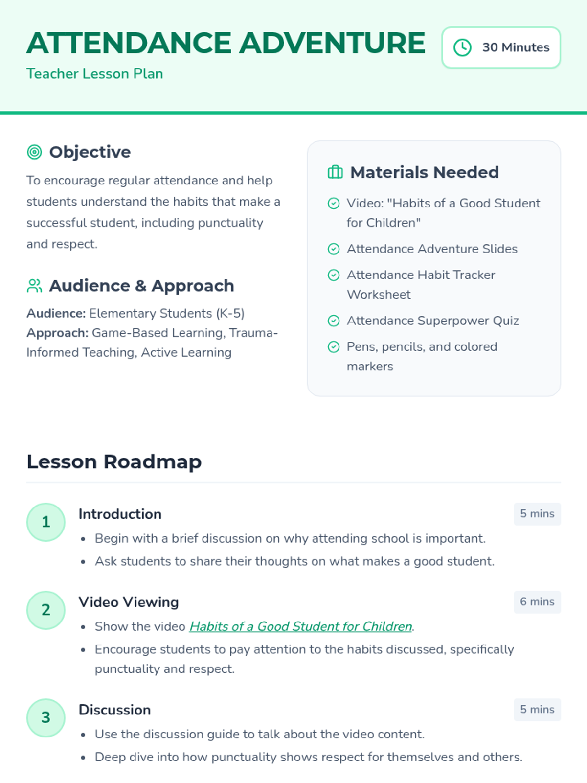 An engaging lesson for elementary students focused on the importance of regular attendance, punctuality, and respect through interactive games and a video.