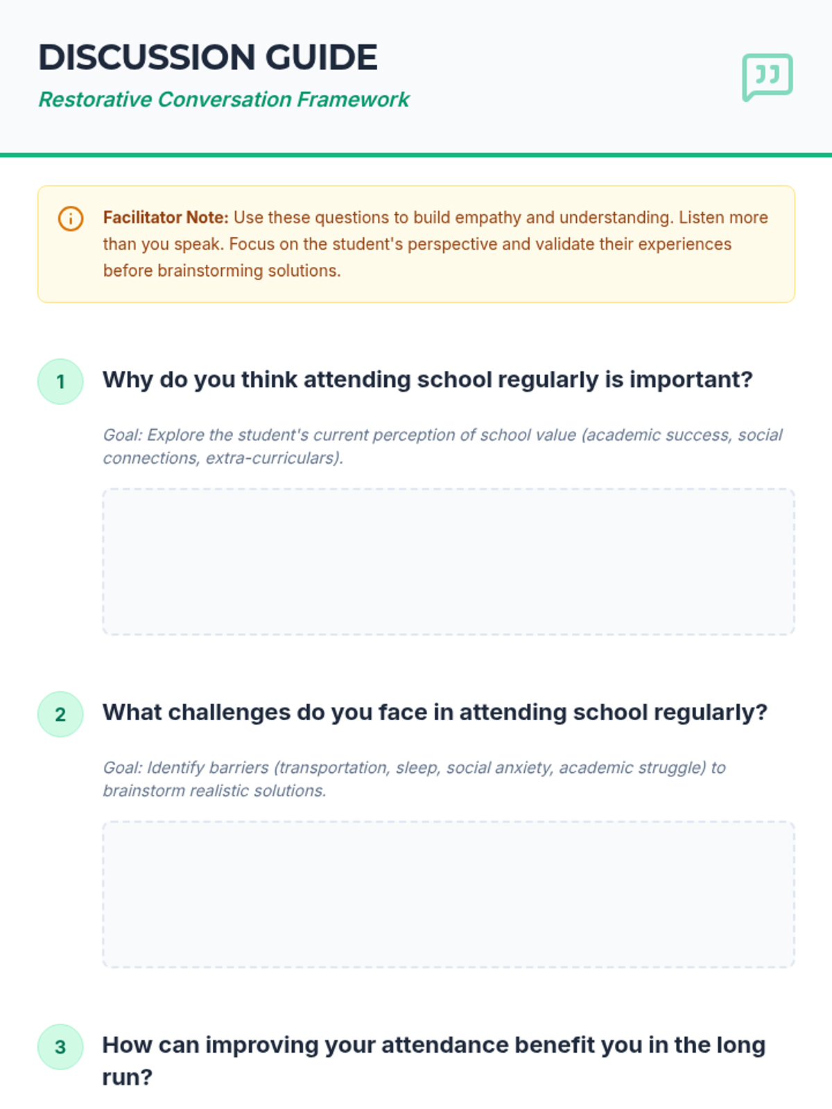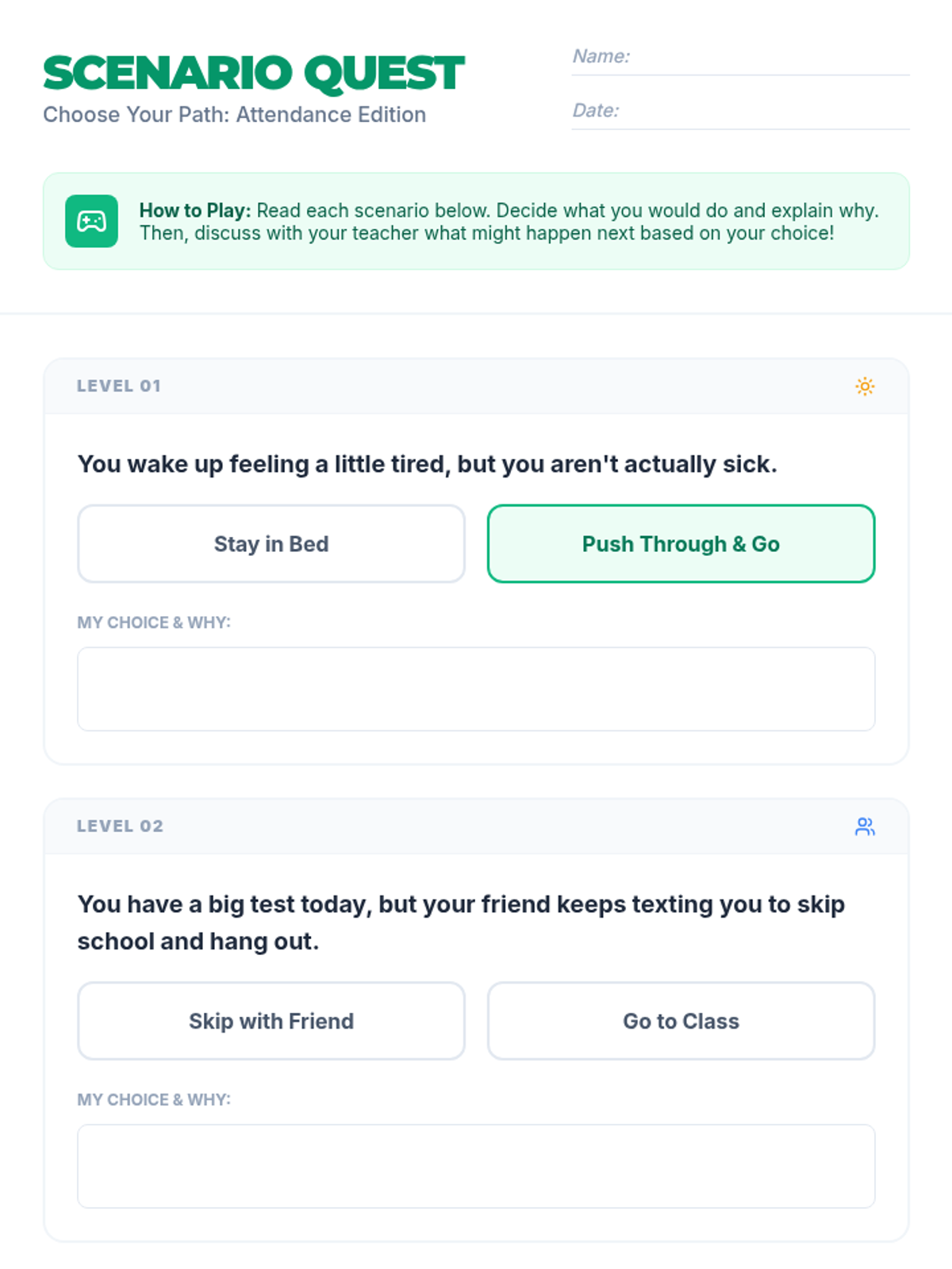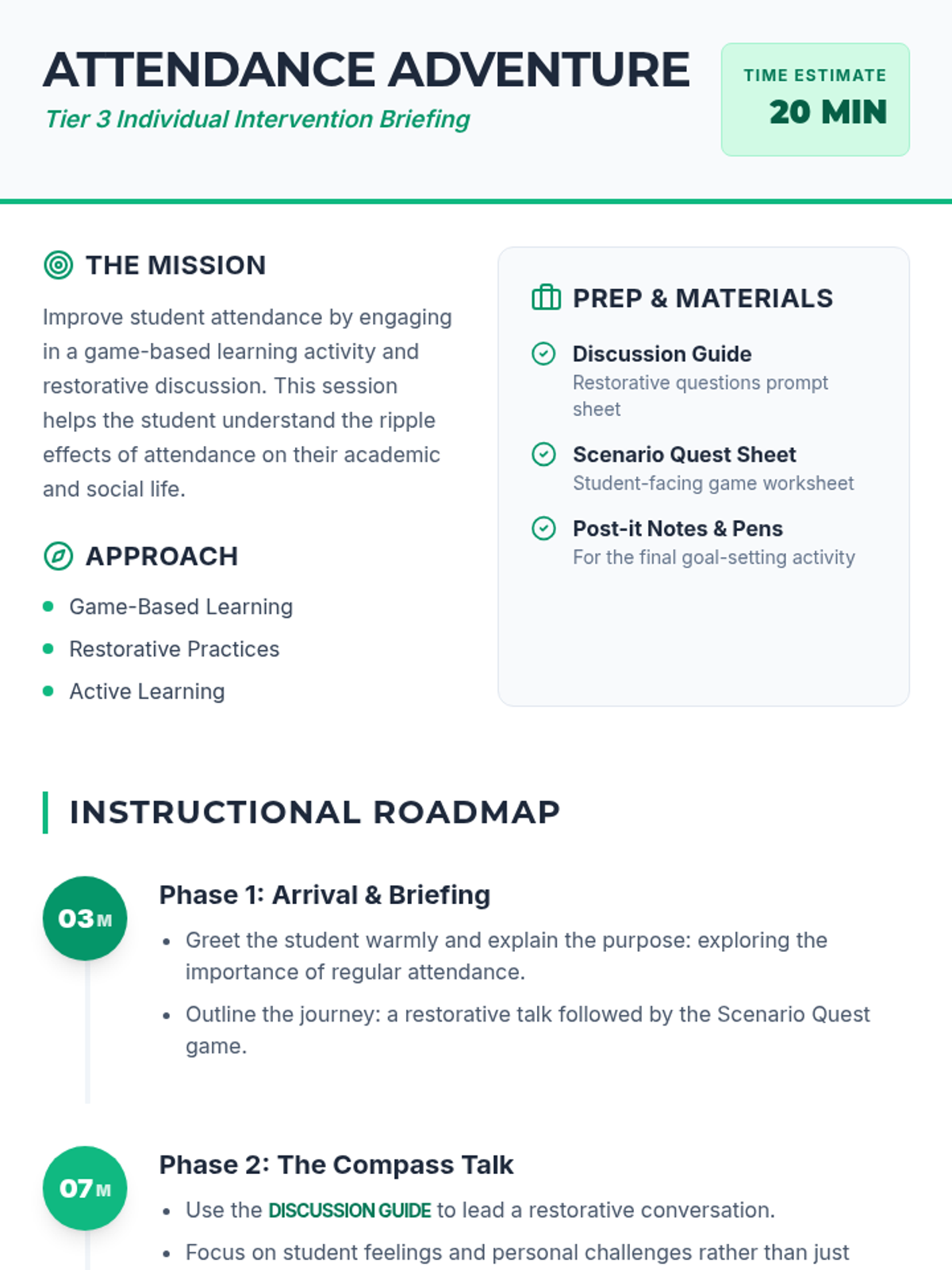 An individual Tier 3 intervention for 7th-grade students designed to explore the importance of regular attendance through game-based scenarios and restorative discussion.