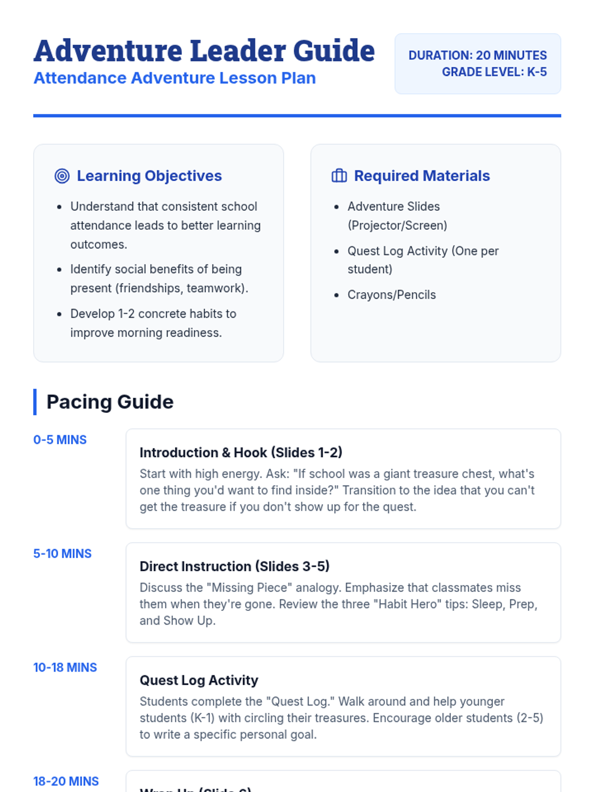 A high-energy, 20-minute lesson designed to help elementary students understand why coming to school every day is vital for their learning, friendships, and future success.