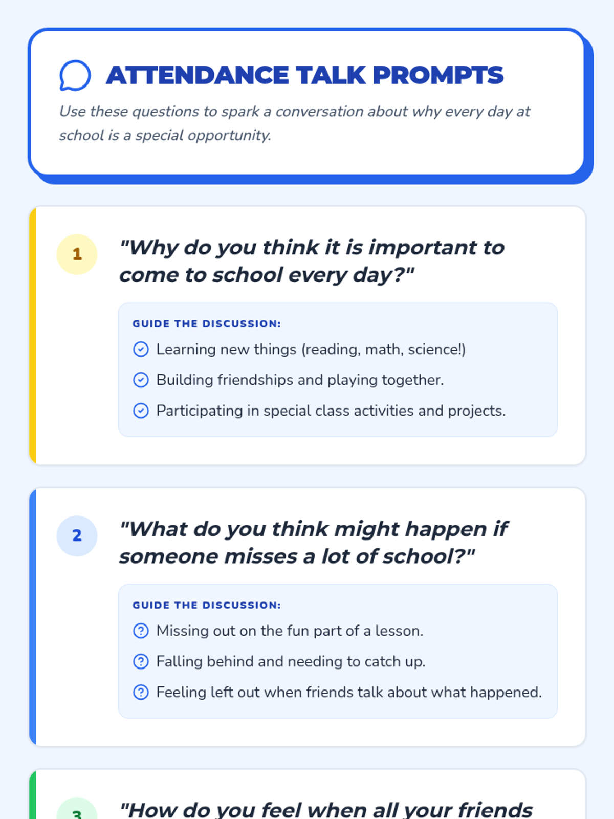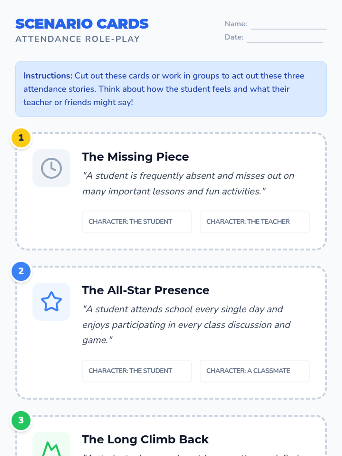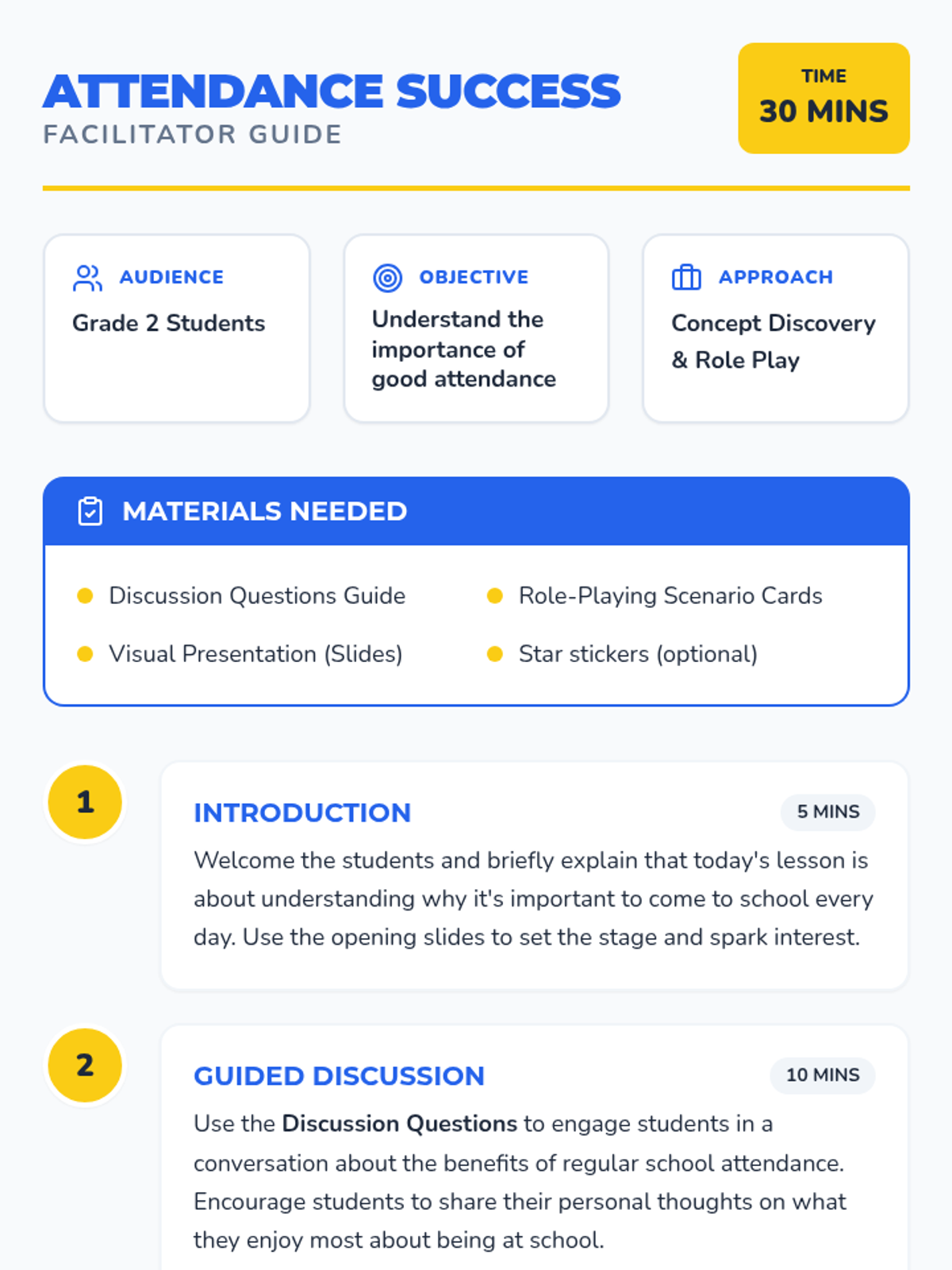 A lesson for Grade 2 students on the importance of regular school attendance, featuring discussions and role-playing to illustrate the benefits of being in school every day.