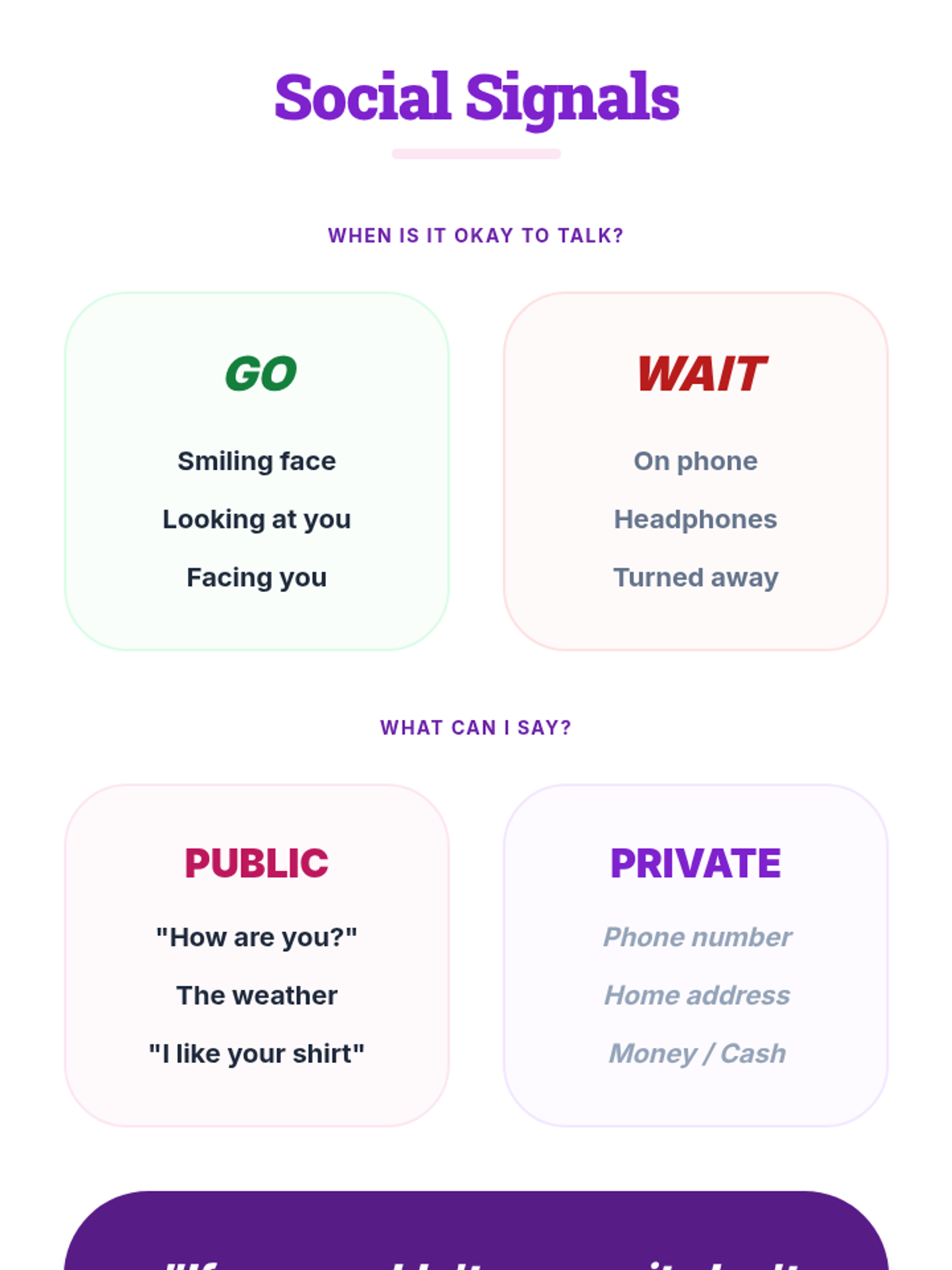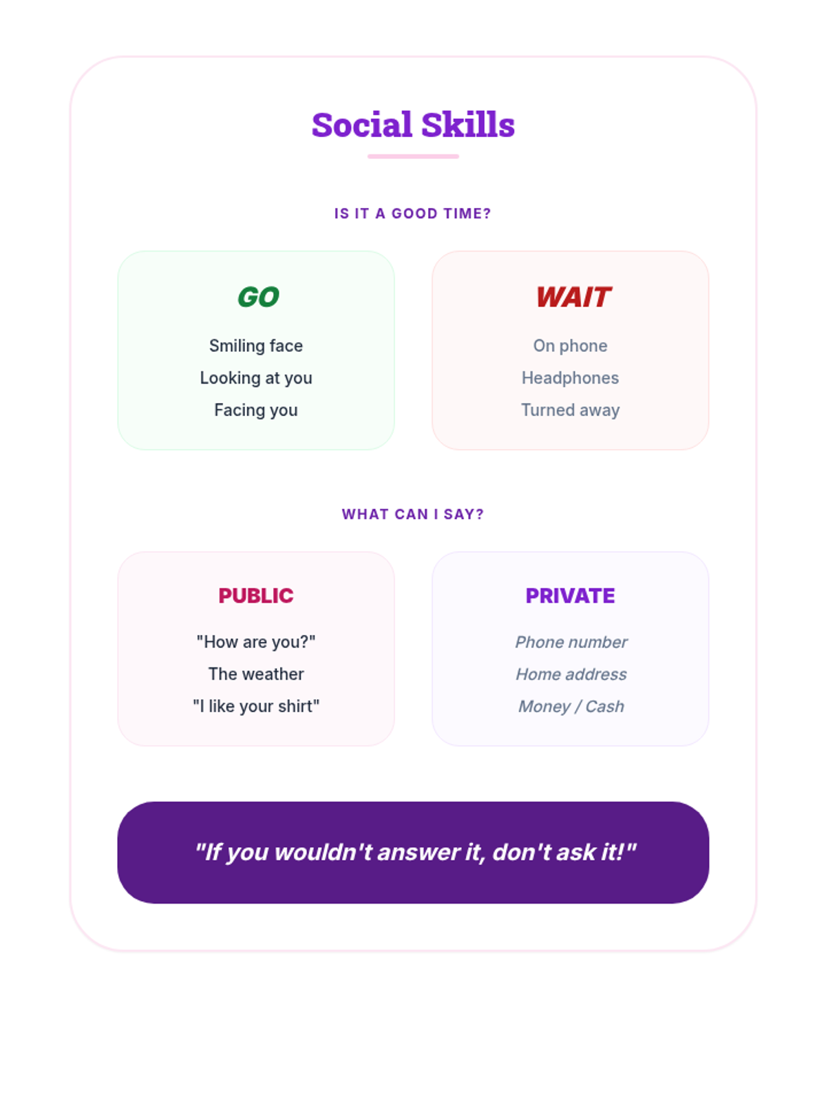 A practical session designed for adults with mental health needs to navigate social boundaries, distinguish between public and private information, and read body language cues for conversation readiness.