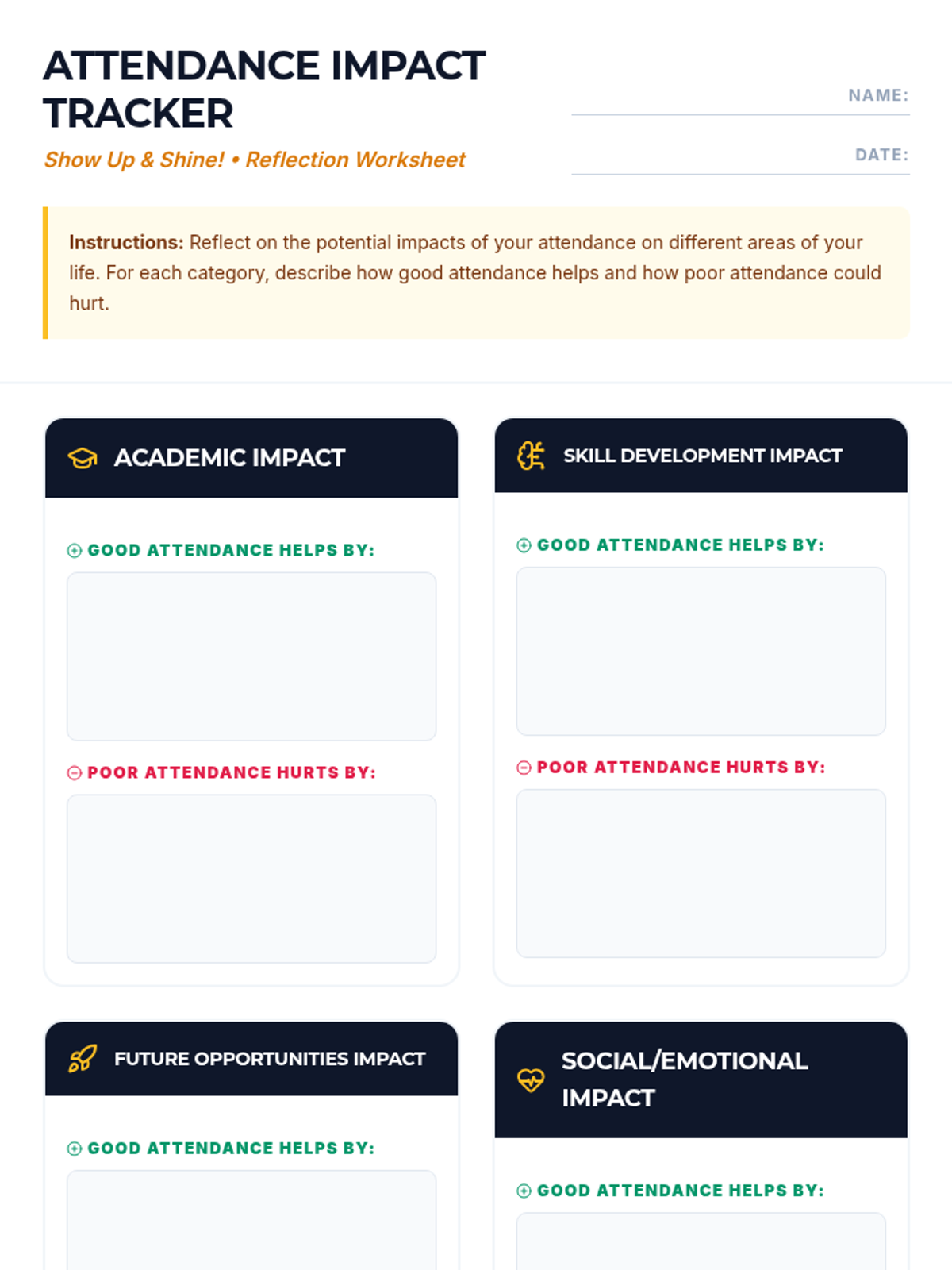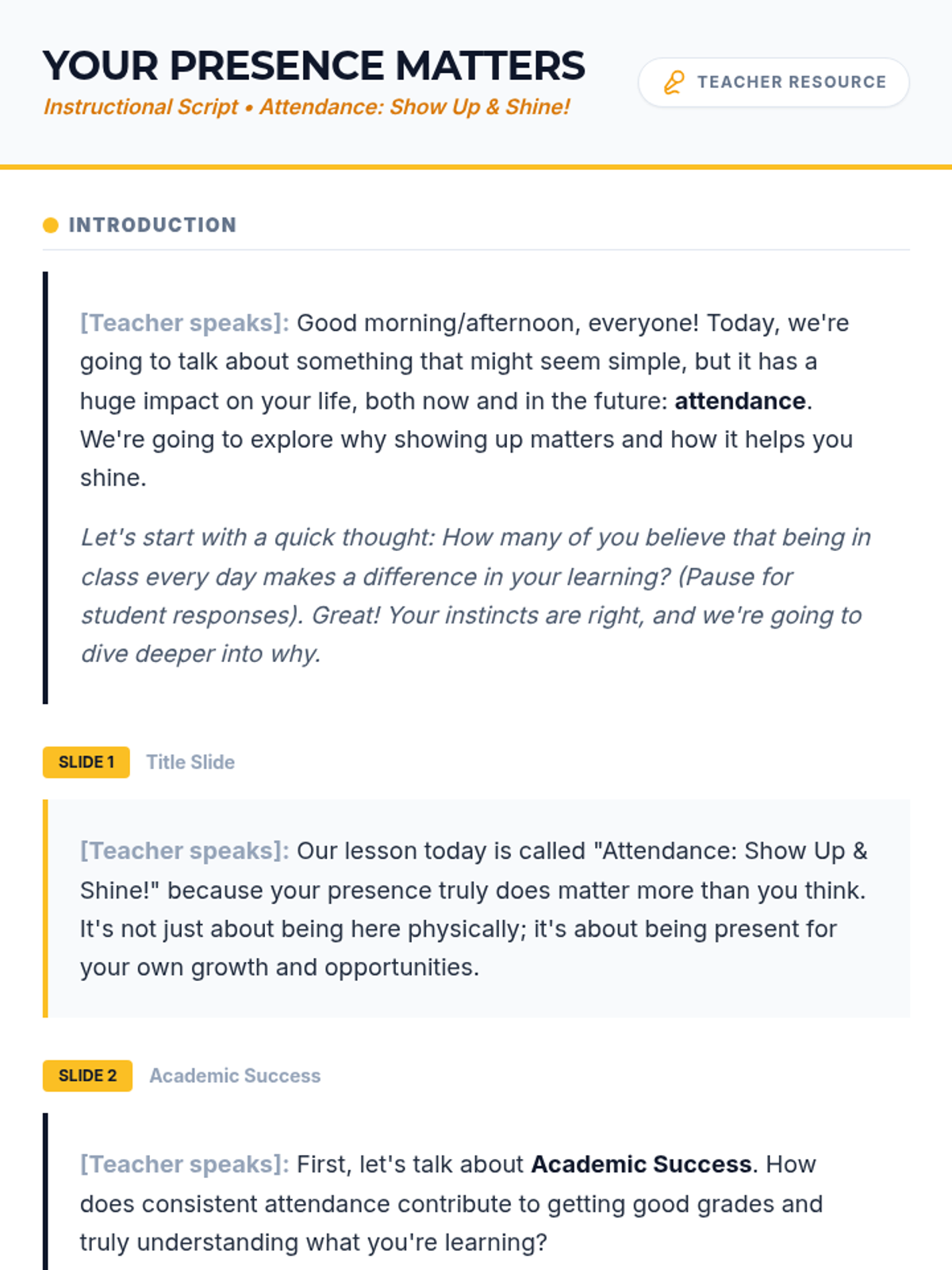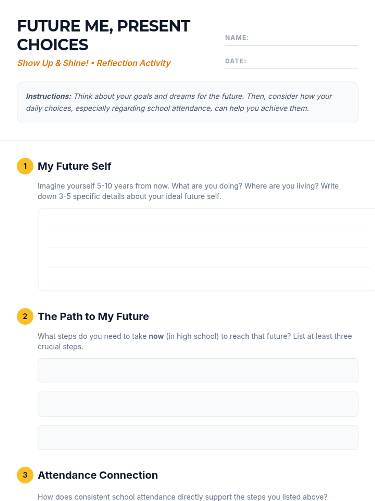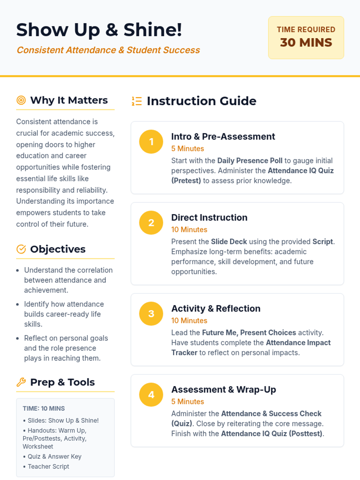 A 30-minute high school lesson exploring the vital link between consistent school attendance and academic success, career readiness, and personal growth. Students will engage in self-reflection and impact analysis to understand why their presence matters.