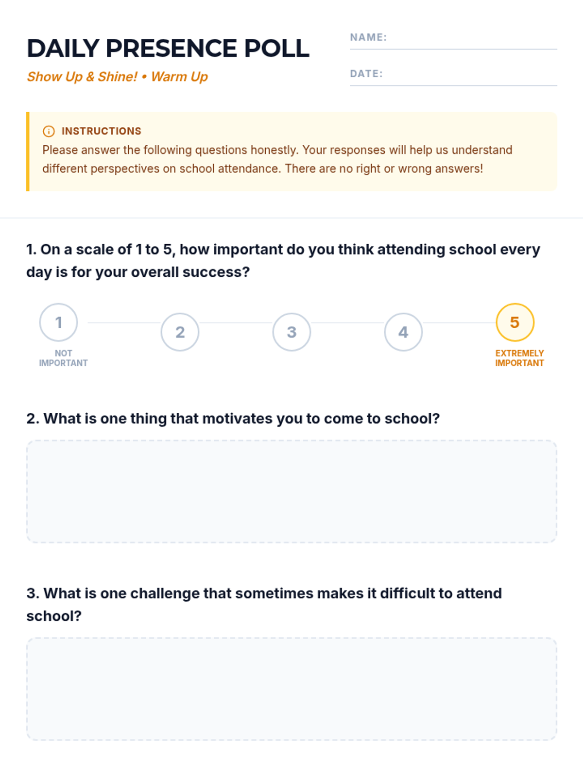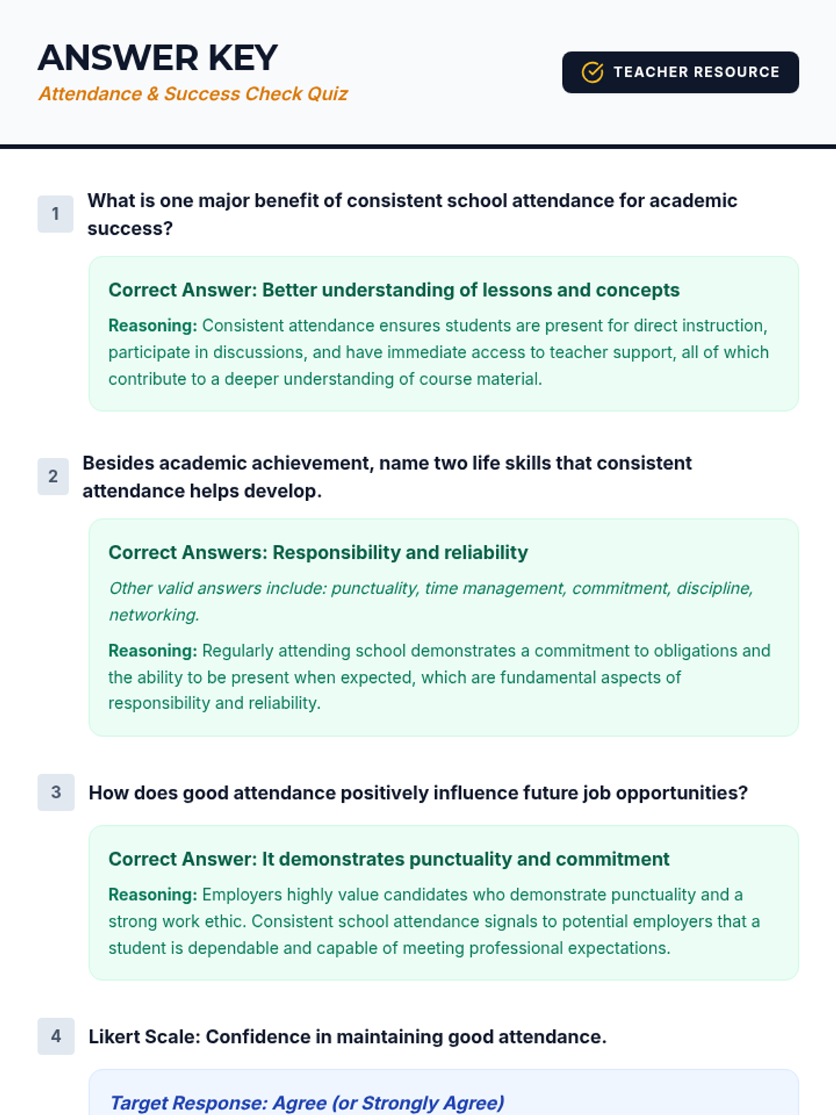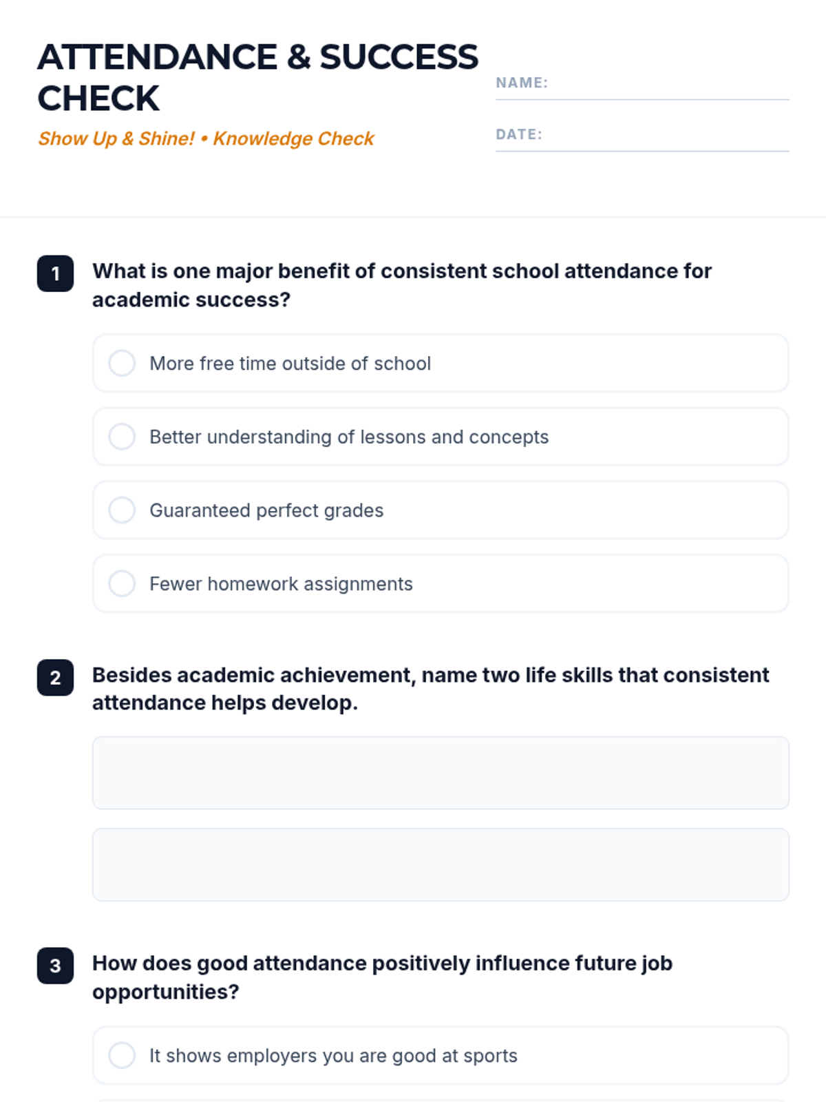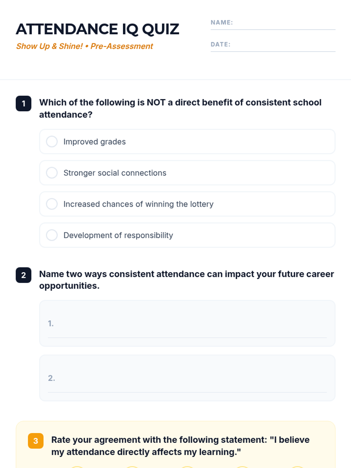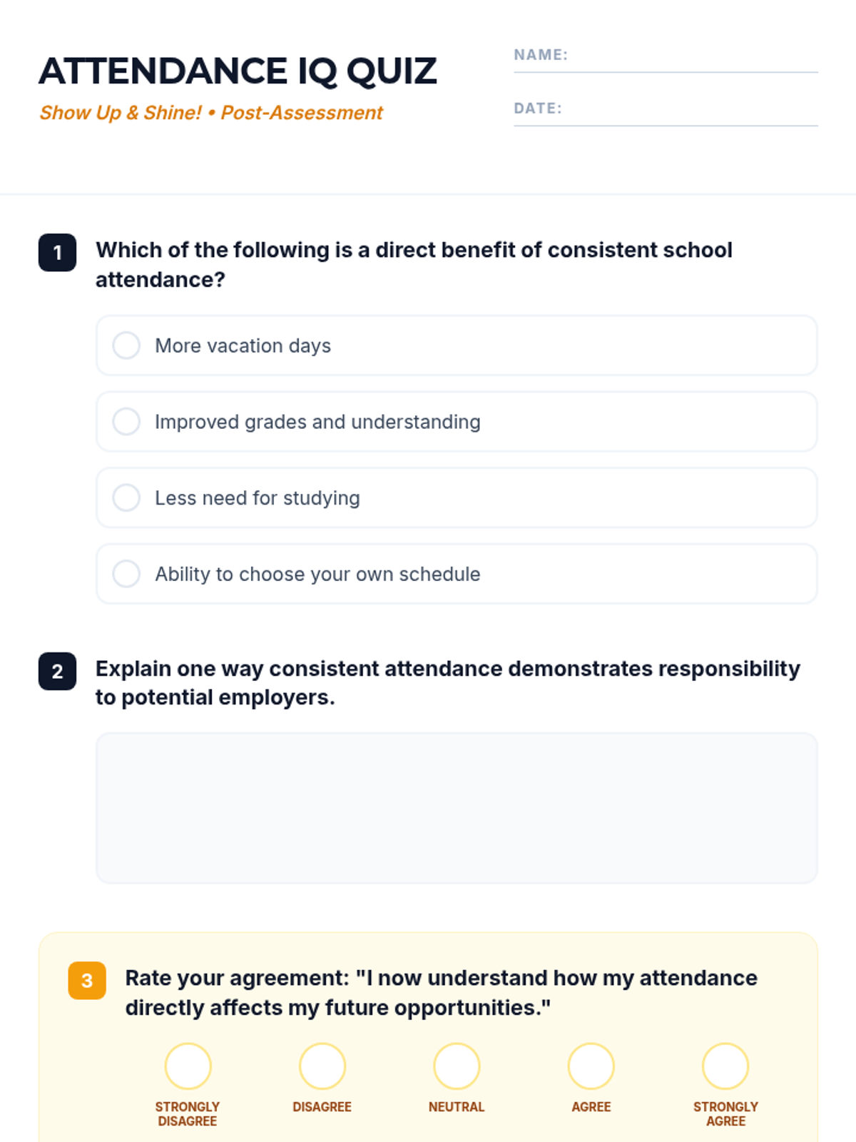 A 30-minute high school lesson exploring the vital link between consistent school attendance and academic success, career readiness, and personal growth. Students will engage in self-reflection and impact analysis to understand why their presence matters.