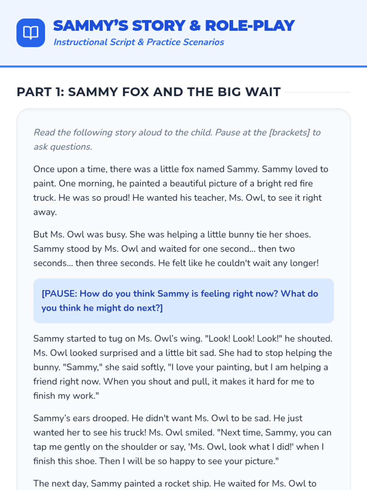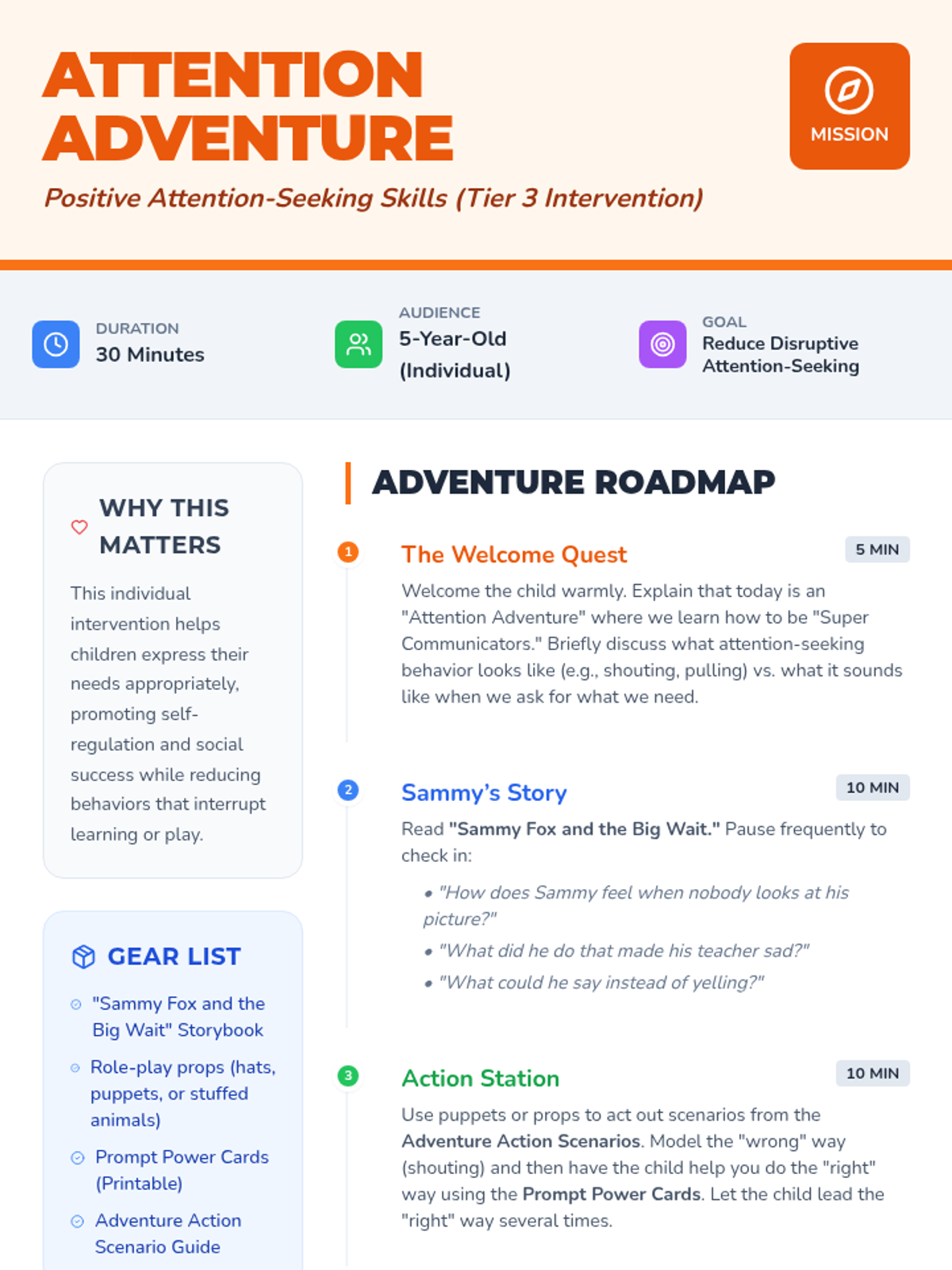 A Tier 3 social-emotional lesson for 5-year-olds focused on learning positive ways to seek attention through storytelling, role-play, and visual prompts.