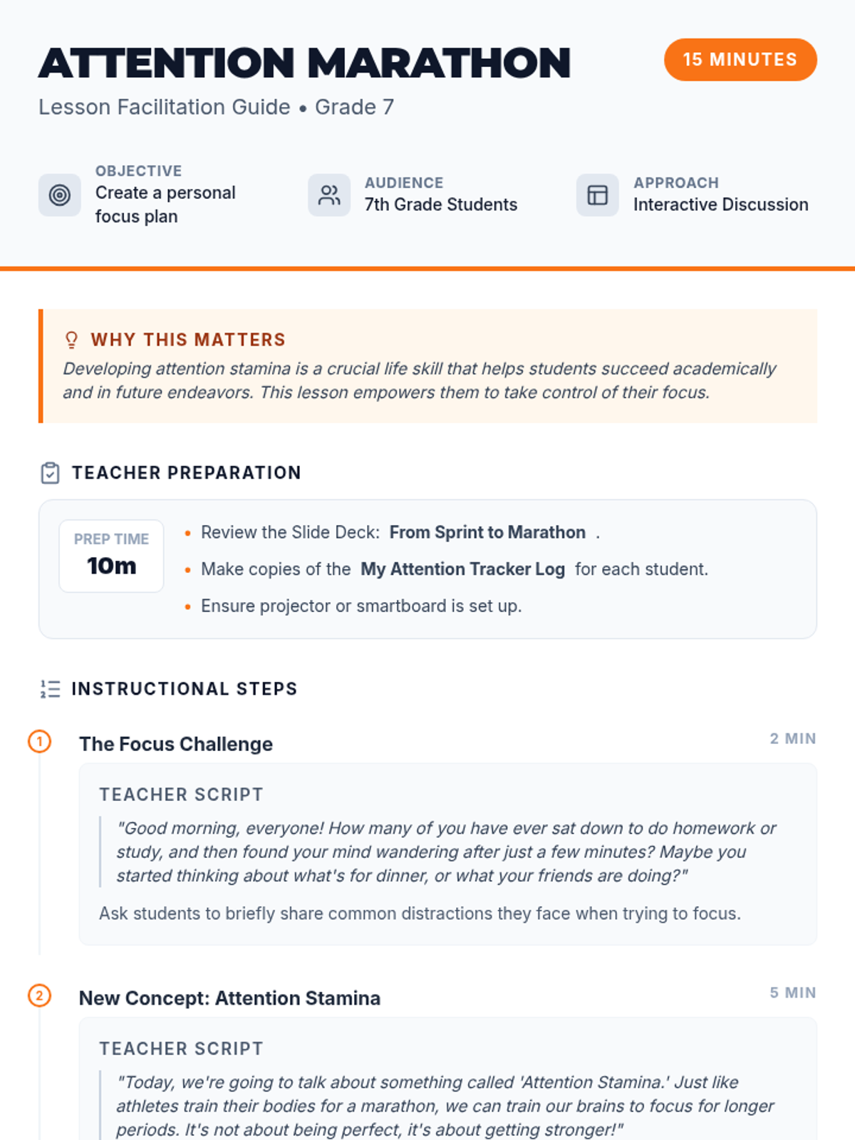 This 15-minute, single-session lesson helps 7th-grade students develop strategies to improve their attention stamina and focus. Students will learn about attention as a skill that can be trained and create a personal plan to gradually increase their focused work time on specific tasks.