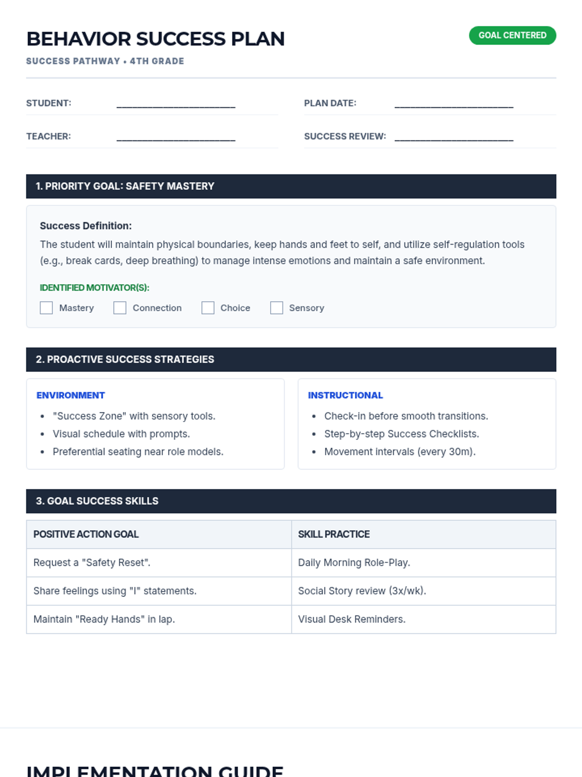 A comprehensive behavior intervention package designed for a 4th-grade student struggling with physical aggression, focusing on 'safe body' replacement behaviors and structured support.