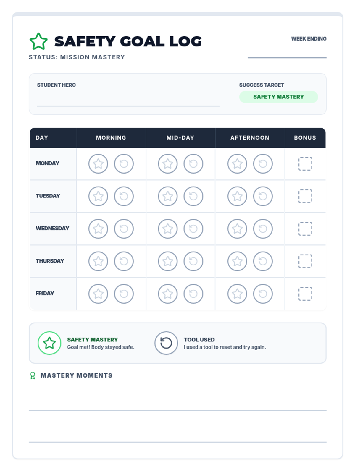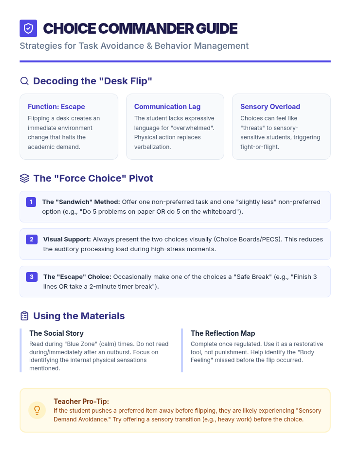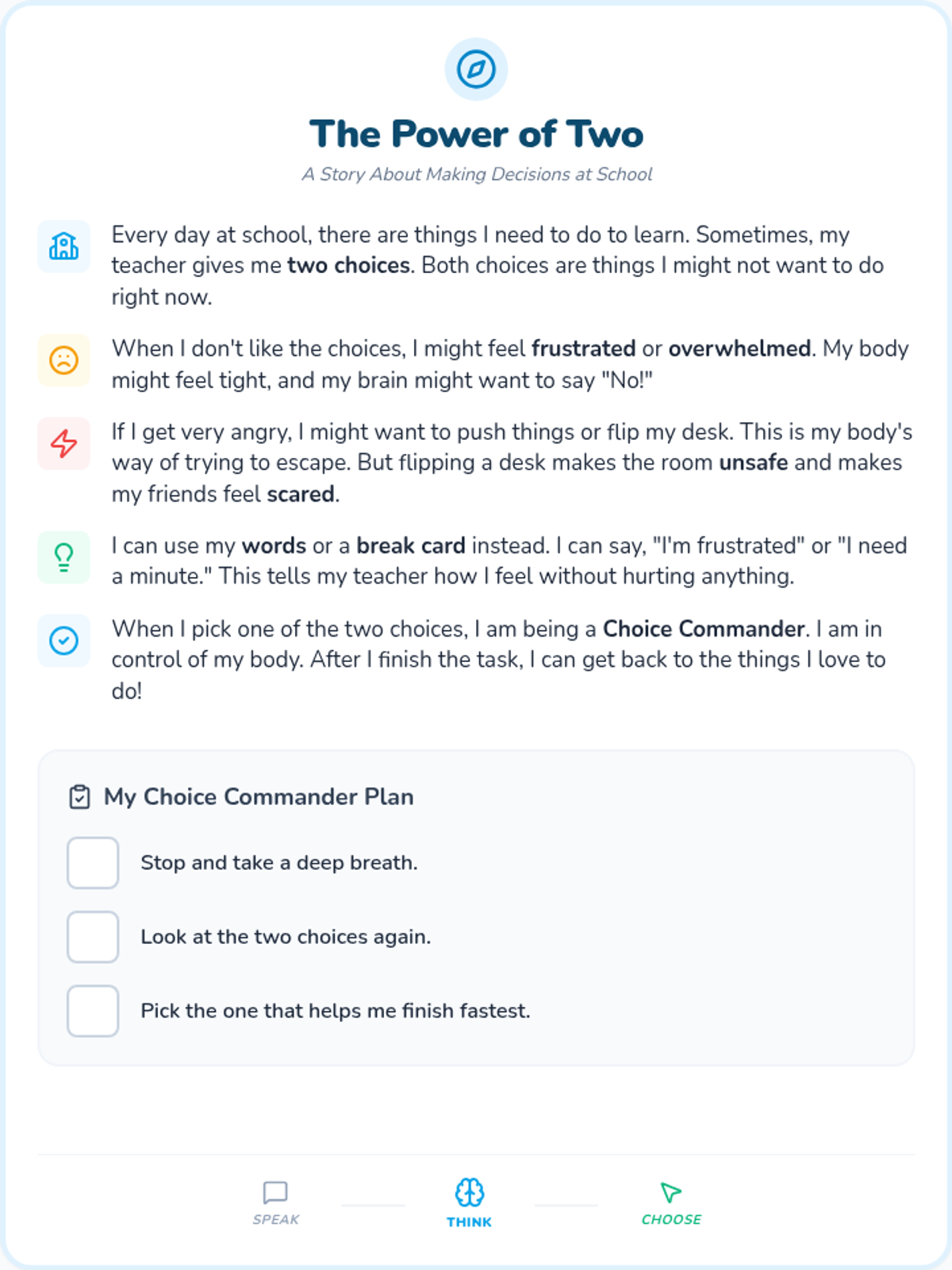 A lesson focused on helping students manage frustration when presented with non-preferred choices, providing a social story for perspective-taking and a reflection tool for post-meltdown processing.