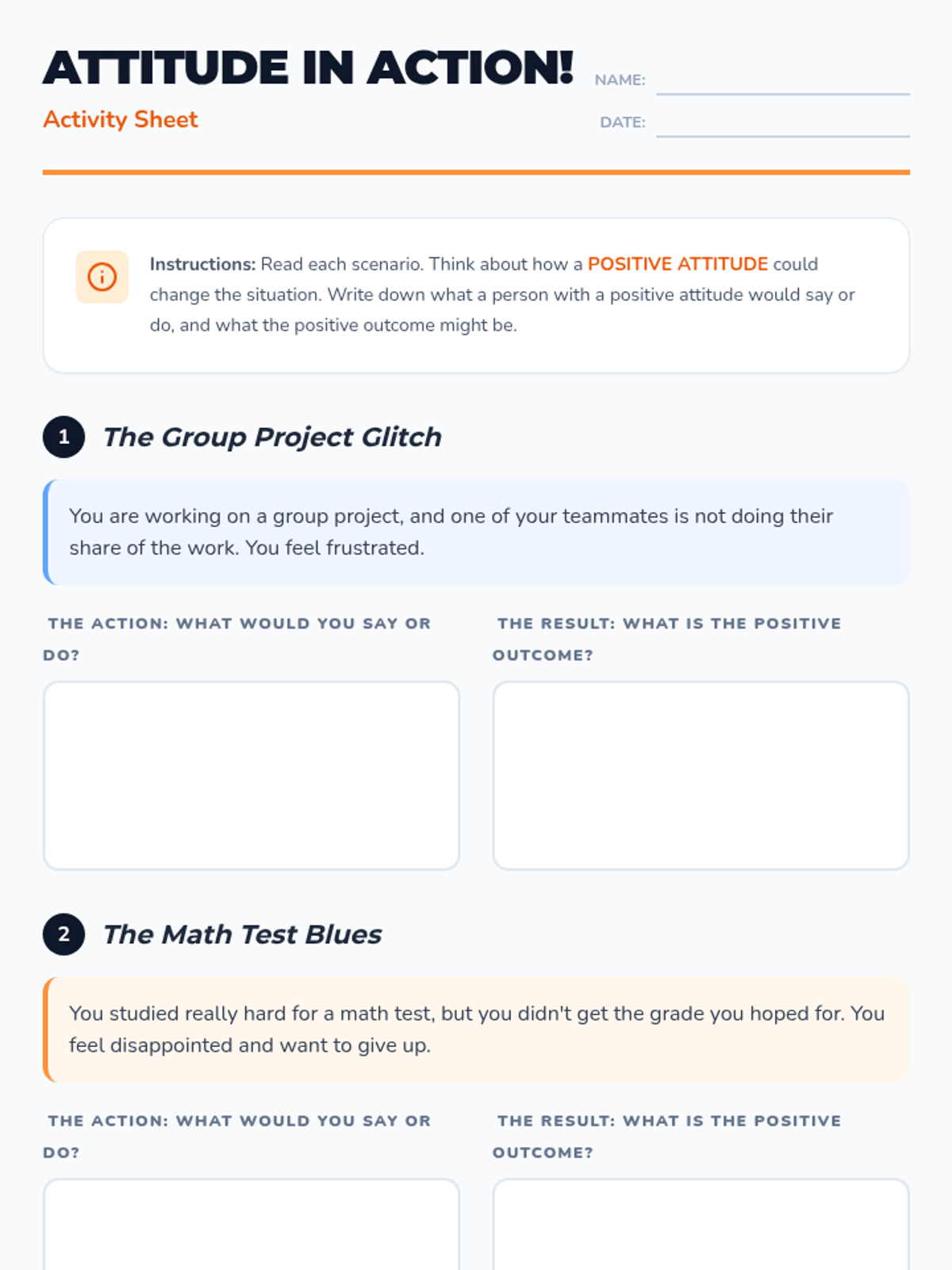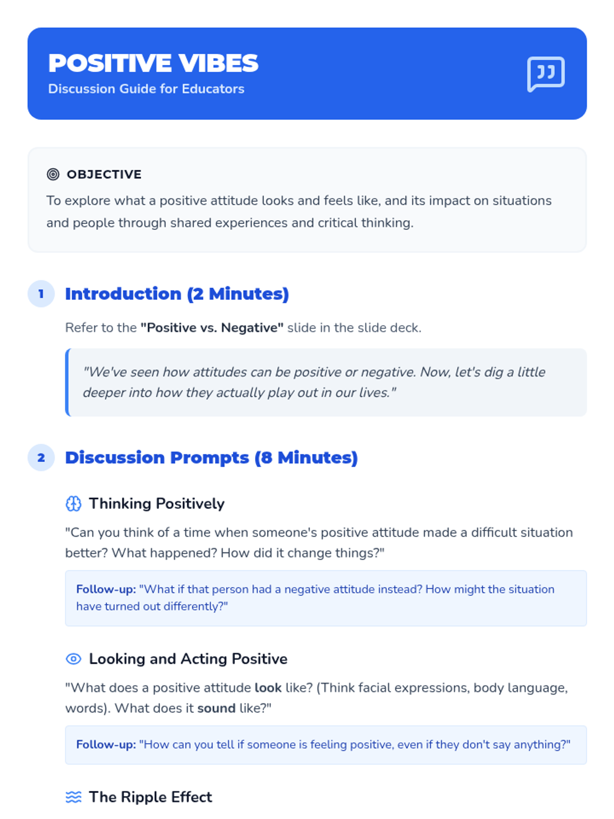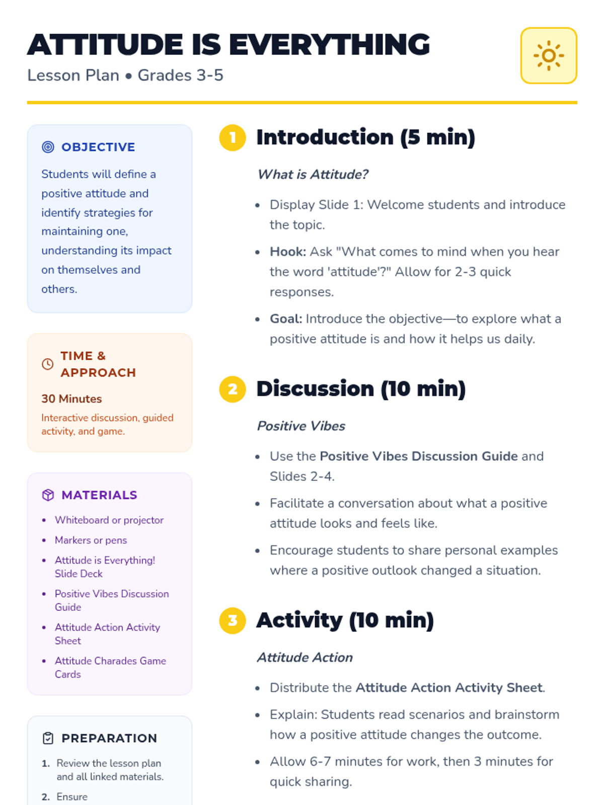 A 30-minute lesson for 3rd-5th graders that defines positive attitude and provides practical strategies for maintaining a growth mindset through discussion and activities.