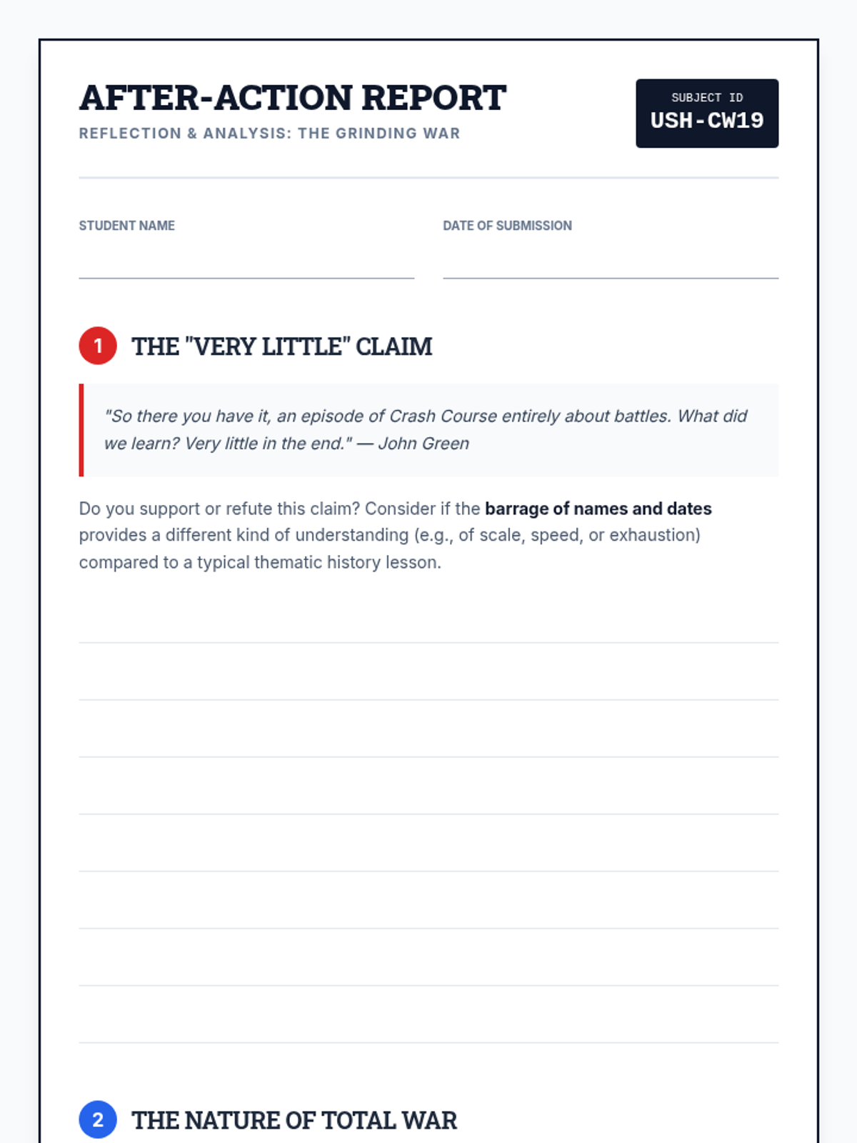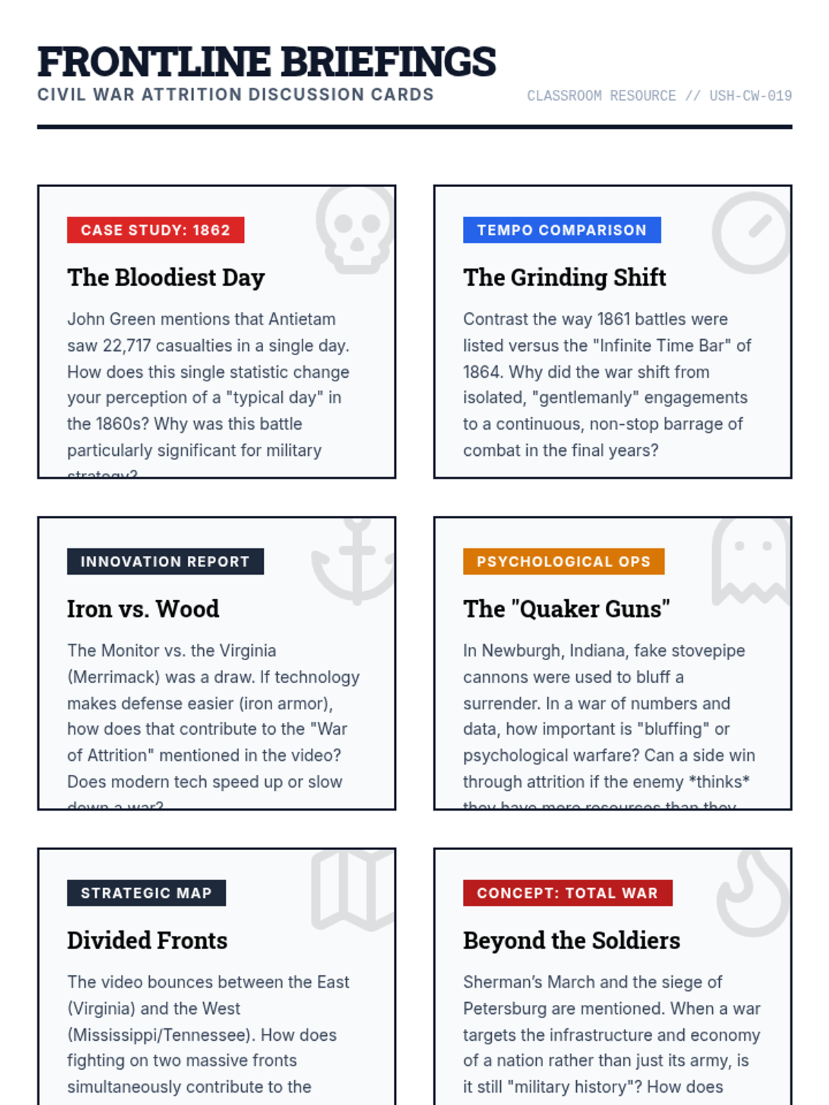 A high school history lesson exploring the shift from limited conflict to 'Total War' through the lens of battle frequency and casualty data during the US Civil War.