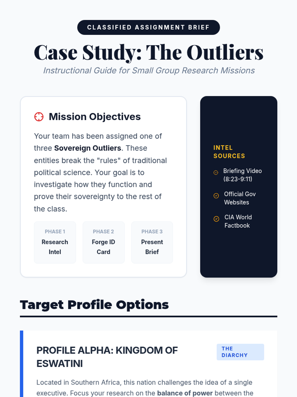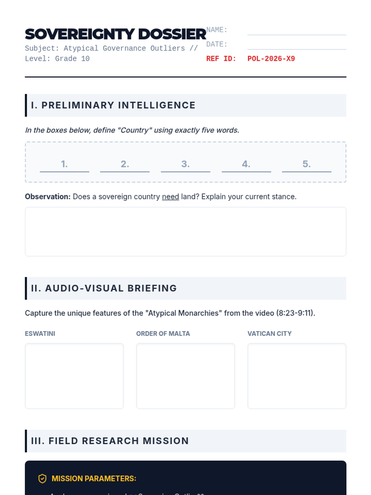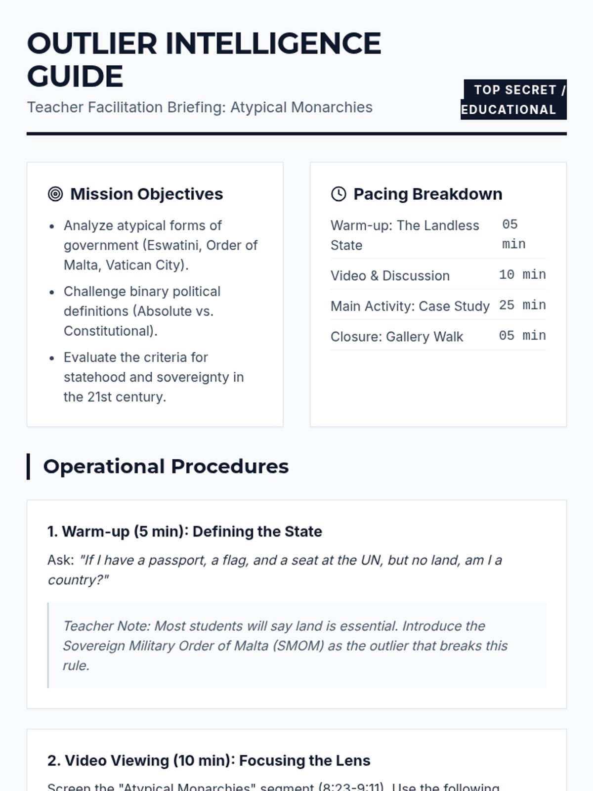 A 10th-grade lesson exploring atypical monarchies like Eswatini, the Order of Malta, and Vatican City to challenge standard definitions of sovereignty and governance.