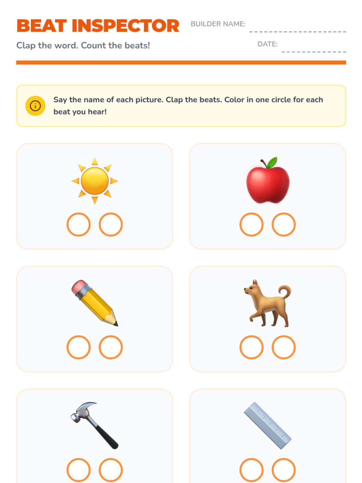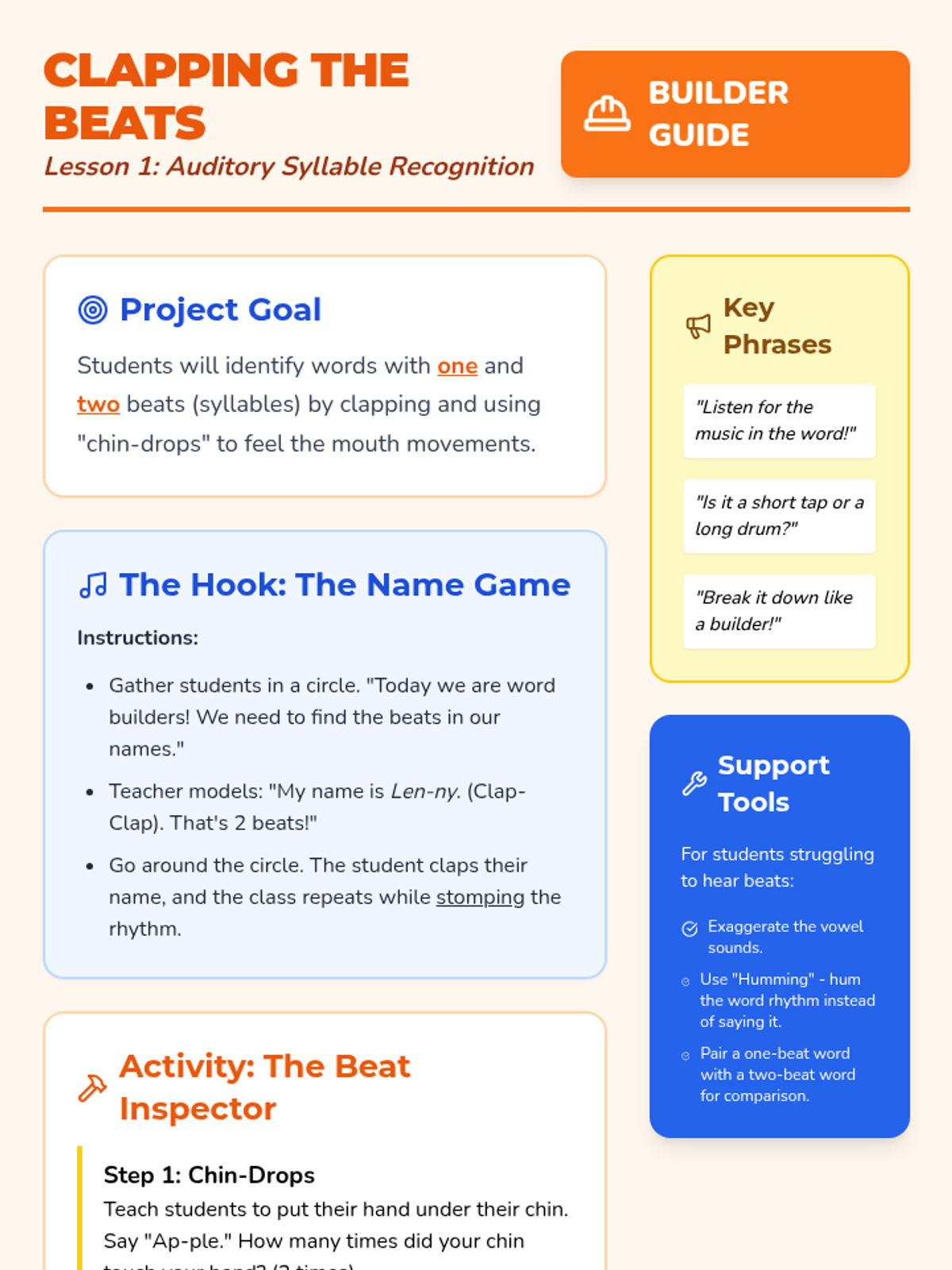 Students engage in listening activities to identify the number of 'beats' or syllables in spoken words using clapping and chin-drops.