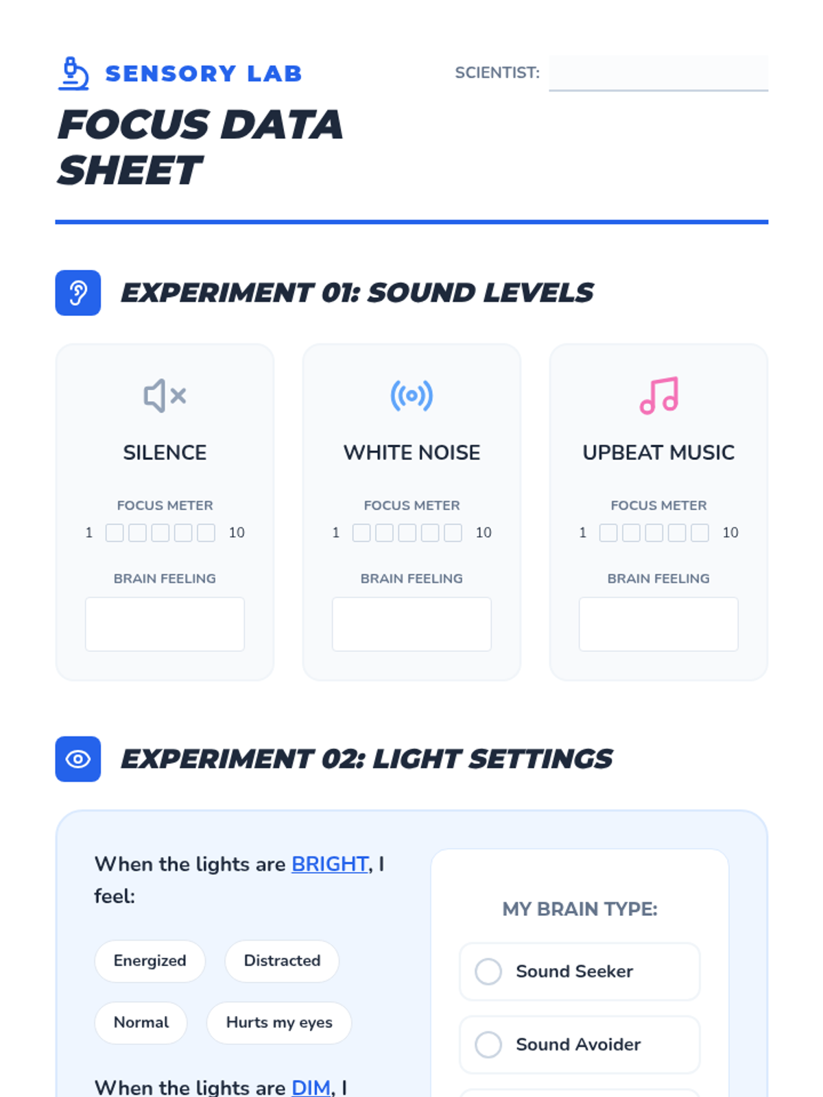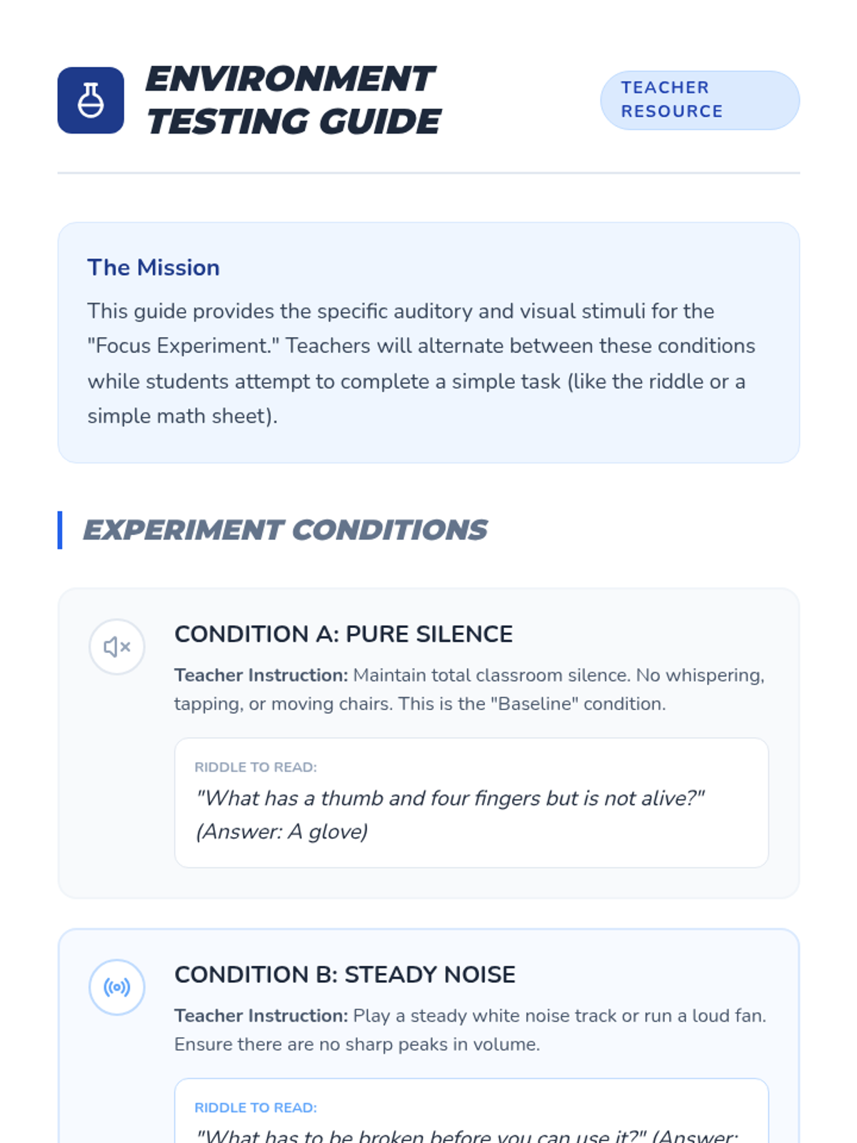 Learners conduct experiments to identify how different sound and light conditions affect their ability to focus and process information.