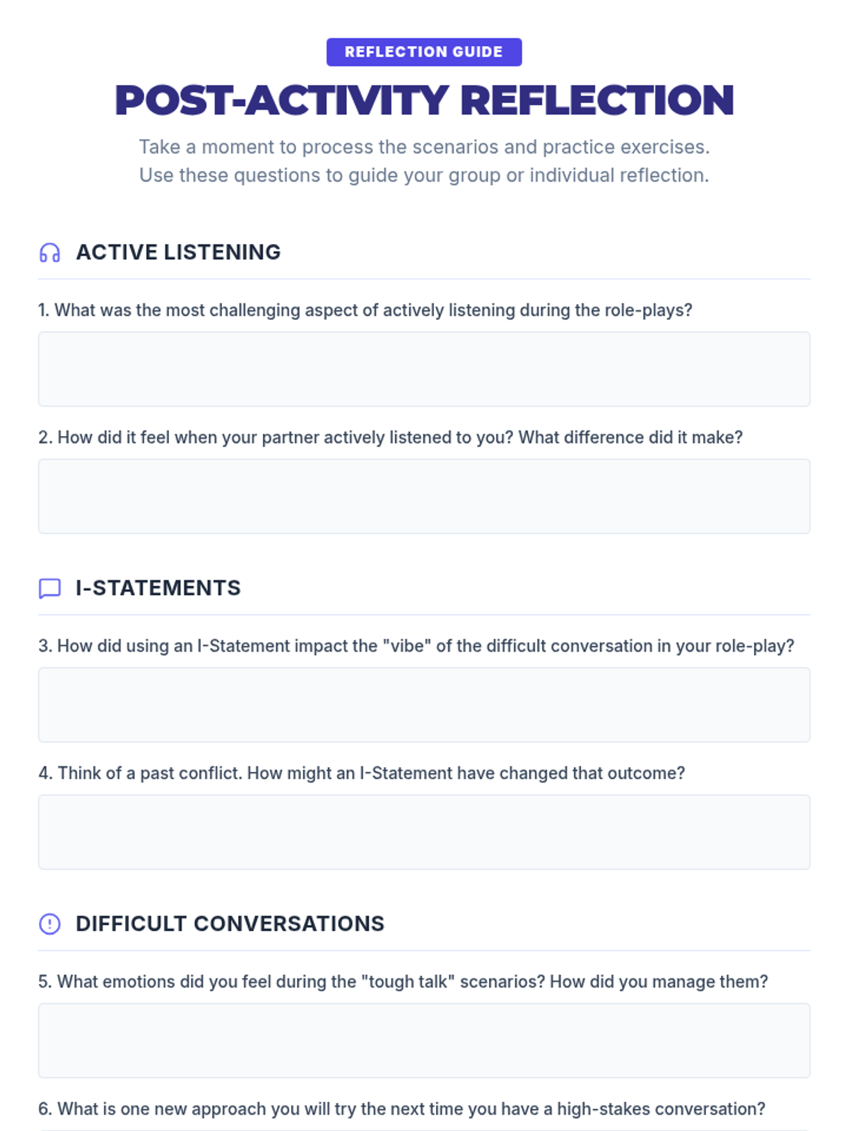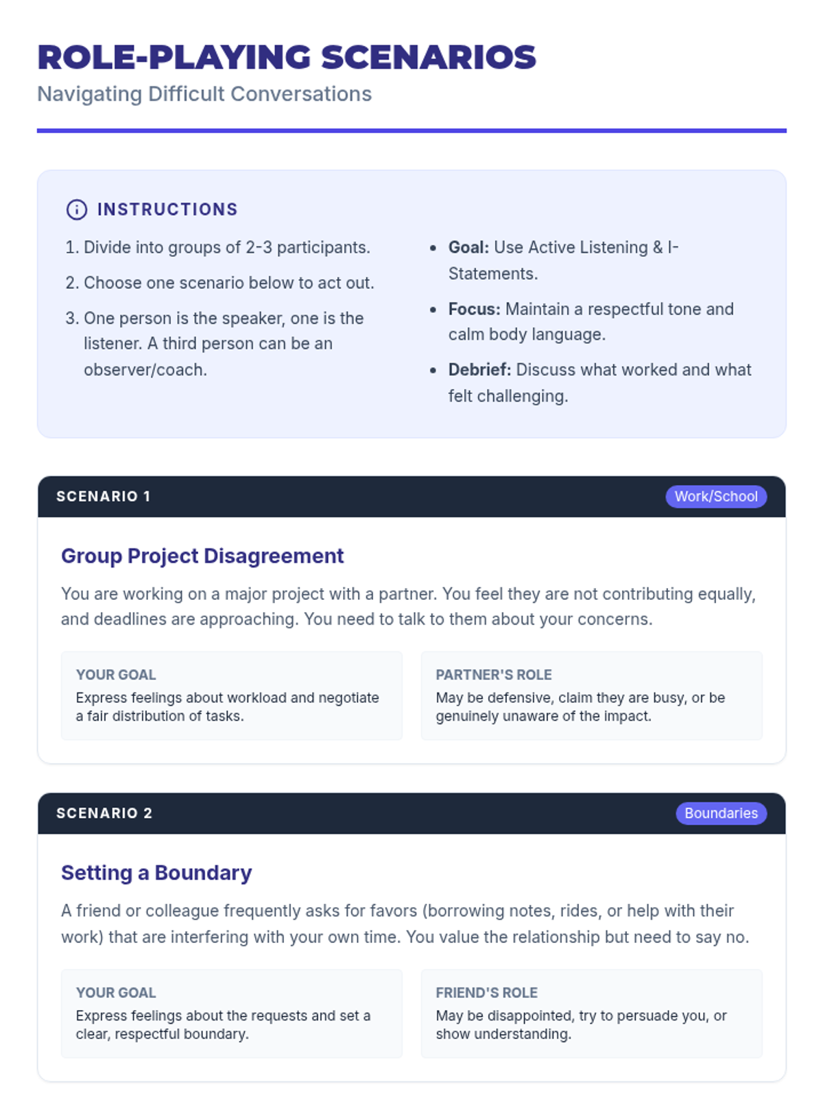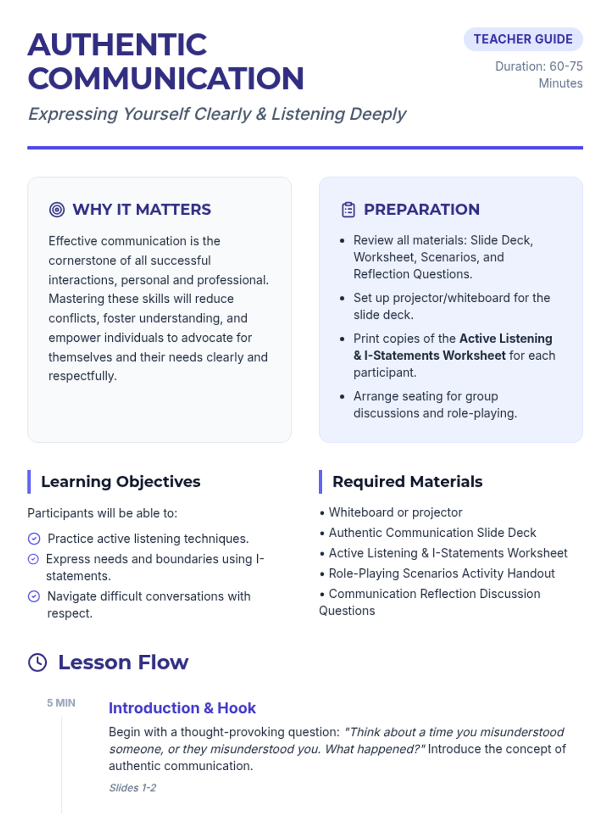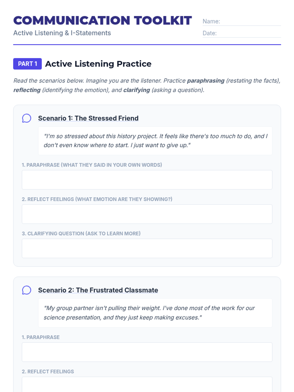 A comprehensive 60-75 minute lesson on active listening, I-statements, and navigating difficult conversations for high schoolers and adults.