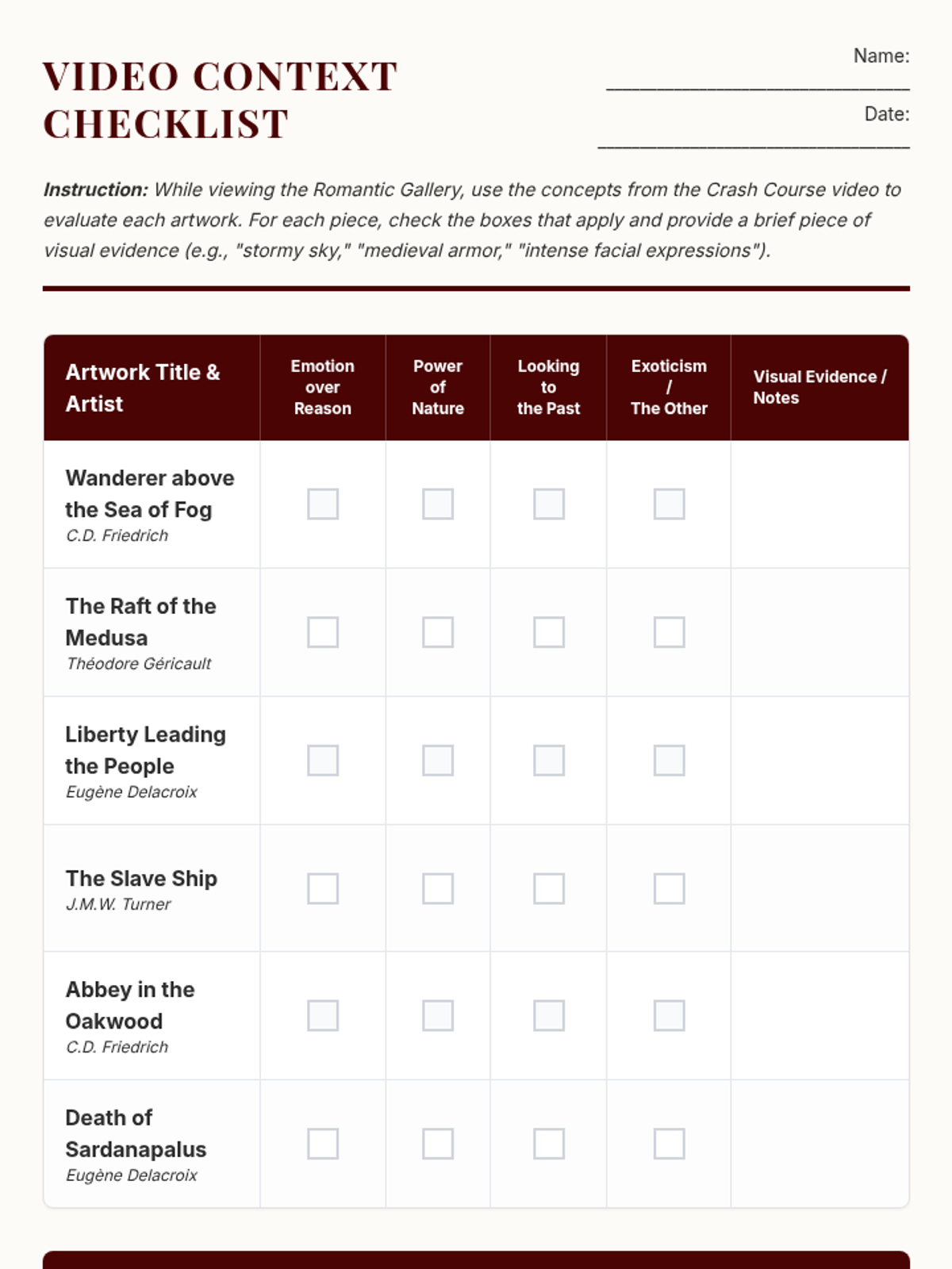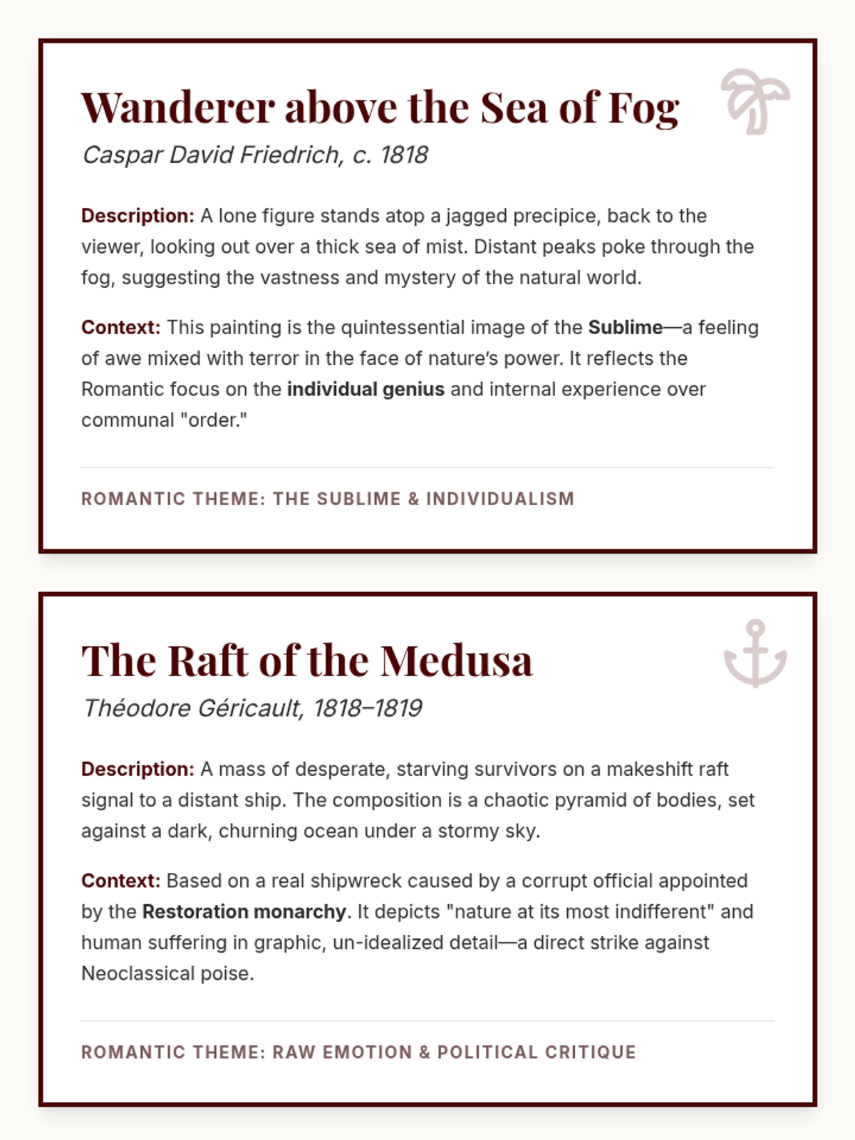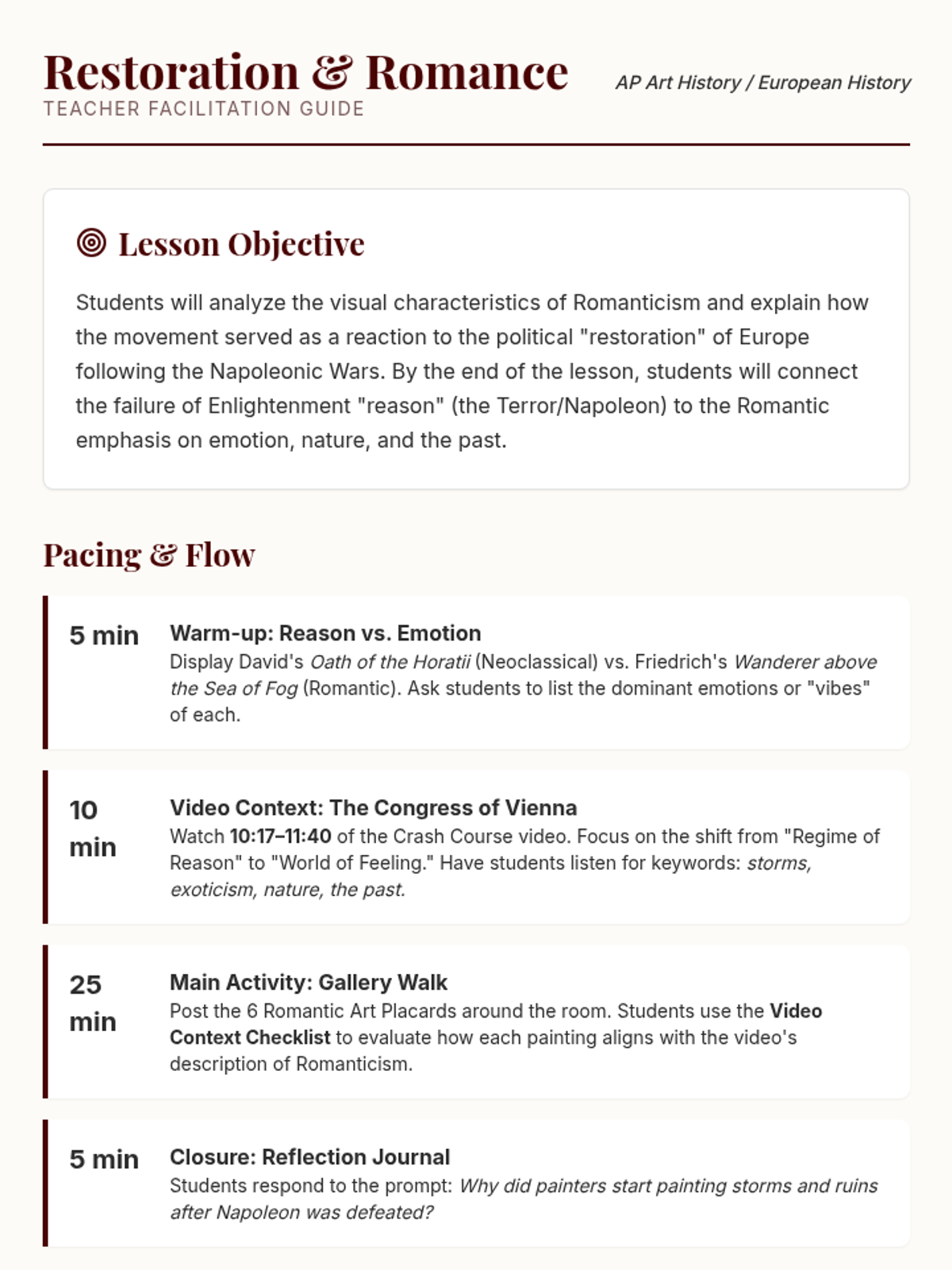 A lesson connecting the conservative political restoration of the Congress of Vienna to the emotional and nature-focused themes of the Romantic art movement. Students analyze how the failure of Enlightenment 'reason' led to a cultural shift toward feeling, history, and the sublime.