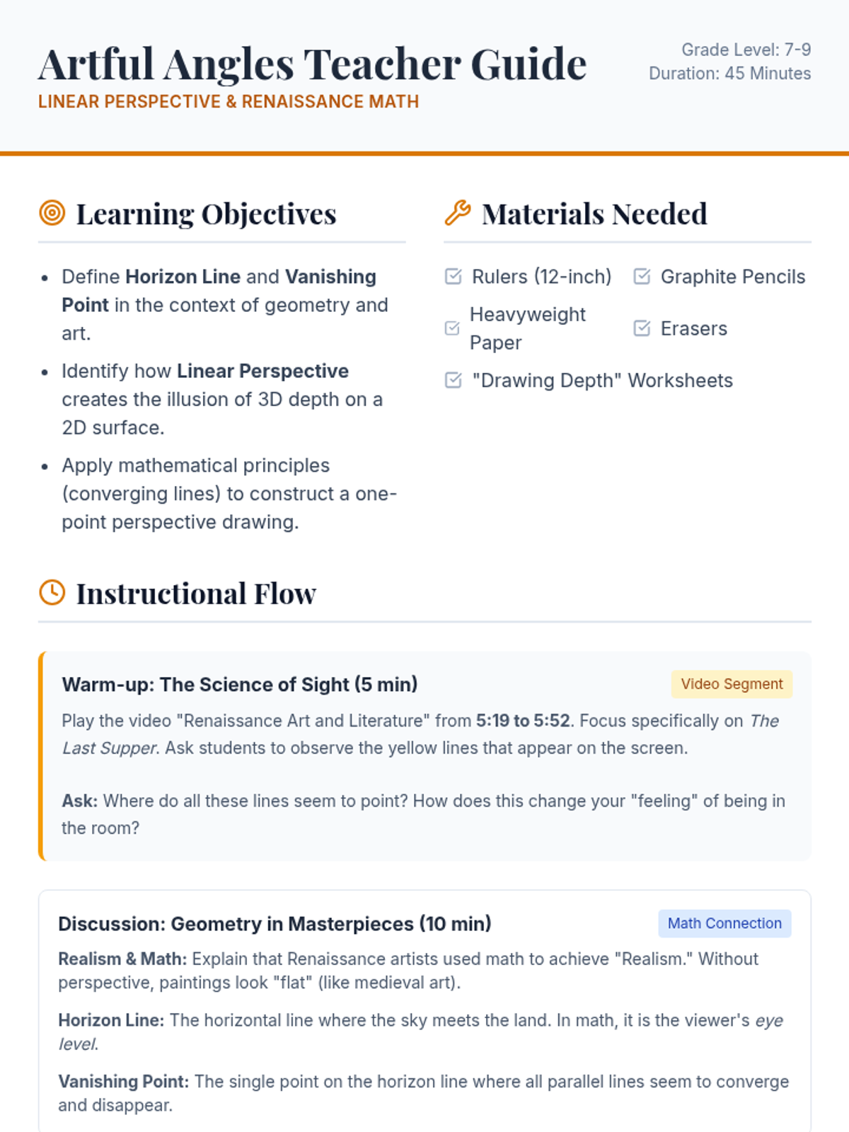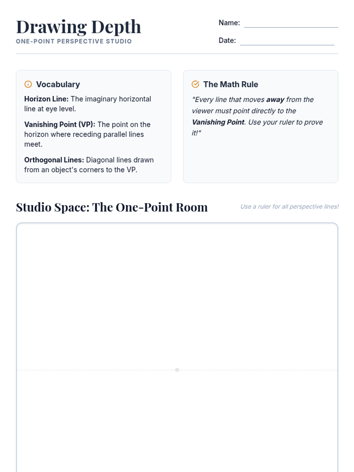 Students explore the intersection of geometry and realism by mastering one-point linear perspective, inspired by Leonardo da Vinci's Renaissance masterpieces.