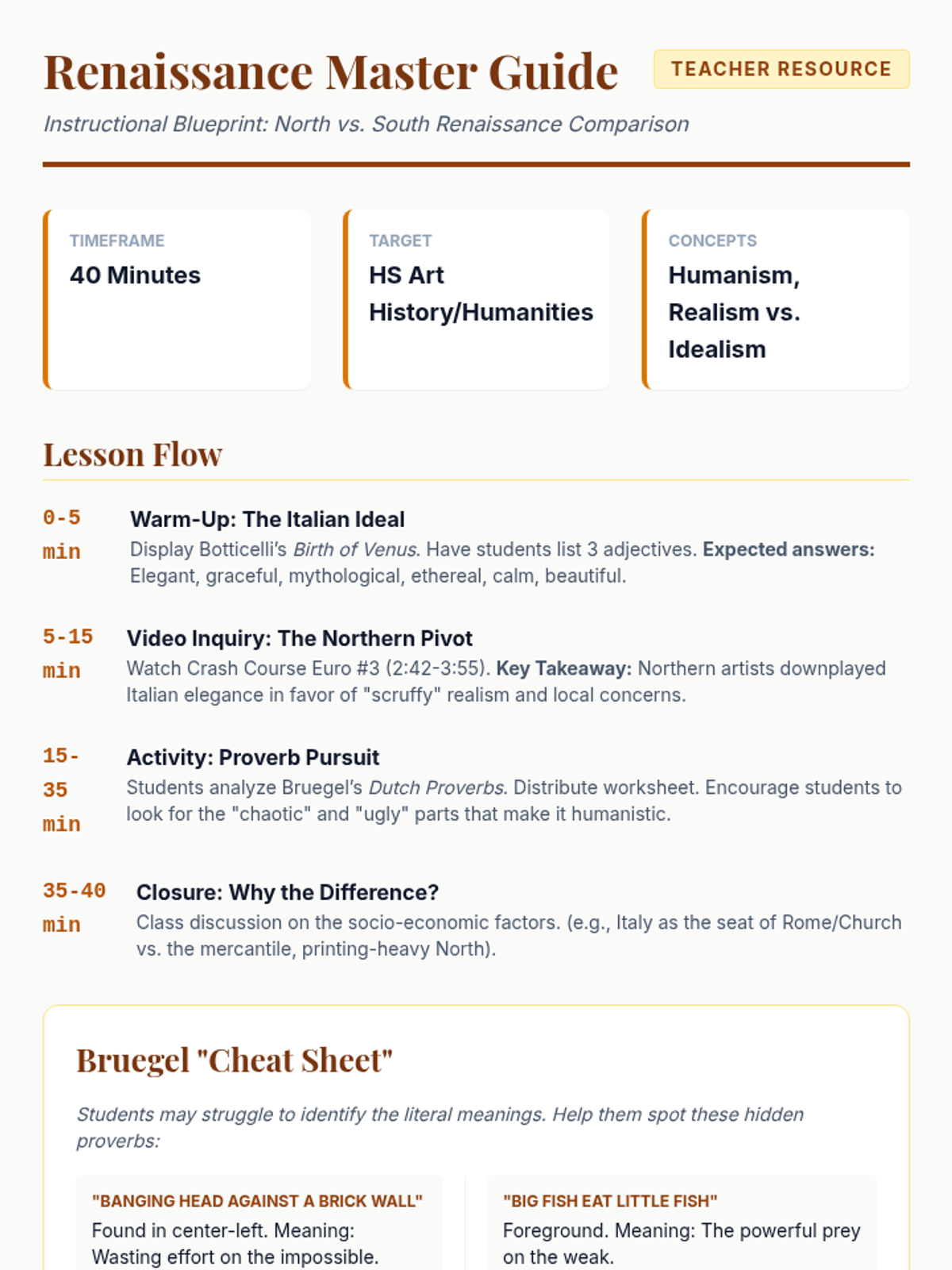 This lesson explores the differences between Italian and Northern Renaissance art through the lens of humanism, focusing on Botticelli's elegance versus Bruegel's gritty realism. Students will watch a video segment and perform a visual analysis of 'Dutch Proverbs' to understand how Northern artists democratized humanistic themes.