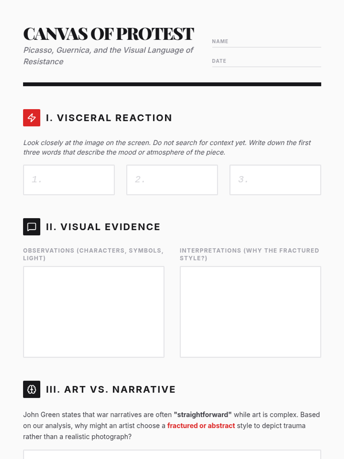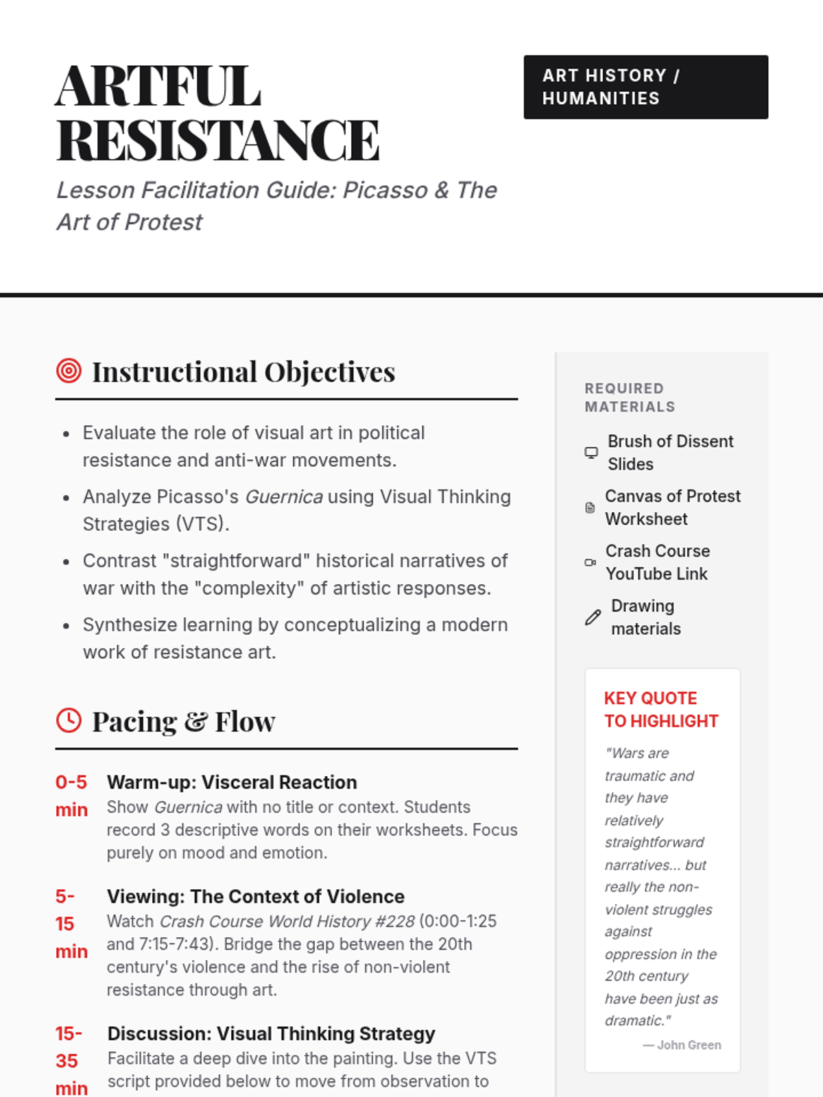 This lesson explores the intersection of art and political activism, specifically focusing on Picasso's *Guernica* as a response to the horrors of the 20th century. Students will analyze the stylistic choices of Cubism in depicting war and create their own conceptual sketches for a modern piece of resistance art.