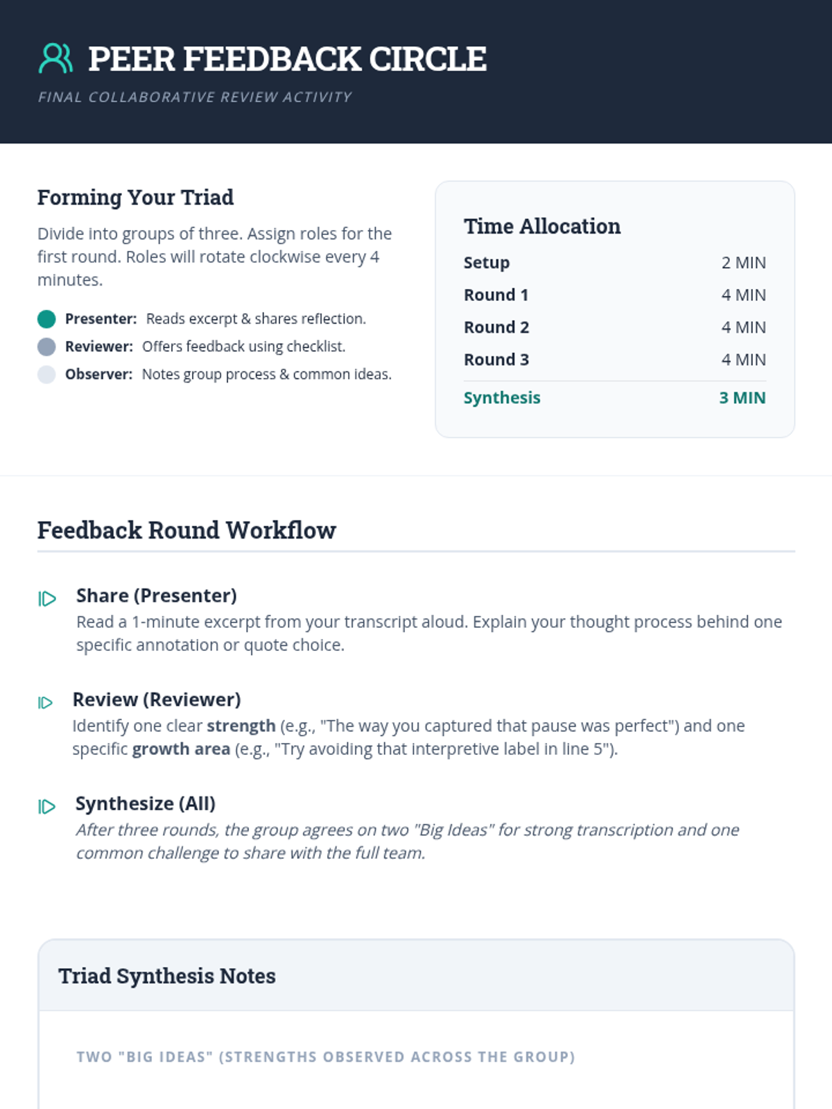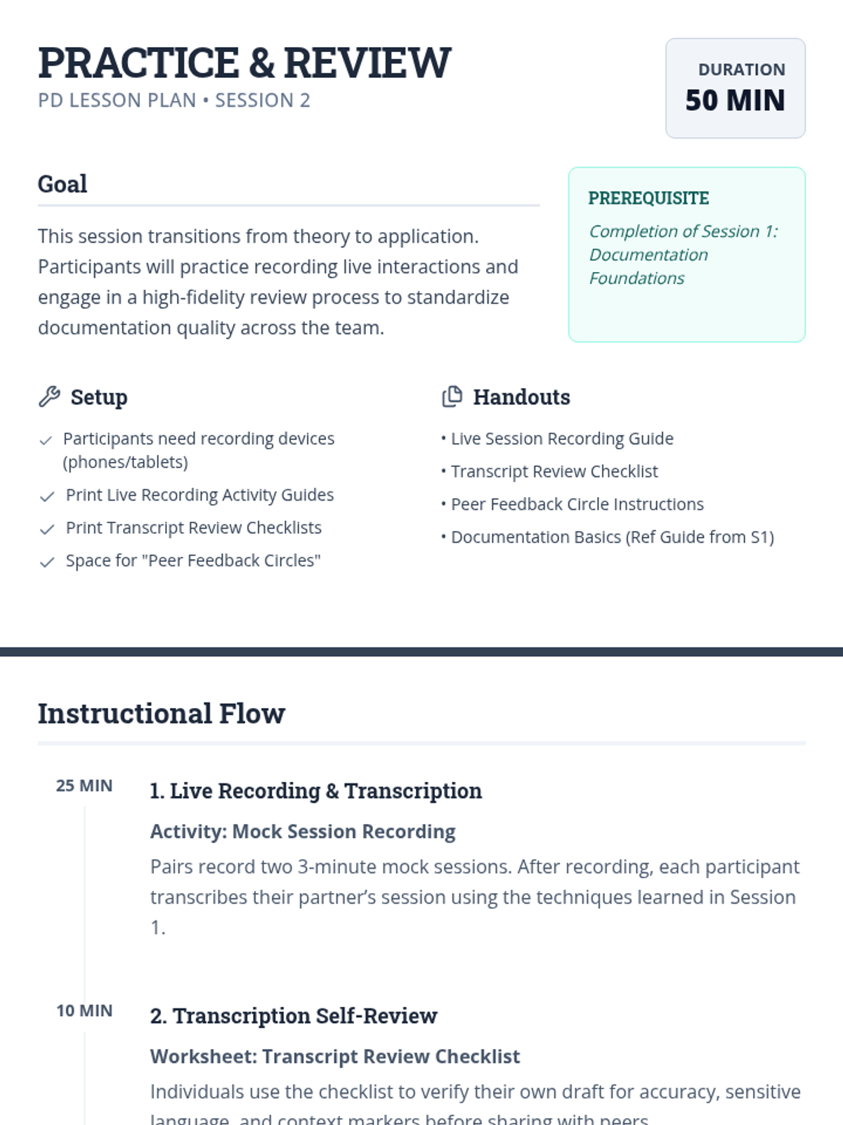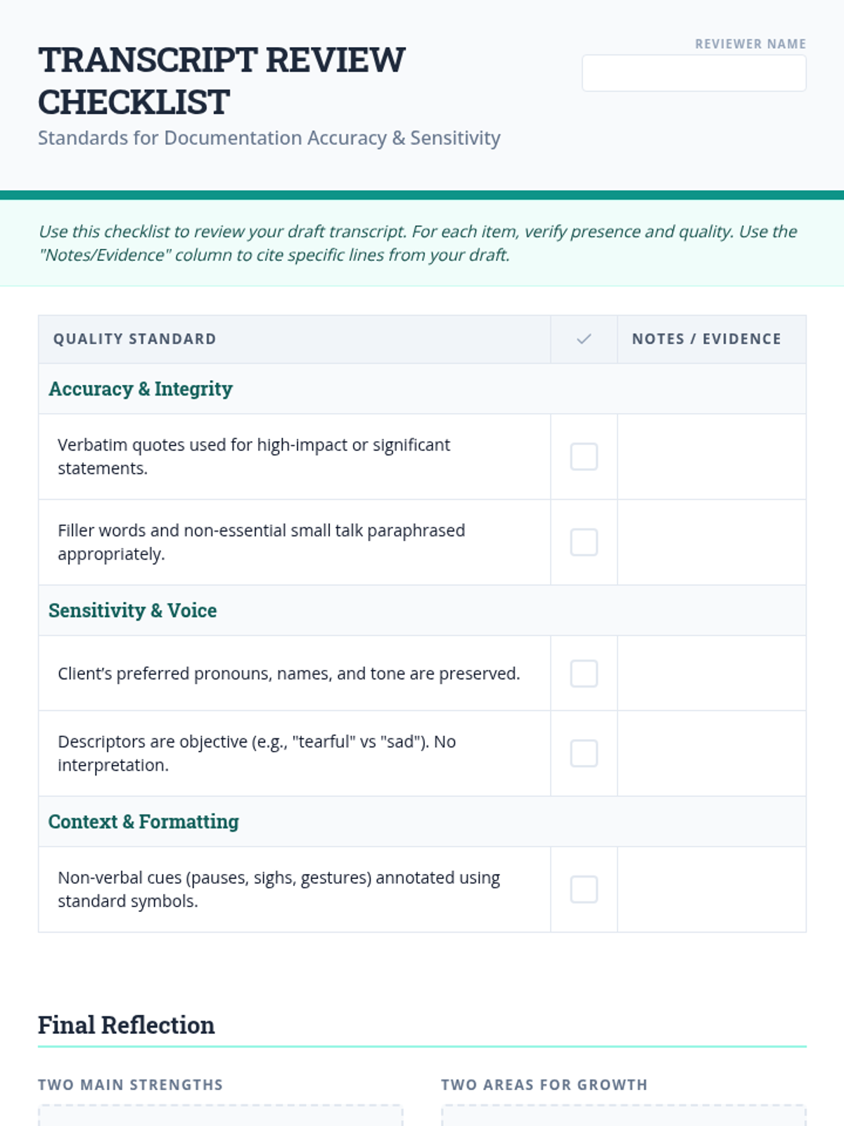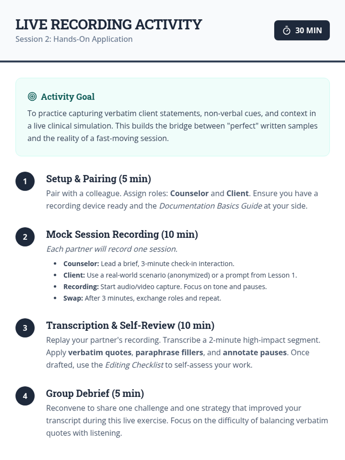 Participants apply their transcription skills to live mock sessions, followed by self-assessment and a collaborative peer review circle to refine documentation accuracy and sensitivity.