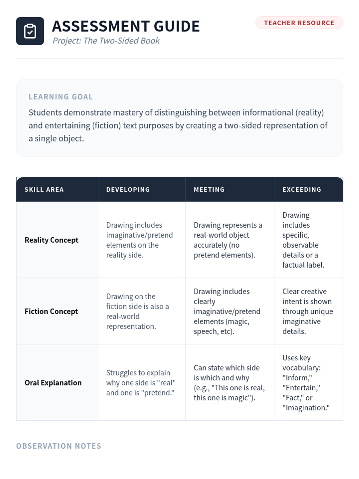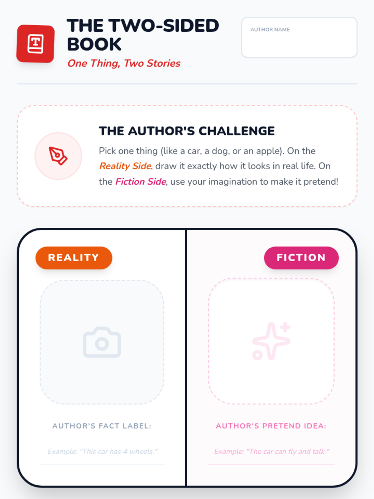 Students create a two-sided mini-book featuring a factual side and a fictional side of the same object to show understanding of intent.