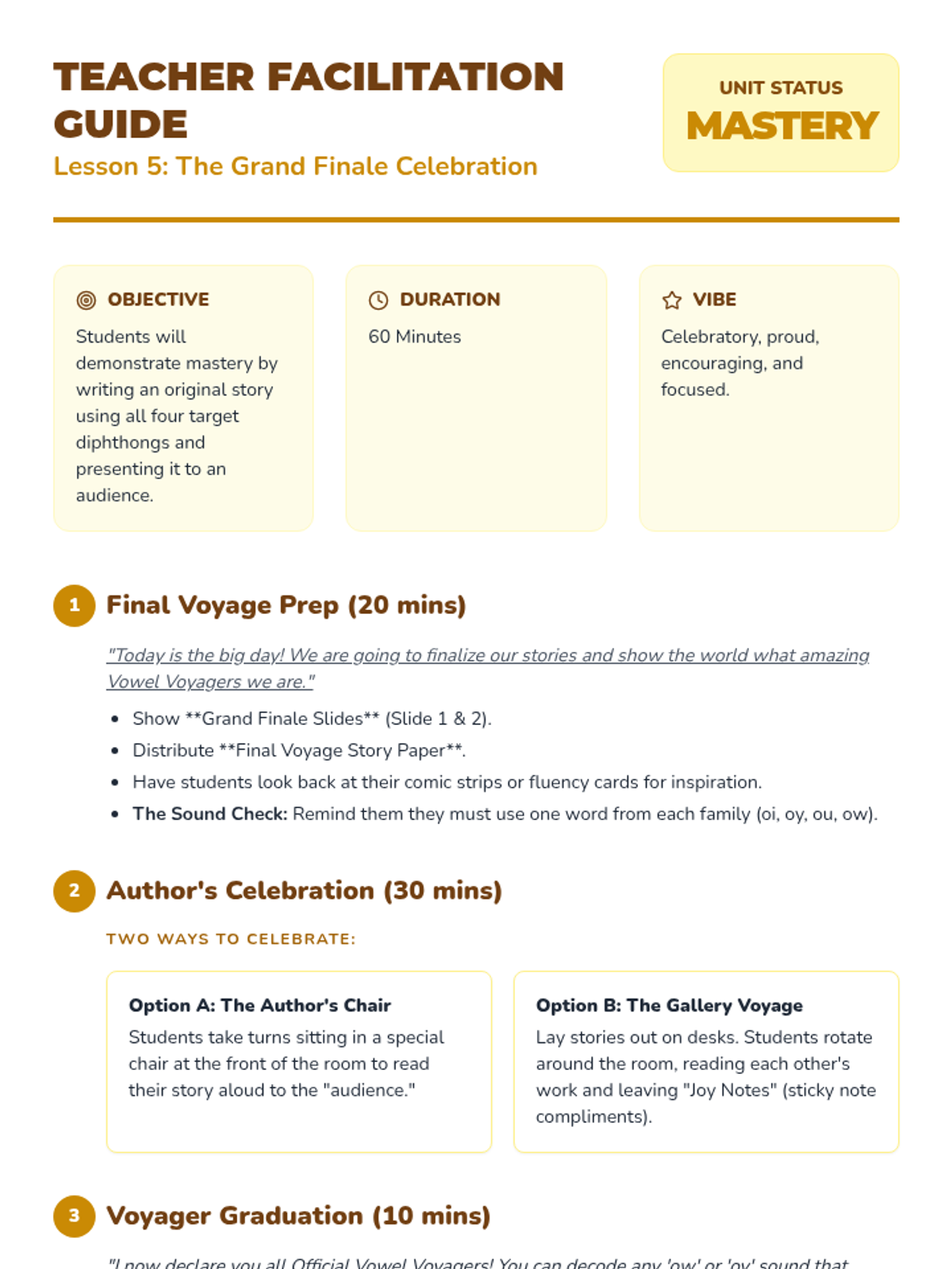 The unit concludes with students finalizing and sharing their original stories, celebrating their mastery of complex vowel sounds.